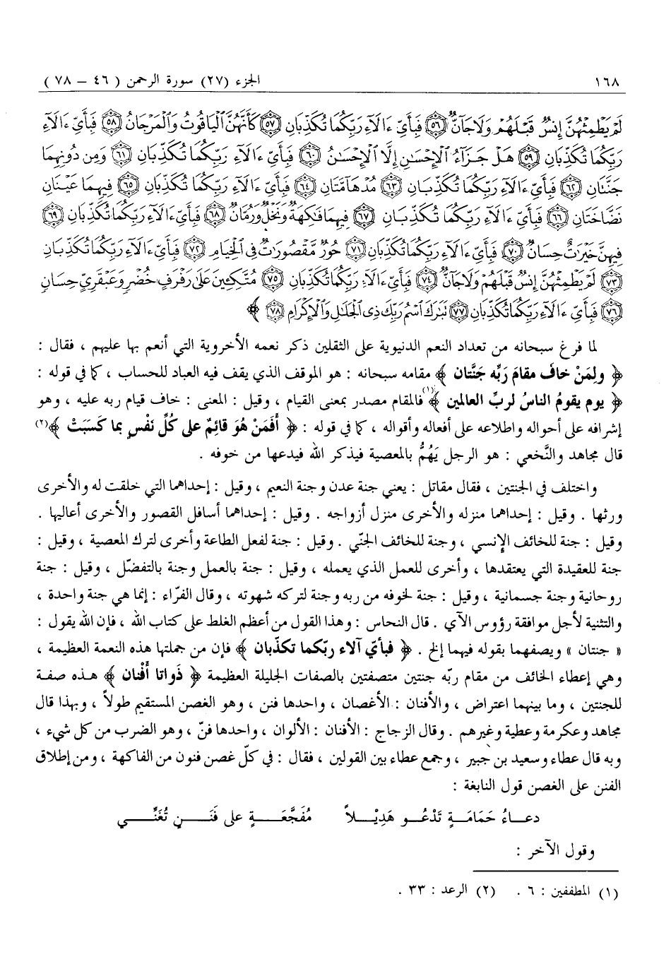 «جَنَّتَانِ» وَيَصِفُهُمَا بِقَوْلِهِ فِيهِمَا إِلَخْ. فَبِأَيِّ آلاءِ رَبِّكُما تُكَذِّبانِ فَإِنَّ مِنْ جُمْلَتِهَا هَذِهِ النِّعْمَةَ الْعَظِيمَةَ، وَهِيَ إِعْطَاءُ الْخَائِفِ مِنْ مَقَامِ رَبِّهِ جَنَّتَيْنِ مُتَّصِفَتَيْنِ بِالصِّفَاتِ الْجَلِيلَةِ الْعَظِيمَةِ ذَواتا أَفْنانٍ هذه صفة للجنتين، وَمَا بَيْنَهُمَا اعْتِرَاضٌ، وَالْأَفْنَانُ: الْأَغْصَانُ، وَاحِدُهَا فَنَنٌ، وَهُوَ الْغُصْنُ الْمُسْتَقِيمُ طُولًا، وَبِهَذَا قَالَ مُجَاهِدٌ وَعِكْرِمَةُ وَعَطِيَّةُ وَغَيْرُهُمْ. وَقَالَ الزَّجَّاجُ: الْأَفْنَانُ: الْأَلْوَانُ، وَاحِدُهَا فَنٌّ، وَهُوَ الضَّرْبُ مِنْ كُلِّ شَيْءٍ، وَبِهِ قَالَ عَطَاءٌ وَسَعِيدُ بْنُ جُبَيْرٍ، وَجَمَعَ عَطَاءٌ بَيْنَ الْقَوْلَيْنِ، فَقَالَ: فِي كُلِّ غُصْنِ فُنُونٌ مِنَ الْفَاكِهَةِ، وَمِنْ إِطْلَاقِ الْفَنَنِ عَلَى الْغُصْنِ قَوْلُ النَّابِغَةِ: