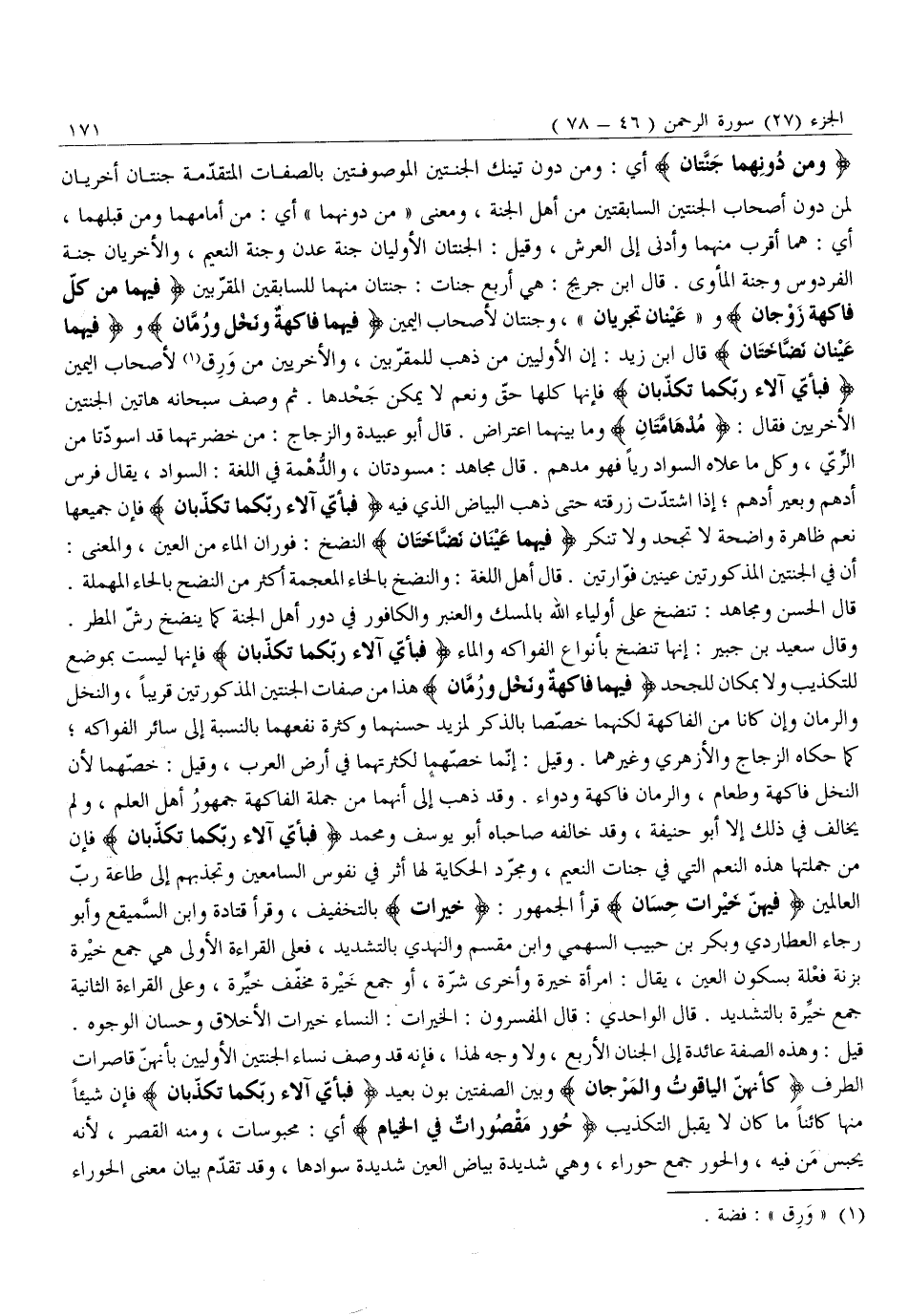 وَقَالَ سَعِيدُ بْنُ جُبَيْرٍ: إِنَّهَا تَنْضَخُ بِأَنْوَاعِ الْفَوَاكِهِ وَالْمَاءِ فَبِأَيِّ آلاءِ رَبِّكُما تُكَذِّبانِ فَإِنَّهَا لَيْسَتْ بِمَوْضِعٍ لِلتَّكْذِيبِ وَلَا بِمَكَانٍ لِلْجَحْدِ فِيهِما فاكِهَةٌ وَنَخْلٌ وَرُمَّانٌ هَذَا مِنْ صِفَاتِ الْجَنَّتَيْنِ الْمَذْكُورَتَيْنِ قَرِيبًا، وَالنَّخْلُ وَالرُّمَّانُ وَإِنْ كَانَا مِنَ الْفَاكِهَةِ لَكِنَّهُمَا خُصِّصَا بِالذِّكْرِ لِمَزِيدِ حُسْنِهِمَا وَكَثْرَةِ نَفْعِهِمَا بِالنِّسْبَةِ إِلَى سَائِرِ الْفَوَاكِهِ كَمَا حكاه الزجاج والأزهري وغير هما. وَقِيلَ: إِنَّمَا خَصَّهُمَا لِكَثْرَتِهِمَا فِي أَرْضِ الْعَرَبِ، وَقِيلَ: خَصَّهُمَا لِأَنَّ النَّخْلَ فَاكِهَةٌ وَطَعَامٌ، وَالرُّمَّانُ فَاكِهَةٌ وَدَوَاءٌ. وَقَدْ ذَهَبَ إِلَى أَنَّهُمَا مِنْ جُمْلَةِ الْفَاكِهَةِ جُمْهُورُ أَهْلِ الْعِلْمِ، وَلَمْ يُخَالِفْ فِي ذَلِكَ إِلَّا أَبُو حَنِيفَةَ، وَقَدْ خَالَفَهُ صَاحِبَاهُ أَبُو يُوسُفَ وَمُحَمَّدٌ فَبِأَيِّ آلاءِ رَبِّكُما تُكَذِّبانِ فَإِنَّ مِنْ جُمْلَتِهَا هَذِهِ النِّعَمَ الَّتِي فِي جَنَّاتِ النَّعِيمِ، وَمُجَرَّدُ الْحِكَايَةِ لَهَا أَثَرٌ فِي نُفُوسِ السَّامِعِينَ وَتَجْذِبُهُمْ إِلَى طَاعَةِ رَبِّ الْعَالَمِينَ فِيهِنَّ خَيْراتٌ حِسانٌ قَرَأَ الْجُمْهُورُ: خَيْراتٌ بالتخفيف، وقرأ قتادة وابن السّميقع وَأَبُو رَجَاءٍ العُطَارِدِيُّ وَبَكْرُ بْنُ حَبِيبٍ السَّهْمِيُّ وَابْنُ مِقْسَمٍ وَالنَّهْدِيُّ بِالتَّشْدِيدِ، فَعَلَى الْقِرَاءَةِ الْأَوْلَى هِيَ جَمْعُ خَيْرَةٍ بِزِنَةِ فَعْلَةٍ بِسُكُونِ الْعَيْنِ، يُقَالُ: امْرَأَةٌ خَيْرَةٌ وَأُخْرَى شَرَّةٌ، أَوْ جَمْعُ خَيْرَةٍ مُخَفَّفُ خَيِّرَةٍ، وَعَلَى الْقِرَاءَةِ الثَّانِيَةِ جَمْعُ خَيِّرَةٍ بِالتَّشْدِيدِ. قَالَ الْوَاحِدِيُّ: قَالَ الْمُفَسِّرُونَ: الْخَيِّرَاتُ: النساء خيرات الأخلاق وحسان الْوُجُوهِ.