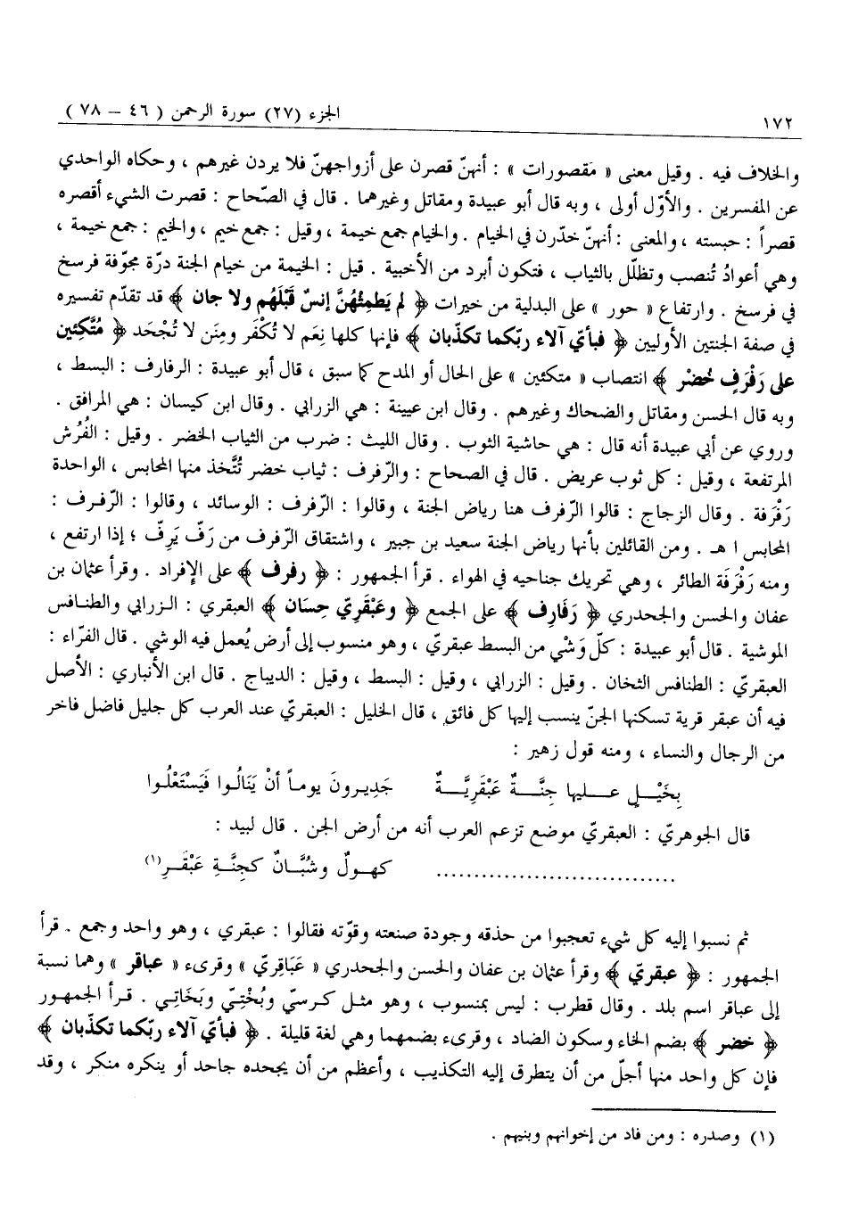 ثُمَّ نَسَبُوا إِلَيْهِ كُلَّ شَيْءٍ تَعَجَّبُوا مِنْ حِذْقِهِ وَجَوْدَةِ صَنْعَتِهِ وَقُوَّتِهِ فَقَالُوا: عَبْقَرِيٌّ، وَهُوَ وَاحِدٌ وَجَمْعٌ. قَرَأَ الْجُمْهُورُ: عَبْقَرِيٍّ وَقَرَأَ عُثْمَانُ بْنُ عَفَّانَ وَالْحَسَنُ وَالْجَحْدَرِيُّ «عَبَاقِرِيٍّ» وَقُرِئَ «عَبَاقِرَ» وَهُمَا نِسْبَةٌ إِلَى عَبَاقِرَ اسْمِ بَلَدِ. وَقَالَ قُطْرُبٌ: لَيْسَ بِمَنْسُوبٍ، وهو مثل كرسيّ وَبُخْتِيٍّ وَبَخَاتِيٍّ. قَرَأَ الْجُمْهُورُ خُضْرٍ بِضَمِّ الْخَاءِ وَسُكُونِ الضَّادِ، وَقُرِئَ بِضَمِّهِمَا وَهِيَ لُغَةٌ قَلِيلَةٌ. فَبِأَيِّ آلاءِ رَبِّكُما تُكَذِّبانِ فَإِنَّ كُلَّ وَاحِدٍ مِنْهَا أَجَلُّ مَنْ أَنْ يَتَطَرَّقَ إِلَيْهِ التَّكْذِيبُ، وَأَعْظَمُ مِنْ أَنْ يَجْحَدَهُ جَاحِدٌ أَوْ يُنْكِرَهُ منكر، وقد