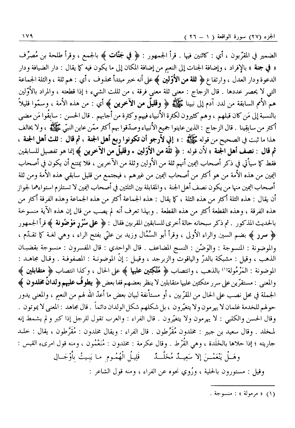 الضَّمِيرِ فِي الْمُقَرَّبُونَ، أَيْ: كَائِنِينَ فِيهَا. قَرَأَ الْجُمْهُورُ: فِي جَنَّاتِ بِالْجَمْعِ، وَقَرَأَ طَلْحَةُ بْنُ مُصَرِّفٍ «فِي جَنَّةِ» بِالْإِفْرَادِ، وَإِضَافَةُ الْجَنَّاتِ إِلَى النَّعِيمِ مِنْ إِضَافَةِ الْمَكَانِ إِلَى مَا يَكُونُ فِيهِ كَمَا يُقَالُ: دَارُ الضِّيَافَةِ وَدَارُ الدَّعْوَةِ وَدَارُ الْعَدْلِ، وَارْتِفَاعُ ثُلَّةٌ مِنَ الْأَوَّلِينَ عَلَى أَنَّهُ خَبَرُ مُبْتَدَأٍ مَحْذُوفٍ، أَيْ: هُمْ ثُلَّةٌ، وَالثُّلَّةُ الْجَمَاعَةُ الَّتِي لَا يُحْصَرُ عَدَدُهَا. قَالَ الزَّجَّاجُ: مَعْنَى ثُلَّةٍ مَعْنَى فِرْقَةٍ، مِنْ ثَلَلْتُ الشَّيْءَ إِذَا قَطَعْتَهُ، وَالْمُرَادُ بِالْأَوَّلِينَ هُمُ الْأُمَمُ السَّابِقَةُ مِنْ لَدُنْ آدَمَ إِلَى نَبِيِّنَا صَلَّى اللَّهُ عَلَيْهِ وَسَلَّمَ وَقَلِيلٌ مِنَ الْآخِرِينَ أَيْ: مِنْ هَذِهِ الْأُمَّةِ، وَسُمُّوا قَلِيلًا بِالنِّسْبَةِ إِلَى مَنْ كَانَ قَبْلَهُمْ، وَهُمْ كَثِيرُونَ لِكَثْرَةِ الْأَنْبِيَاءِ فيهم وكثرة من أجابهم. قال الحسن: سابقوا مَنْ مَضَى أَكْثَرُ مِنْ سَابِقِينَا. قَالَ الزَّجَّاجُ: الَّذِينَ عَايَنُوا جَمِيعَ الْأَنْبِيَاءِ وَصَدَّقُوا بِهِمْ أَكْثَرُ مِمَّنْ عَايَنَ النَّبِيَّ صَلَّى اللَّهُ عَلَيْهِ وَسَلَّمَ، وَلَا يُخَالِفُ هَذَا مَا ثَبَتَ فِي الصَّحِيحِ مِنْ قَوْلِهِ صَلَّى اللَّهُ عَلَيْهِ وَسَلَّمَ: «إِنِّي لِأَرْجُوَ أَنْ تَكُونُوا رُبُعَ أَهْلِ الْجَنَّةِ. ثُمَّ قَالَ: ثُلُثَ أَهْلِ الْجَنَّةِ، ثُمَّ قَالَ: نِصْفَ أَهْلِ الْجَنَّةِ» لِأَنَّ قَوْلَهُ: ثُلَّةٌ مِنَ الْأَوَّلِينَ وَقَلِيلٌ مِنَ الْآخِرِينَ إنما هو تفصيل لِلسَّابِقِينَ فَقَطْ كَمَا سَيَأْتِي فِي ذِكْرِ أَصْحَابِ الْيَمِينِ أَنَّهُمْ ثُلَّةٌ مِنَ الْأَوَّلِينَ وَثُلَّةٌ مِنَ الْآخِرِينَ، فَلَا يَمْتَنِعُ أَنْ يَكُونَ فِي أَصْحَابِ الْيَمِينِ مِنْ هَذِهِ الْأُمَّةِ مَنْ هُوَ أَكْثَرُ مِنْ أَصْحَابِ الْيَمِينِ مِنْ غَيْرِهِمْ، فَيَجْتَمِعُ مِنْ قَلِيلِ سَابِقِي هَذِهِ الْأُمَّةِ وَمِنْ ثُلَّةِ أَصْحَابِ الْيَمِينِ مِنْهَا مَنْ يَكُونُ نِصْفَ أَهْلِ الْجَنَّةِ، والمقابلة بين الثلثين فِي أَصْحَابِ الْيَمِينِ لَا تَسْتَلْزِمُ اسْتِوَاءَهُمَا لِجَوَازِ أَنْ يُقَالَ: هَذِهِ الثُّلَّةُ أَكْثَرُ مِنْ هَذِهِ الثُّلَّةِ، كَمَا يُقَالُ: هَذِهِ الْجَمَاعَةُ أَكْثَرُ مِنْ هَذِهِ الْجَمَاعَةِ وَهَذِهِ الْفِرْقَةُ أَكْثَرُ مِنْ هَذِهِ الْفِرْقَةِ، وَهَذِهِ الْقِطْعَةُ أَكْثَرُ مِنْ هَذِهِ الْقِطْعَةِ. وَبِهَذَا تَعْرِفُ أَنَّهُ لَمْ يُصِبْ مَنْ قَالَ إِنَّ هَذِهِ الْآيَةَ مَنْسُوخَةٌ بِالْحَدِيثِ الْمَذْكُورِ. ثُمَّ ذَكَرَ سُبْحَانَهُ حَالَةً أُخْرَى لِلسَّابِقِينَ الْمُقَرَّبِينَ فَقَالَ: عَلى سُرُرٍ مَوْضُونَةٍ قَرَأَ الْجُمْهُورُ سُرُرٍ بِضَمِّ السين والراء الأولى، وقرأ أبو السّمّال وَزَيْدُ بْنُ عَلِيٍّ بِفَتْحِ الرَّاءِ، وَهِيَ لُغَةٌ كَمَا تَقَدَّمَ، وَالْمَوْضُونَةُ: الْمَنْسُوجَةُ: وَالْوَضْنُ: النَّسْجُ الْمُضَاعَفُ. قَالَ الْوَاحِدِيُّ: قَالَ الْمُفَسِّرُونَ: مَنْسُوجَةٌ بِقُضْبَانِ الذَّهَبِ، وَقِيلَ: مُشَبَّكَةٌ بِالدُّرِّ وَالْيَاقُوتِ وَالزَّبَرْجَدِ، وَقِيلَ: إِنَّ الْمَوْضُونَةَ: الْمَصْفُوفَةَ. وَقَالَ مُجَاهِدٌ: