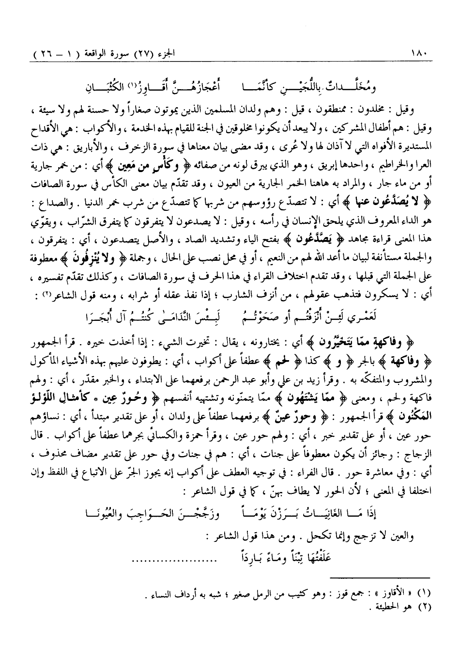وَقِيلَ: مخلدون: منطقون، قِيلَ: وَهُمْ وِلْدَانُ الْمُسْلِمِينَ الَّذِينَ يَمُوتُونَ صِغَارًا وَلَا حَسَنَةَ لَهُمْ وَلَا سَيِّئَةَ، وَقِيلَ: هُمْ أَطْفَالُ الْمُشْرِكِينَ، وَلَا يَبْعُدُ أَنْ يَكُونُوا مَخْلُوقِينَ فِي الْجَنَّةِ لِلْقِيَامِ بِهَذِهِ الْخِدْمَةِ، وَالْأَكْوَابُ: هِيَ الْأَقْدَاحُ الْمُسْتَدِيرَةُ الْأَفْوَاهِ الَّتِي لَا آذَانَ لَهَا وَلَا عُرًى، وَقَدْ مَضَى بَيَانُ مَعْنَاهَا فِي سورة الزخرف، والأباريق: هي ذات العرا وَالْخَرَاطِيمِ، وَاحِدُهَا إِبْرِيقٌ، وَهُوَ الَّذِي يَبْرُقُ لَوْنُهُ مِنْ صَفَائِهِ وَكَأْسٍ مِنْ مَعِينٍ أَيْ: مِنْ خمر جارية أو من مَاءٍ جَارٍ، وَالْمُرَادُ بِهِ هَاهُنَا الْخَمْرُ الْجَارِيَةُ مِنَ الْعُيُونِ، وَقَدْ تَقَدَّمَ بَيَانُ مَعْنَى الْكَأْسِ فِي سُورَةِ الصَّافَّاتِ لَا يُصَدَّعُونَ عَنْها أَيْ: لَا تَتَصَدَّعُ رُؤُوسُهُمْ مِنْ شُرْبِهَا كَمَا تَتَصَدَّعُ مِنْ شُرْبِ خَمْرِ الدُّنْيَا. وَالصُّدَاعُ: