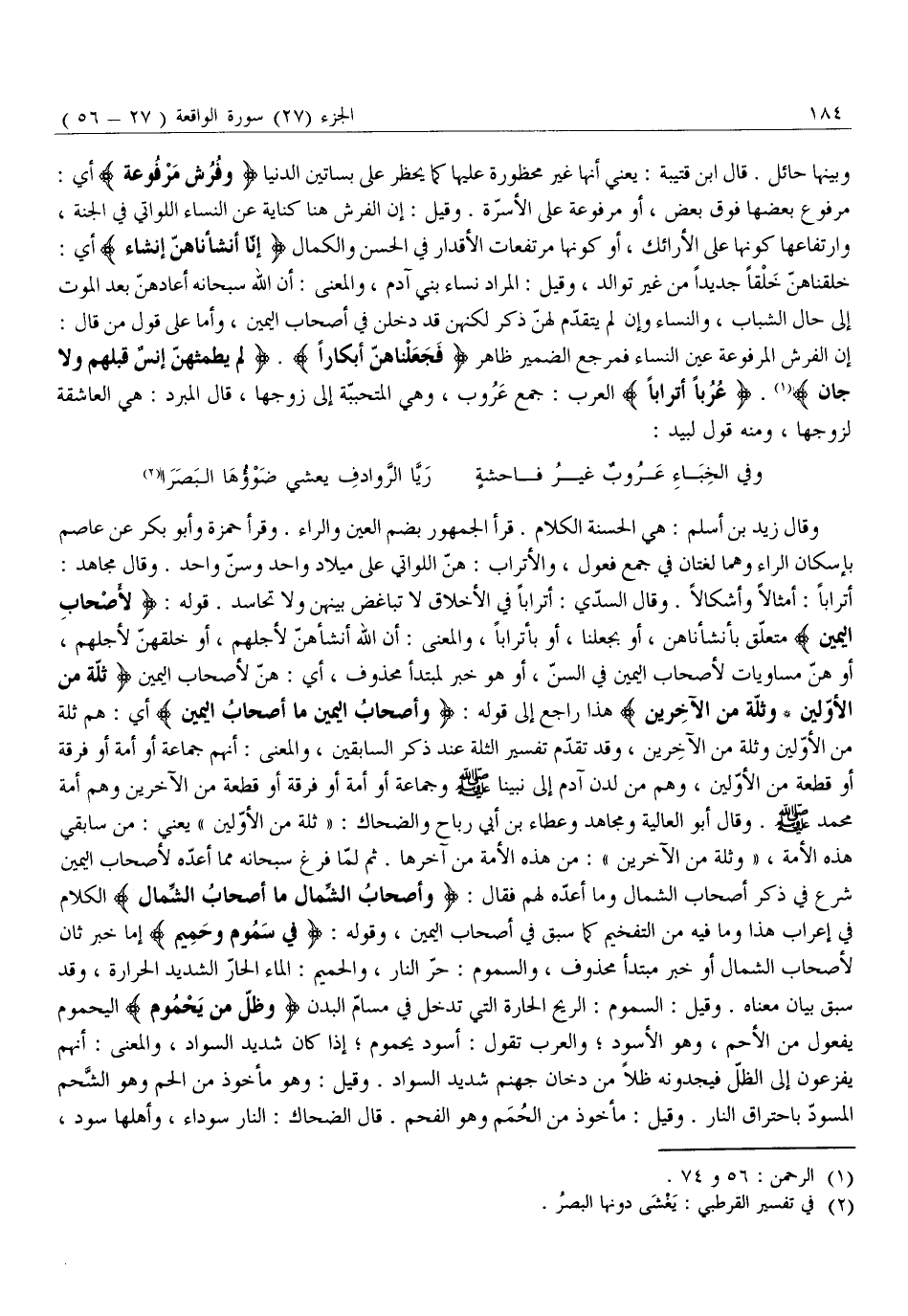 إِنَّ الْفُرُشَ الْمَرْفُوعَةَ عَيْنُ النِّسَاءِ فَمَرْجِعُ الضَّمِيرِ ظَاهِرٌ فَجَعَلْناهُنَّ أَبْكاراً. لَمْ يَطْمِثْهُنَّ إِنْسٌ قَبْلَهُمْ وَلا جَانٌّ «1» . عُرُباً أَتْراباً الْعُرُبُ: جَمْعُ عَرُوبٍ، وَهِيَ الْمُتَحَبِّبَةُ إِلَى زَوْجِهَا، قَالَ الْمُبَرِّدُ: هِيَ الْعَاشِقَةُ لِزَوْجِهَا، وَمِنْهُ قَوْلُ لَبِيَدٍ: