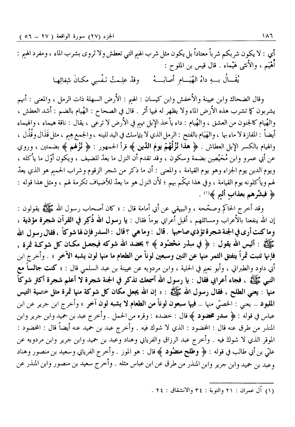 إِنَّ اللَّهَ يَنْفَعُنَا بِالْأَعْرَابِ وَمَسَائِلِهِمْ، أَقْبَلَ أَعْرَابِيٌّ يَوْمًا فَقَالَ: يَا رَسُولَ اللَّهِ ذُكِرَ فِي الْقُرْآنِ شَجَرَةٌ مُؤْذِيَةٌ، وَمَا كُنْتُ أَرَى فِي الْجَنَّةِ شَجَرَةً تُؤْذِي صَاحِبَهَا. قَالَ: وَمَا هِيَ؟ قَالَ: السِّدْرُ فَإِنَّ لَهَا شَوْكًا، فَقَالَ رَسُولُ اللَّهِ صَلَّى اللَّهُ عَلَيْهِ وَسَلَّمَ: أَلَيْسَ اللَّهُ يَقُولُ: فِي سِدْرٍ مَخْضُودٍ؟ يخضد اللَّهُ شَوْكَهُ فَيَجْعَلُ مَكَانَ كُلِّ شَوْكَةٍ ثَمَرَةً، فَإِنَّهَا تُنْبِتُ ثَمَرًا يَتَفَتَّقُ الثَّمَرُ مِنْهَا عَنِ اثْنَيْنِ وَسَبْعِينَ لَوْنًا مِنَ الطَّعَامِ مَا مِنْهَا لَوْنٌ يُشْبِهُ الْآخَرَ» . وَأَخْرَجَ ابْنُ أَبِي دَاوُدَ وَالطَّبَرَانِيُّ، وَأَبُو نُعَيْمٍ فِي الْحِلْيَةِ، وَابْنُ مَرْدَوَيْهِ عَنْ عُيَيْنَةَ بْنِ عَبْدٍ السُّلَمِيِّ قَالَ: «كُنْتُ جَالِسًا مَعَ النَّبِيِّ صَلَّى اللَّهُ عَلَيْهِ وَسَلَّمَ، فجاء أعرابي فقال: يا رسول الله أَسْمَعُكَ تَذْكُرُ فِي الْجَنَّةِ شَجَرَةً لَا أَعْلَمُ شَجَرَةً أَكْثَرَ شَوْكًا مِنْهَا: يَعْنِي الطَّلْحَ، فَقَالَ رَسُولُ اللَّهِ صَلَّى اللَّهُ عَلَيْهِ وَسَلَّمَ: «إن اللَّهَ يَجْعَلُ مَكَانَ كُلِّ شَوْكَةٍ مِنْهَا ثَمَرَةً مِثْلَ خُصْيَةِ التَّيْسِ الْمَلْبُودِ- يَعْنِي: الْخَصِيَّ مِنْهَا- فِيهَا سَبْعُونَ لَوْنًا مِنَ الطَّعَامِ لَا يُشْبِهُ لَوْنٌ آخَرَ» وَأَخْرَجَ ابْنُ جَرِيرٍ عَنِ ابْنِ عَبَّاسٍ فِي قَوْلِهِ: سِدْرٍ مَخْضُودٍ قَالَ: خَضَدَهُ: وَقَّرَهُ مِنَ الْحَمْلِ. وَأَخْرَجَ عَبْدُ بْنُ حُمَيْدٍ وَابْنُ جَرِيرٍ وَابْنُ الْمُنْذِرِ مِنْ طُرُقٍ عَنْهُ قَالَ: الْمَخْضُودُ: الَّذِي لَا شَوْكَ فِيهِ. وَأَخْرَجَ عَبْدُ بْنُ حُمَيْدٍ عَنْهُ أَيْضًا قَالَ: الْمَخْضُودُ: