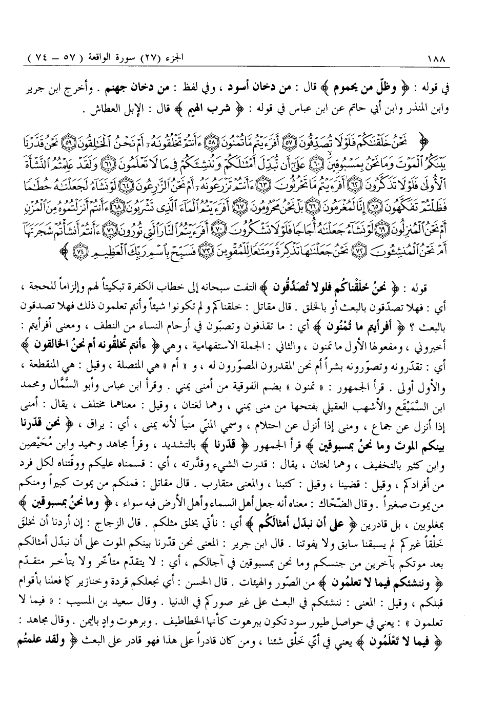 قَوْلُهُ: نَحْنُ خَلَقْناكُمْ فَلَوْلا تُصَدِّقُونَ الْتَفَتَ سُبْحَانَهُ إِلَى خِطَابِ الْكَفَرَةِ تَبْكِيتًا لَهُمْ وَإِلْزَامًا لِلْحُجَّةِ، أَيْ: فَهَلَّا تُصَدِّقُونَ بِالْبَعْثِ أَوْ بِالْخَلْقِ. قَالَ مُقَاتِلٌ: خَلَقْنَاكُمْ وَلَمْ تَكُونُوا شَيْئًا وَأَنْتُمْ تَعْلَمُونَ ذَلِكَ فَهَلَّا تُصَدِّقُونَ بِالْبَعْثِ؟ أَفَرَأَيْتُمْ مَا تُمْنُونَ أَيْ: مَا تَقْذِفُونَ وَتَصُبُّونَ فِي أَرْحَامِ النِّسَاءِ مِنَ النُّطَفِ، وَمَعْنَى أَفَرَأَيْتُمْ: