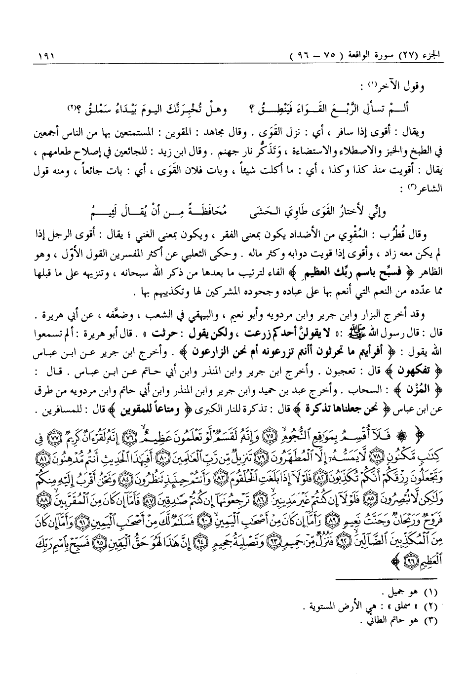 وَقَالَ قُطْرُبٌ: المقوي مِنَ الْأَضْدَادِ يَكُونُ بِمَعْنَى الْفَقْرِ، وَيَكُونُ بِمَعْنَى الْغِنَى يُقَالُ: أَقْوَى الرَّجُلُ إِذَا لَمْ يَكُنْ مَعَهُ زَادٌ، وَأَقْوَى إِذَا قَوِيَتْ دَوَابُّهُ وَكَثُرَ مَالُهُ. وَحَكَى الثَّعْلَبِيُّ عَنْ أَكْثَرِ الْمُفَسِّرِينَ الْقَوْلَ الْأَوَّلَ، وَهُوَ الظَّاهِرُ فَسَبِّحْ بِاسْمِ رَبِّكَ الْعَظِيمِ الْفَاءُ لِتَرْتِيبِ مَا بَعْدَهَا مِنْ ذِكْرِ اللَّهِ سبحانه، وتنزيه عَلَى مَا قَبْلَهَا مِمَّا عَدَّدَهُ مِنَ النِّعَمِ الَّتِي أَنْعَمَ بِهَا عَلَى عِبَادِهِ وجحوده الْمُشْرِكِينَ لَهَا وَتَكْذِيبِهِمْ بِهَا.