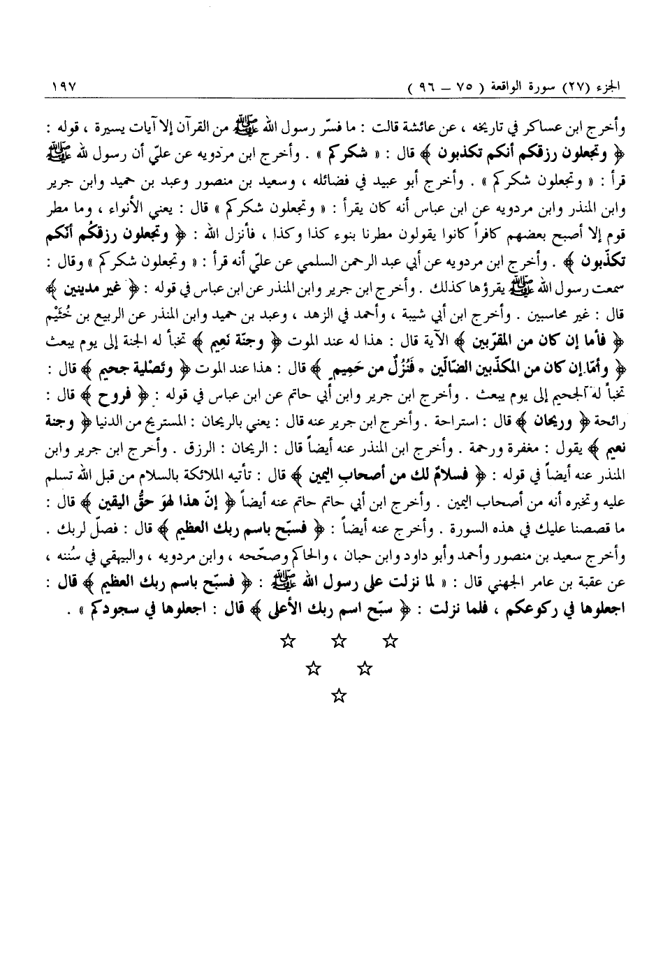 رَائِحَةٌ وَرَيْحانٌ قَالَ: اسْتِرَاحَةٌ. وَأَخْرَجَ ابْنُ جَرِيرٍ عَنْهُ قَالَ: يَعْنِي بِالرَّيْحَانِ: الْمُسْتَرِيحَ مِنَ الدُّنْيَا وَجَنَّةُ نَعِيمٍ يَقُولُ: مَغْفِرَةٌ وَرَحْمَةٌ. وَأَخْرَجَ ابْنُ الْمُنْذِرِ عَنْهُ أَيْضًا قَالَ: الرَّيْحَانُ: الرِّزْقُ. وَأَخْرَجَ ابْنُ جَرِيرٍ وَابْنُ الْمُنْذِرِ عَنْهُ أَيْضًا فِي قَوْلِهِ: فَسَلامٌ لَكَ مِنْ أَصْحابِ الْيَمِينِ قَالَ: تَأْتِيهِ الْمَلَائِكَةُ بِالسَّلَامِ مِنْ قِبَلِ اللَّهِ تُسَلِّمُ عَلَيْهِ وَتُخْبِرُهُ أَنَّهُ مِنْ أَصْحَابِ الْيَمِينِ. وَأَخْرَجَ ابْنُ أبي حاتم حَاتِمٍ عَنْهُ أَيْضًا إِنَّ هَذَا لَهُوَ حَقُّ الْيَقِينِ قَالَ: