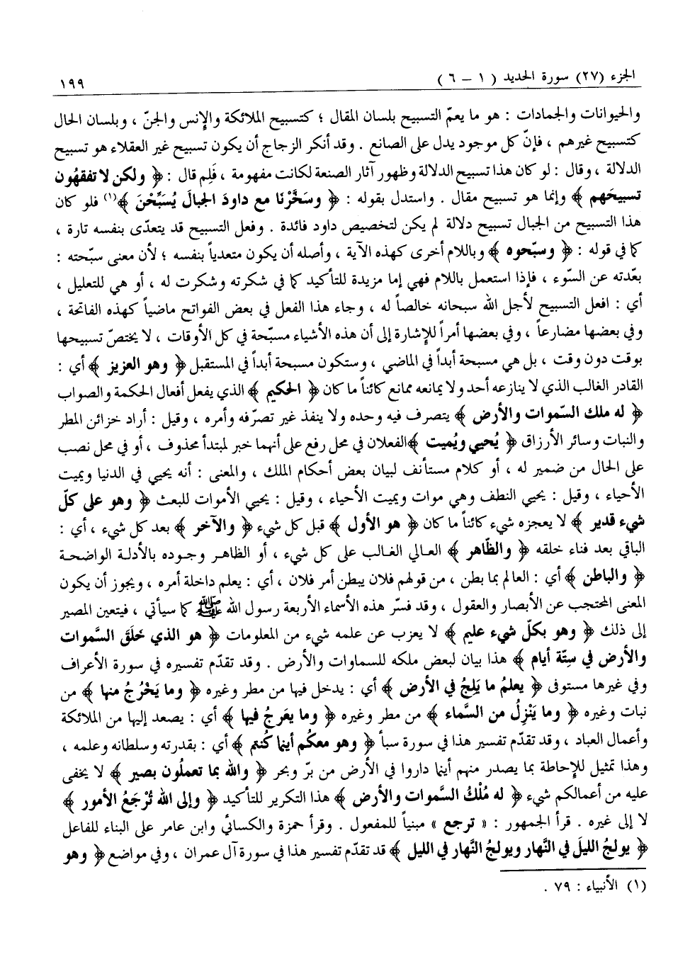 بَعَّدْتُهُ عَنِ السُّوءِ، فَإِذَا اسْتُعْمِلَ بِاللَّامِ فَهِيَ إِمَّا مَزِيدَةٌ لِلتَّأْكِيدِ كَمَا فِي شَكَرْتُهُ وَشَكَرْتُ لَهُ، أَوْ هِيَ لِلتَّعْلِيلِ، أَيِ: افْعَلِ التَّسْبِيحَ لِأَجْلِ اللَّهِ سُبْحَانَهُ خَالِصًا لَهُ، وَجَاءَ هَذَا الْفِعْلُ فِي بَعْضِ الْفَوَاتِحِ مَاضِيًا كَهَذِهِ الْفَاتِحَةِ، وَفِي بَعْضِهَا مُضَارِعًا، وَفِي بَعْضِهَا أَمْرًا لِلْإِشَارَةِ إِلَى أَنَّ هَذِهِ الْأَشْيَاءَ مُسَبِّحَةٌ فِي كُلِّ الْأَوْقَاتِ، لَا يَخْتَصُّ تَسْبِيحُهَا بِوَقْتٍ دُونَ وَقْتٍ، بَلْ هِيَ مُسَبِّحَةٌ أَبَدًا فِي الْمَاضِي، وَسَتَكُونُ مُسَبِّحَةً أَبَدًا فِي الْمُسْتَقْبَلِ وَهُوَ الْعَزِيزُ أَيِ: