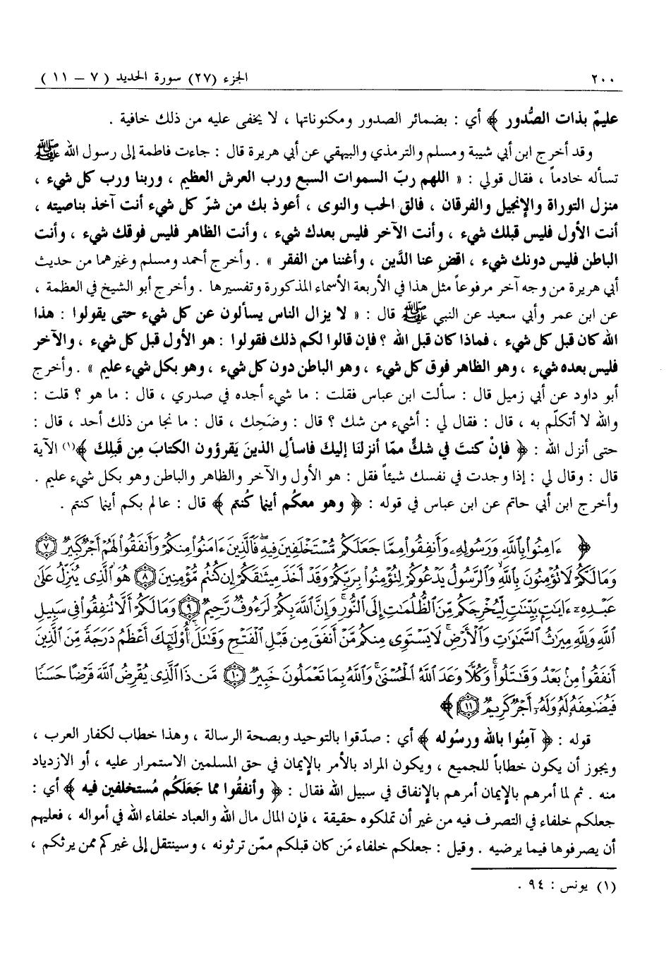 آمِنُوا بِاللَّهِ وَرَسُولِهِ وَأَنْفِقُوا مِمَّا جَعَلَكُمْ مُسْتَخْلَفِينَ فِيهِ فَالَّذِينَ آمَنُوا مِنْكُمْ وَأَنْفَقُوا لَهُمْ أَجْرٌ كَبِيرٌ (7) وَما لَكُمْ لَا تُؤْمِنُونَ بِاللَّهِ وَالرَّسُولُ يَدْعُوكُمْ لِتُؤْمِنُوا بِرَبِّكُمْ وَقَدْ أَخَذَ مِيثاقَكُمْ إِنْ كُنْتُمْ مُؤْمِنِينَ (8) هُوَ الَّذِي يُنَزِّلُ عَلى عَبْدِهِ آياتٍ بَيِّناتٍ لِيُخْرِجَكُمْ مِنَ الظُّلُماتِ إِلَى النُّورِ وَإِنَّ اللَّهَ بِكُمْ لَرَؤُفٌ رَحِيمٌ (9) وَما لَكُمْ أَلاَّ تُنْفِقُوا فِي سَبِيلِ اللَّهِ وَلِلَّهِ مِيراثُ السَّماواتِ وَالْأَرْضِ لَا يَسْتَوِي مِنْكُمْ مَنْ أَنْفَقَ مِنْ قَبْلِ الْفَتْحِ وَقاتَلَ أُولئِكَ أَعْظَمُ دَرَجَةً مِنَ الَّذِينَ أَنْفَقُوا مِنْ بَعْدُ وَقاتَلُوا وَكُلاًّ وَعَدَ اللَّهُ الْحُسْنى وَاللَّهُ بِما تَعْمَلُونَ خَبِيرٌ (10) مَنْ ذَا الَّذِي يُقْرِضُ اللَّهَ قَرْضاً حَسَناً فَيُضاعِفَهُ لَهُ وَلَهُ أَجْرٌ كَرِيمٌ (11)