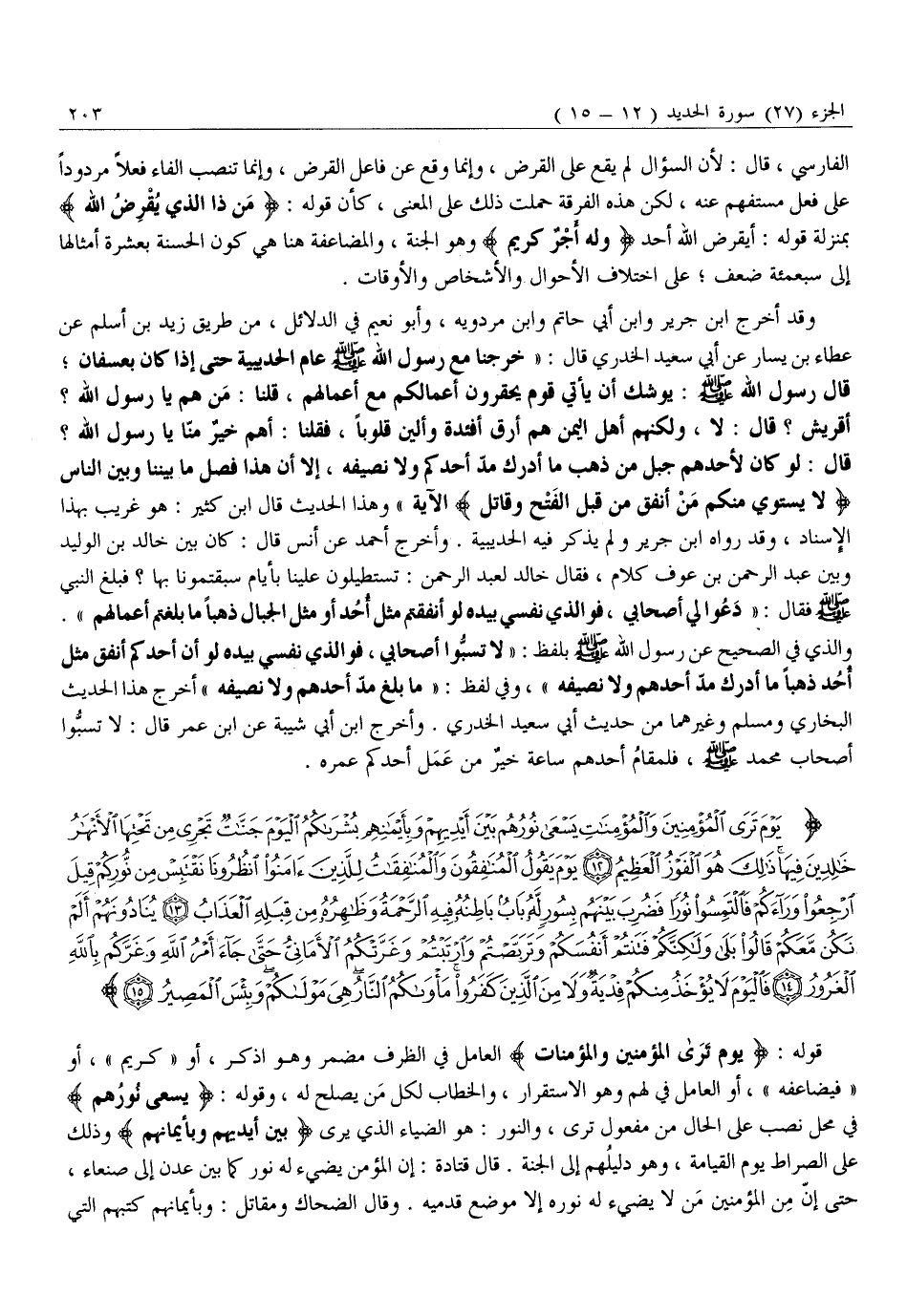 يَوْمَ تَرَى الْمُؤْمِنِينَ وَالْمُؤْمِناتِ يَسْعى نُورُهُمْ بَيْنَ أَيْدِيهِمْ وَبِأَيْمانِهِمْ بُشْراكُمُ الْيَوْمَ جَنَّاتٌ تَجْرِي مِنْ تَحْتِهَا الْأَنْهارُ خالِدِينَ فِيها ذلِكَ هُوَ الْفَوْزُ الْعَظِيمُ (12) يَوْمَ يَقُولُ الْمُنافِقُونَ وَالْمُنافِقاتُ لِلَّذِينَ آمَنُوا انْظُرُونا نَقْتَبِسْ مِنْ نُورِكُمْ قِيلَ ارْجِعُوا وَراءَكُمْ فَالْتَمِسُوا نُوراً فَضُرِبَ بَيْنَهُمْ بِسُورٍ لَهُ بابٌ باطِنُهُ فِيهِ الرَّحْمَةُ وَظاهِرُهُ مِنْ قِبَلِهِ الْعَذابُ (13) يُنادُونَهُمْ أَلَمْ نَكُنْ مَعَكُمْ قالُوا بَلى وَلكِنَّكُمْ فَتَنْتُمْ أَنْفُسَكُمْ وَتَرَبَّصْتُمْ وَارْتَبْتُمْ وَغَرَّتْكُمُ الْأَمانِيُّ حَتَّى جاءَ أَمْرُ اللَّهِ وَغَرَّكُمْ بِاللَّهِ الْغَرُورُ (14) فَالْيَوْمَ لَا يُؤْخَذُ مِنْكُمْ فِدْيَةٌ وَلا مِنَ الَّذِينَ كَفَرُوا مَأْواكُمُ النَّارُ هِيَ مَوْلاكُمْ وَبِئْسَ الْمَصِيرُ (15)
