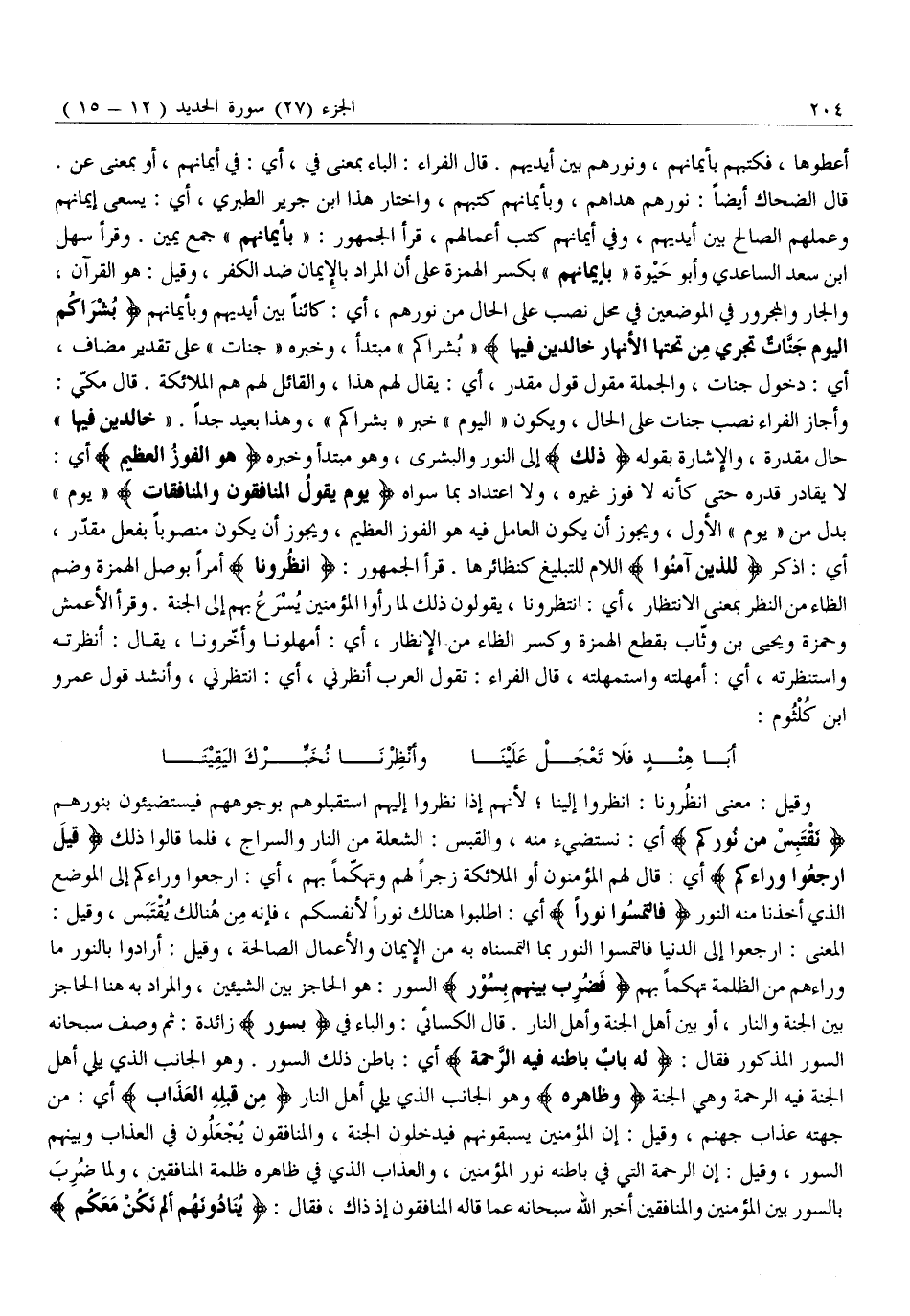 وَقِيلَ: مَعْنَى انْظُرُونَا: انْظُرُوا إِلَيْنَا لِأَنَّهُمْ إِذَا نَظَرُوا إِلَيْهِمُ اسْتَقْبَلُوهُمْ بِوُجُوهِهِمْ فَيَسْتَضِيئُونَ بِنُورِهِمْ نَقْتَبِسْ مِنْ نُورِكُمْ أَيْ: نَسْتَضِيءُ مِنْهُ، وَالْقَبَسُ: الشُّعْلَةُ مِنَ النَّارِ وَالسِّرَاجُ، فَلَمَّا قَالُوا ذَلِكَ قِيلَ ارْجِعُوا وَراءَكُمْ أَيْ: قَالَ لَهُمُ الْمُؤْمِنُونَ أَوِ الْمَلَائِكَةُ زَجْرًا لَهُمْ وَتَهَكُّمًا بِهِمْ، أَيِ: ارْجِعُوا وَرَاءَكُمْ إِلَى الْمَوْضِعِ الَّذِي أَخَذْنَا مِنْهُ النُّورَ فَالْتَمِسُوا نُوراً أَيِ: اطْلُبُوا هُنَالِكَ نُورًا لِأَنْفُسِكُمْ، فَإِنَّهُ مِنْ هُنَالِكَ يُقْتَبَسُ، وَقِيلَ: