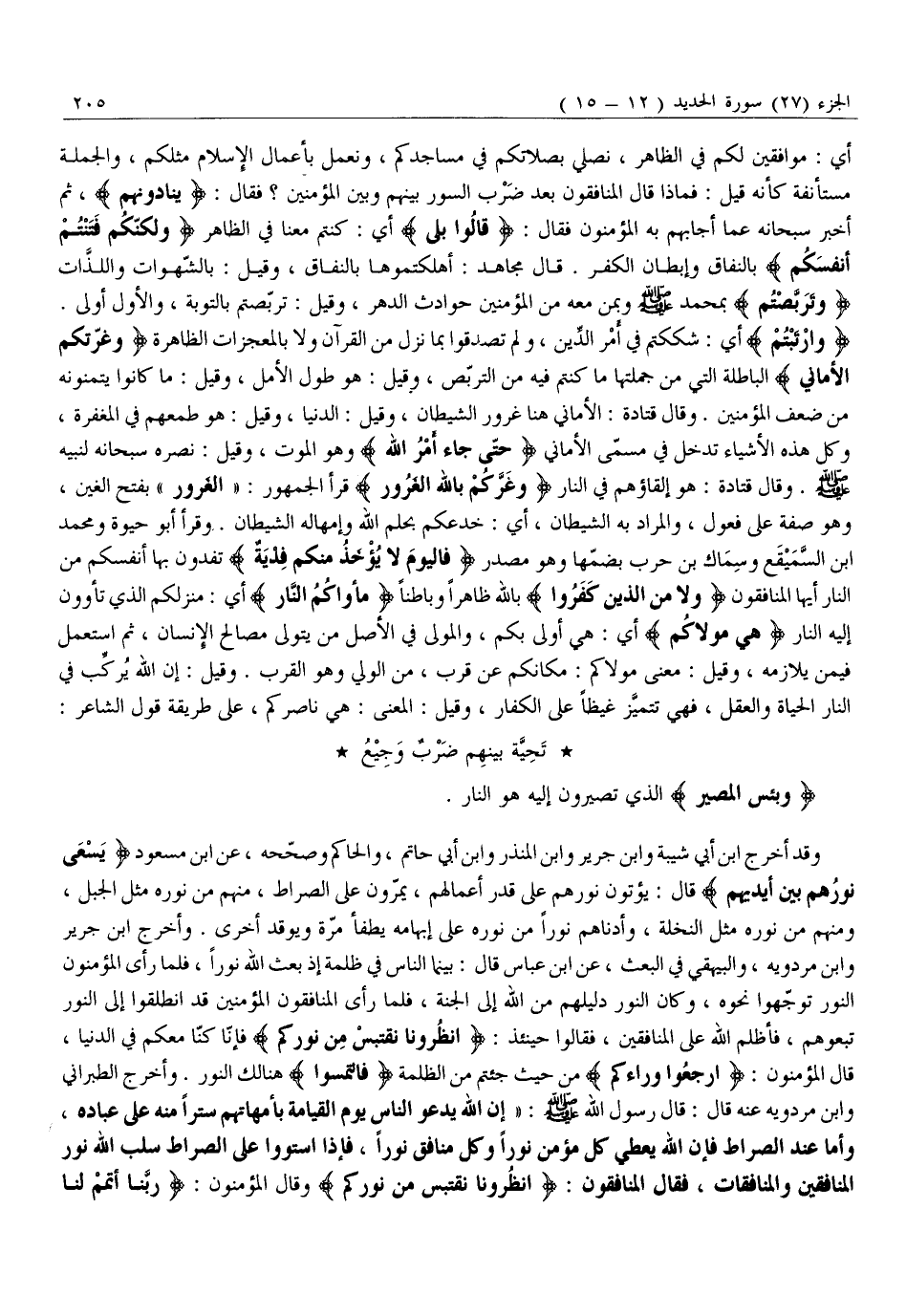 وَارْتَبْتُمْ أَيْ: شَكَكْتُمْ فِي أمر الدّين، ولم تصدقوا بما نَزَلَ مِنَ الْقُرْآنِ وَلَا بِالْمُعْجِزَاتِ الظَّاهِرَةِ وَغَرَّتْكُمُ الْأَمانِيُّ الْبَاطِلَةُ الَّتِي مِنْ جُمْلَتِهَا مَا كُنْتُمْ فِيهِ مِنَ التَّرَبُّصِ، وَقِيلَ: هُوَ طُولُ الْأَمَلِ، وَقِيلَ: مَا كَانُوا يَتَمَنَّوْنَهُ مِنْ ضَعْفِ الْمُؤْمِنِينَ. وَقَالَ قَتَادَةُ: الْأَمَانِيُّ هُنَا غُرُورُ الشَّيْطَانِ، وَقِيلَ: الدُّنْيَا، وَقِيلَ: هُوَ طَمَعُهُمْ فِي الْمَغْفِرَةِ، وَكُلُّ هَذِهِ الْأَشْيَاءِ تَدْخُلُ فِي مُسَمَّى الْأَمَانِيِّ حَتَّى جاءَ أَمْرُ اللَّهِ وَهُوَ الْمَوْتُ، وَقِيلَ: نَصْرُهُ سُبْحَانَهُ لِنَبِيِّهِ صَلَّى اللَّهُ عَلَيْهِ وَسَلَّمَ. وَقَالَ قَتَادَةُ: هُوَ إِلْقَاؤُهُمْ فِي النَّارِ وَغَرَّكُمْ بِاللَّهِ الْغَرُورُ قَرَأَ الْجُمْهُورُ: «الْغَرُورِ» بِفَتْحِ الْغَيْنِ، وَهُوَ صِفَةٌ عَلَى فَعُولٍ، وَالْمُرَادُ بِهِ الشَّيْطَانُ، أَيْ: خَدَعَكُمْ بِحِلْمِ اللَّهِ وَإِمْهَالِهِ الشَّيْطَانُ. وَقَرَأَ أَبُو حيوة ومحمد ابن السّميقع وَسِمَاكُ بْنُ حَرْبٍ بِضَمِّهَا وَهُوَ مَصْدَرٌ فَالْيَوْمَ لَا يُؤْخَذُ مِنْكُمْ فِدْيَةٌ تَفْدُونَ بِهَا أَنْفُسَكُمْ مِنَ النَّارِ أَيُّهَا الْمُنَافِقُونَ وَلا مِنَ الَّذِينَ كَفَرُوا بِاللَّهِ ظَاهِرًا وَبَاطِنًا مَأْواكُمُ النَّارُ أَيْ: مَنْزِلُكُمُ الَّذِي تَأْوُونَ إِلَيْهِ النَّارُ هِيَ مَوْلاكُمْ أَيْ: هِيَ أَوْلَى بِكُمْ، وَالْمَوْلَى فِي الْأَصْلِ من يتولى مصالح الإنسان، ثم استعمل فيمن يُلَازِمُهُ، وَقِيلَ: مَعْنَى مَوْلَاكُمْ: مَكَانُكُمْ عَنْ قُرْبٍ، من الولي وهو القرب. وَقِيلَ: إِنَّ اللَّهَ يُرَكِّبُ فِي النَّارِ الْحَيَاةَ وَالْعَقْلَ، فَهِيَ تَتَمَيَّزُ غَيْظًا عَلَى الْكُفَّارِ، وَقِيلَ: الْمَعْنَى: هِيَ نَاصِرُكُمْ، عَلَى طَرِيقَةِ قَوْلِ الشَّاعِرِ: