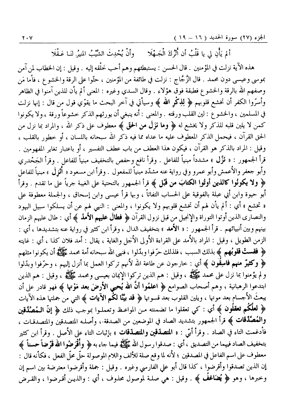 الزَّمَنُ الطَّوِيلُ، وَقِيلَ: الْمُرَادُ بِالْأَمَدِ عَلَى الْقِرَاءَةِ الْأُولَى الْأَجَلُ وَالْغَايَةُ، يُقَالُ: أَمَدُ فُلَانٍ كَذَا، أَيْ: غَايَتُهُ فَقَسَتْ قُلُوبُهُمْ بِذَلِكَ السَّبَبِ، فَلِذَلِكَ حَرَّفُوا وَبَدَّلُوا، فَنَهَى اللَّهُ سُبْحَانَهُ أُمَّةَ مُحَمَّدٍ صَلَّى اللَّهُ عَلَيْهِ وَسَلَّمَ أَنْ يَكُونُوا مِثْلَهُمْ وَكَثِيرٌ مِنْهُمْ فاسِقُونَ أَيْ: خَارِجُونَ عَنْ طَاعَةِ اللَّهِ لِأَنَّهُمْ تَرَكُوا الْعَمَلَ بِمَا أُنْزِلَ إِلَيْهِمْ، وَحَرَّفُوا وَبَدَّلُوا وَلَمْ يُؤْمِنُوا بِمَا نُزِّلَ عَلَى مُحَمَّدٍ صَلَّى اللَّهُ عَلَيْهِ وَسَلَّمَ، وَقِيلَ: هُمُ الَّذِينَ تَرَكُوا الْإِيمَانَ بِعِيسَى وَمُحَمَّدٍ صَلَّى اللَّهُ عَلَيْهِ وَسَلَّمَ، وَقِيلَ: هُمُ الَّذِينَ ابْتَدَعُوا الرَّهْبَانِيَّةَ، وَهُمْ أَصْحَابُ الصَّوَامِعِ اعْلَمُوا أَنَّ اللَّهَ يُحْيِ الْأَرْضَ بَعْدَ مَوْتِها فَهُوَ قَادِرٌ عَلَى أَنْ يَبْعَثَ الْأَجْسَامَ بَعْدَ مَوْتِهَا، وَيُلِينُ الْقُلُوبَ بَعْدَ قَسْوَتِهَا قَدْ بَيَّنَّا لَكُمُ الْآياتِ الَّتِي مِنْ جُمْلَتِهَا هَذِهِ الْآيَاتُ لَعَلَّكُمْ تَعْقِلُونَ أَيْ: كَيْ تَعْقِلُوا مَا تَضَمَّنَتْهُ مِنَ الْمَوَاعِظِ وَتَعْمَلُوا بِمُوجَبِ ذَلِكَ إِنَّ الْمُصَّدِّقِينَ وَالْمُصَّدِّقاتِ قَرَأَ الْجُمْهُورُ بِتَشْدِيدِ الصَّادِ فِي الْمَوْضِعَيْنِ مِنَ الصَّدَقَةِ، وَأَصْلُهُ الْمُتَصَدِّقِينَ وَالْمُتَصَدِّقَاتِ، فَأُدْغِمَتِ التَّاءُ فِي الصَّادِ. وَقَرَأَ أُبَيٌّ: «الْمُتَصَدِّقِينَ وَالْمُتَصَدِّقَاتِ» بِإِثْبَاتِ التَّاءِ عَلَى الْأَصْلِ. وَقَرَأَ ابْنُ كَثِيرٍ بِتَخْفِيفِ الصَّادِ فِيهِمَا مِنَ التَّصْدِيقِ، أَيْ: صَدَّقُوا رَسُولِ اللَّهِ صَلَّى اللَّهُ عَلَيْهِ وَسَلَّمَ فِيمَا جَاءَ بِهِ وَأَقْرَضُوا اللَّهَ قَرْضاً حَسَناً مَعْطُوفٌ عَلَى اسْمِ الْفَاعِلِ فِي الْمُصَّدِّقِينَ لِأَنَّهُ لَمَّا وَقَعَ صِلَةً لِلْأَلِفِ وَاللَّامِ الْمَوْصُولَةِ حَلَّ مَحَلَّ الْفِعْلِ، فَكَأَنَّهُ قَالَ: