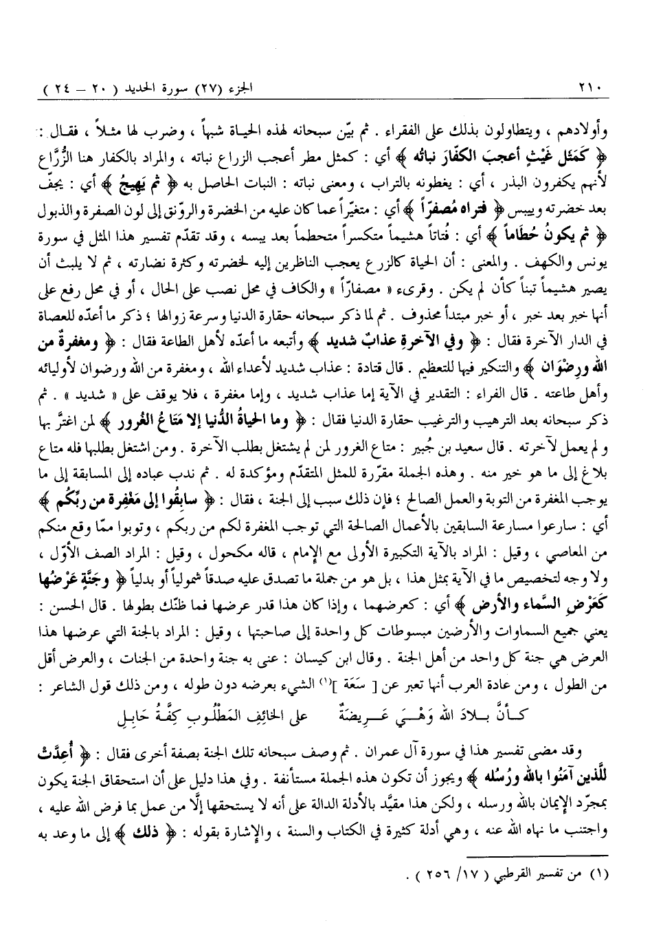 كَمَثَلِ غَيْثٍ أَعْجَبَ الْكُفَّارَ نَباتُهُ أَيْ: كَمَثَلِ مَطَرٍ أَعْجَبَ الزُّرَّاعَ نَبَاتُهُ، وَالْمُرَادُ بِالْكُفَّارِ هُنَا الزُّرَّاعُ لِأَنَّهُمْ يَكْفُرُونَ الْبَذْرَ، أَيْ: يُغَطُّونَهُ بِالتُّرَابِ، وَمَعْنَى نَبَاتُهُ: النَّبَاتُ الْحَاصِلُ بِهِ ثُمَّ يَهِيجُ أَيْ: يَجِفُّ بَعْدَ خُضْرَتِهِ وَيَيْبَسُ فَتَراهُ مُصْفَرًّا أَيْ: مُتَغَيِّرًا عَمَّا كَانَ عَلَيْهِ مِنَ الْخُضْرَةِ وَالرَّوْنَقُ إِلَى لَوْنِ الصُّفْرَةِ وَالذُّبُولِ ثُمَّ يَكُونُ حُطاماً أَيْ: فُتَاتًا هَشِيمًا مُتَكَسِّرًا مُتَحَطِّمًا بَعْدَ يُبْسِهِ، وَقَدْ تَقَدَّمَ تَفْسِيرُ هَذَا الْمَثَلِ فِي سُورَةِ يُونُسَ والكهف. والمعنى: أن الحياة كَالزَّرْعِ يُعْجِبُ النَّاظِرِينَ إِلَيْهِ لِخُضْرَتِهِ وَكَثْرَةِ نَضَارَتِهِ، ثُمَّ لَا يَلْبَثُ أَنْ يَصِيرَ هَشِيمًا تِبْنًا كَأَنْ لَمْ يَكُنْ. وَقُرِئَ «مُصْفَارًّا» وَالْكَافُ فِي مَحَلِّ نَصْبٍ عَلَى الْحَالِ، أَوْ فِي مَحَلِّ رَفْعٍ عَلَى أَنَّهَا خَبَرٌ بَعْدَ خَبَرٍ، أَوْ خَبَرُ مُبْتَدَأٍ مَحْذُوفٍ. ثُمَّ لَمَّا ذَكَرَ سُبْحَانَهُ حَقَارَةَ الدُّنْيَا وَسُرْعَةَ زَوَالِهَا ذَكَرَ مَا أَعَدَّهُ لِلْعُصَاةِ فِي الدَّارِ الْآخِرَةِ فَقَالَ: وَفِي الْآخِرَةِ عَذابٌ شَدِيدٌ وأتبعه ما أَعَدَّهُ لِأَهْلِ الطَّاعَةِ فَقَالَ: وَمَغْفِرَةٌ مِنَ اللَّهِ وَرِضْوانٌ والتنكير فيها لِلتَّعْظِيمِ. قَالَ قَتَادَةُ: عَذَابٌ شَدِيدٌ لِأَعْدَاءِ اللَّهِ، وَمَغْفِرَةٌ مِنَ اللَّهِ وَرِضْوَانٌ لِأَوْلِيَائِهِ وَأَهْلِ طَاعَتِهِ. قَالَ الْفَرَّاءُ: التَّقْدِيرُ فِي الْآيَةِ إِمَّا عَذَابٌ شَدِيدٌ، وَإِمَّا مَغْفِرَةٌ، فَلَا يُوقَفُ عَلَى «شَدِيدٌ» . ثُمَّ ذَكَرَ سُبْحَانَهُ بَعْدَ التَّرْهِيبِ وَالتَّرْغِيبِ حَقَارَةَ الدُّنْيَا فَقَالَ: وَمَا الْحَياةُ الدُّنْيا إِلَّا مَتاعُ الْغُرُورِ لِمَنِ اغْتَرَّ بِهَا وَلَمْ يَعْمَلْ لِآخِرَتِهِ. قَالَ سَعِيدُ بْنُ جُبَيْرٍ: مَتَاعُ الْغُرُورِ لِمَنْ لَمْ يَشْتَغِلْ بِطَلَبِ الْآخِرَةِ. وَمَنِ اشْتَغَلَ بِطَلَبِهَا فَلَهُ مَتَاعُ بِلَاغٍ إِلَى مَا هُوَ خَيْرٌ مِنْهُ. وَهَذِهِ الْجُمْلَةُ مُقَرِّرَةٌ لِلْمَثَلِ الْمُتَقَدِّمِ وَمُؤَكِّدَةٌ لَهُ. ثُمَّ نَدَبَ عِبَادَهُ إِلَى الْمُسَابَقَةِ إِلَى مَا يُوجِبُ الْمَغْفِرَةَ مِنَ التَّوْبَةِ وَالْعَمَلِ الصَّالِحِ فَإِنَّ ذَلِكَ سَبَبٌ إِلَى الْجَنَّةِ، فَقَالَ: سابِقُوا إِلى مَغْفِرَةٍ مِنْ رَبِّكُمْ أَيْ: سَارِعُوا مُسَارَعَةَ السَّابِقِينَ بِالْأَعْمَالِ الصَّالِحَةِ الَّتِي تُوجِبُ الْمَغْفِرَةَ لَكُمْ مِنْ رَبِّكُمْ، وَتُوبُوا مِمَّا وَقَعَ مِنْكُمْ مِنَ الْمَعَاصِي، وَقِيلَ: الْمُرَادُ بِالْآيَةِ التَّكْبِيرَةُ الْأُولَى مَعَ الْإِمَامِ، قَالَهُ مَكْحُولٌ، وَقِيلَ: الْمُرَادُ الصَّفُّ الْأَوَّلُ، وَلَا وَجْهَ لِتَخْصِيصِ مَا فِي الْآيَةِ بِمِثْلِ هَذَا، بَلْ هُوَ مِنْ جُمْلَةِ مَا تُصْدُقُ عَلَيْهِ صِدْقًا شُمُولِيًّا أَوْ بَدَلِيًّا وَجَنَّةٍ عَرْضُها كَعَرْضِ السَّماءِ وَالْأَرْضِ أَيْ: كَعَرْضِهِمَا، وَإِذَا كَانَ هَذَا قَدْرَ عَرْضِهَا فَمَا ظَنُّكَ بِطُولِهَا. قَالَ الْحَسَنُ: