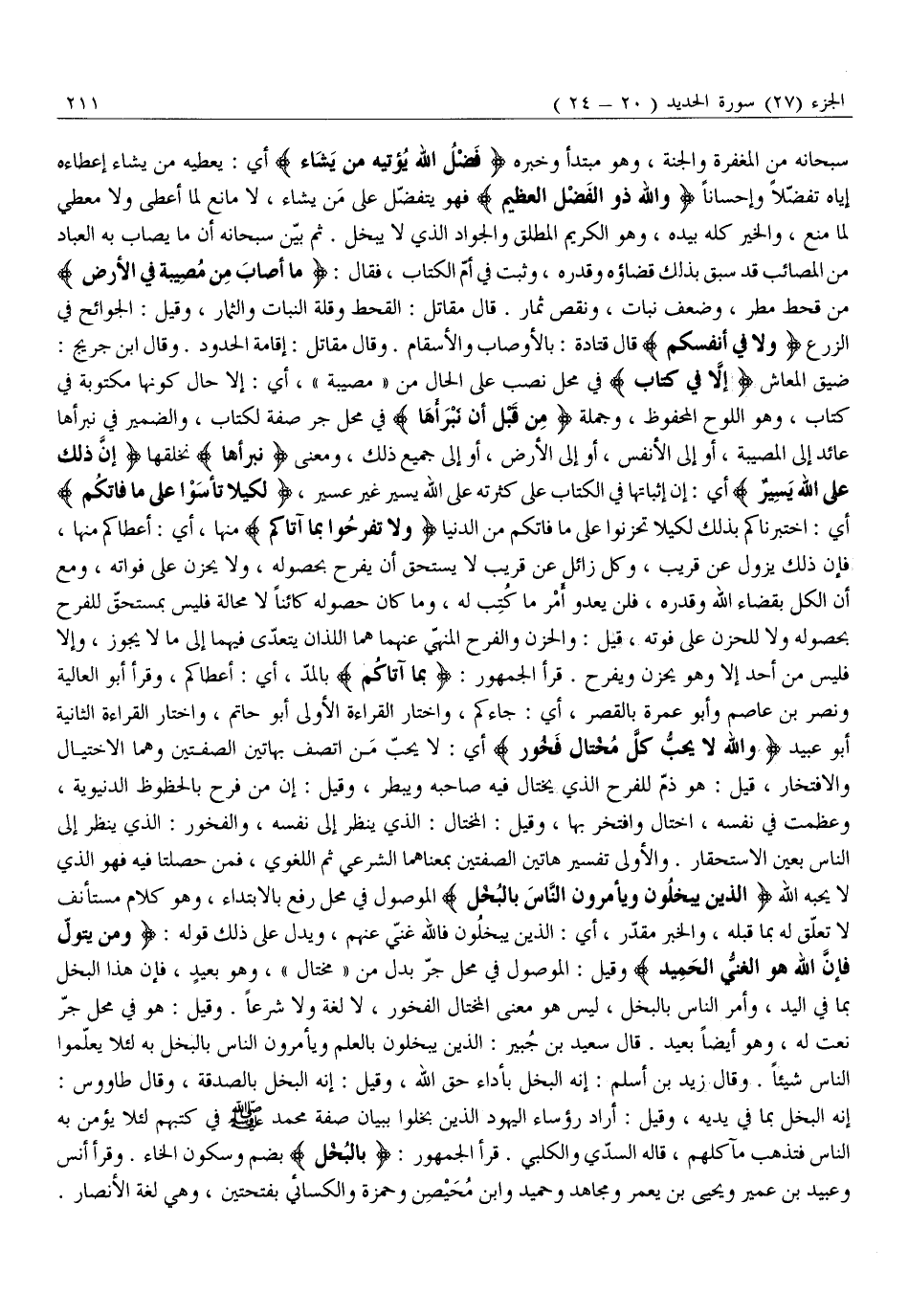 ضِيقُ الْمَعَاشِ إِلَّا فِي كِتابٍ فِي مَحَلِّ نَصْبٍ عَلَى الْحَالِ مِنْ «مُصِيبَةٌ» ، أَيْ: إِلَّا حَالَ كَوْنِهَا مَكْتُوبَةً فِي كِتَابٍ، وَهُوَ اللَّوْحُ الْمَحْفُوظُ، وَجُمْلَةُ مِنْ قَبْلِ أَنْ نَبْرَأَها فِي مَحَلِّ جر صفة لكتاب، وَالضَّمِيرُ فِي نَبْرَأَهَا عَائِدٌ إِلَى الْمُصِيبَةِ، أَوْ إِلَى الْأَنْفُسِ، أَوْ إِلَى الْأَرْضِ، أَوْ إِلَى جَمِيعِ ذَلِكَ، وَمَعْنَى نَبْرَأَها نَخْلُقُهَا إِنَّ ذلِكَ عَلَى اللَّهِ يَسِيرٌ أَيْ: إِنَّ إِثْبَاتَهَا فِي الْكِتَابِ عَلَى كَثْرَتِهِ عَلَى اللَّهِ يَسِيرٌ غَيْرُ عسير، لِكَيْلا تَأْسَوْا عَلى مَا فاتَكُمْ أَيِ: اخْتَبَرْنَاكُمْ بِذَلِكَ لِكَيْلَا تَحْزَنُوا عَلَى مَا فَاتَكُمْ مِنَ الدُّنْيَا وَلا تَفْرَحُوا بِما آتاكُمْ مِنْهَا، أَيْ: أَعْطَاكُمْ مِنْهَا، فَإِنَّ ذَلِكَ يَزُولُ عَنْ قَرِيبٍ، وَكُلُّ زَائِلٍ عَنْ قَرِيبٍ لَا يَسْتَحِقُّ أَنْ يُفْرَحَ بِحُصُولِهِ، وَلَا يُحْزَنَ عَلَى فَوَاتِهِ، وَمَعَ أَنَّ الكل بقضاء الله وقدره، فلن يعدو أمر مَا كُتِبَ لَهُ، وَمَا كَانَ حُصُولُهُ كَائِنًا لَا مَحَالَةَ فَلَيْسَ بِمُسْتَحِقٍّ لِلْفَرَحِ بِحُصُولِهِ وَلَا للحزن على فوته، قيل: وَالْحُزْنُ وَالْفَرَحُ الْمَنْهِيُّ عَنْهُمَا هُمَا اللَّذَانِ يُتَعَدَّى فِيهِمَا إِلَى مَا لَا يَجُوزُ، وَإِلَّا فَلَيْسَ مِنْ أَحَدٍ إِلَّا وَهُوَ يَحْزَنُ وَيَفْرَحُ. قَرَأَ الْجُمْهُورُ: بِما آتاكُمْ بِالْمَدِّ، أَيْ: أَعْطَاكُمْ، وَقَرَأَ أبو العالية ونصر بن عاصم وأبو عمرة بِالْقَصْرِ، أَيْ: جَاءَكُمْ، وَاخْتَارَ الْقِرَاءَةَ الْأُولَى أَبُو حَاتِمٍ، وَاخْتَارَ الْقِرَاءَةَ الثَّانِيَةِ أَبُو عُبَيْدٍ وَاللَّهُ لَا يُحِبُّ كُلَّ مُخْتالٍ فَخُورٍ أَيْ: لَا يُحِبُّ مَنِ اتَّصَفَ بِهَاتَيْنِ الصِّفَتَيْنِ وَهُمَا الِاخْتِيَالُ وَالِافْتِخَارُ، قِيلَ: هُوَ ذَمٌّ لِلْفَرَحِ الَّذِي يَخْتَالُ فِيهِ صَاحِبُهُ وَيَبْطَرُ، وَقِيلَ: إِنَّ مَنْ فَرِحَ بِالْحُظُوظِ الدُّنْيَوِيَّةِ، وَعَظُمَتْ فِي نَفْسِهِ، اخْتَالَ وَافْتَخَرَ بِهَا، وَقِيلَ: الْمُخْتَالُ: الَّذِي يَنْظُرُ إِلَى نَفْسِهِ، والفخور: الَّذِي يَنْظُرُ إِلَى نَفْسِهِ، وَالْفَخُورُ: الَّذِي يَنْظُرُ إِلَى النَّاسِ بِعَيْنِ الِاسْتِحْقَارِ. وَالْأَوْلَى تَفْسِيرُ هَاتَيْنِ الصِّفَتَيْنِ بِمَعْنَاهُمَا الشَّرْعِيِّ ثُمَّ اللُّغَوِيِّ، فَمَنْ حَصَلَتَا فِيهِ فَهُوَ الَّذِي لَا يُحِبُّهُ اللَّهُ الَّذِينَ يَبْخَلُونَ وَيَأْمُرُونَ النَّاسَ بِالْبُخْلِ الْمَوْصُولُ فِي مَحَلِّ رَفْعٍ بِالِابْتِدَاءِ، وَهُوَ كَلَامٌ مُسْتَأْنَفٌ لَا تَعَلُّقَ لَهُ بِمَا قَبْلَهُ، وَالْخَبَرُ مُقَدَّرٌ، أَيِ: الَّذِينَ يَبْخَلُونَ فَاللَّهُ غَنِيٌّ عَنْهُمْ، وَيَدُلُّ عَلَى ذَلِكَ قَوْلُهُ: وَمَنْ يَتَوَلَّ فَإِنَّ اللَّهَ هُوَ الْغَنِيُّ الْحَمِيدُ وَقِيلَ: الْمَوْصُولُ فِي مَحَلِّ جَرٍّ بَدَلٌ مِنْ «مُخْتَالٍ» ، وَهُوَ بَعِيدٌ، فَإِنَّ هَذَا الْبُخْلَ بِمَا فِي الْيَدِ، وَأَمْرَ النَّاسِ بِالْبُخْلِ، لَيْسَ هُوَ مَعْنَى الْمُخْتَالِ الْفَخُورِ، لَا لُغَةً وَلَا شَرْعًا. وَقِيلَ: هُوَ فِي مَحَلِّ جَرٍّ نَعْتٌ لَهُ، وَهُوَ أَيْضًا بِعِيدٌ. قَالَ سَعِيدُ بْنُ جُبَيْرٍ: الَّذِينَ يَبْخَلُونَ بِالْعِلْمِ وَيَأْمُرُونَ النَّاسَ بِالْبُخْلِ بِهِ لِئَلَّا يُعَلِّمُوا النَّاسَ شَيْئًا. وَقَالَ زَيْدُ بْنُ أَسْلَمَ: إِنَّهُ الْبُخْلُ بِأَدَاءِ حَقِّ اللَّهِ، وقيل: إنه البخل بالصدقة، وقال طاوس: