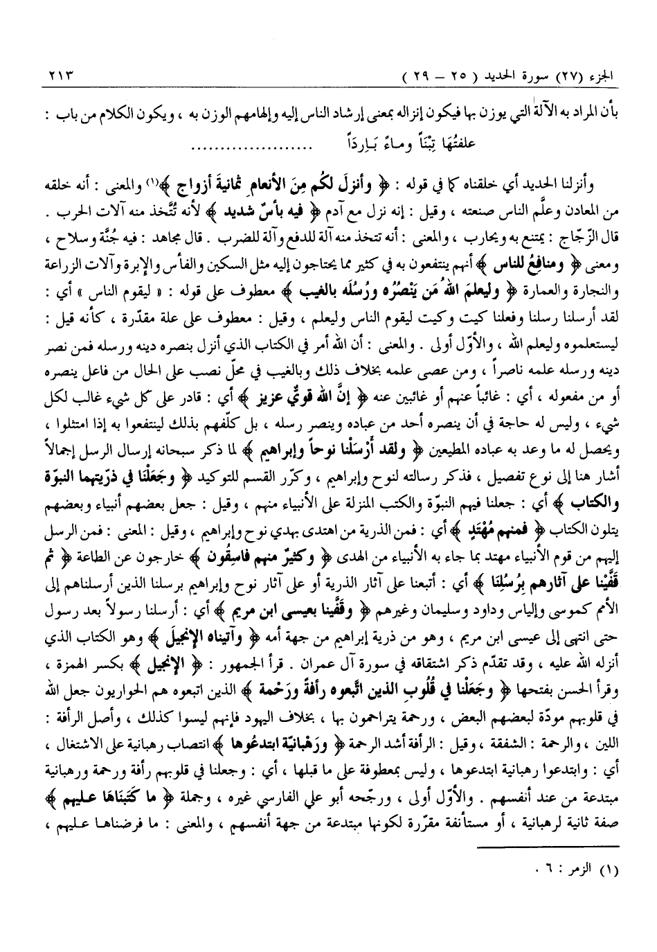 ليستعلموه وَلِيَعْلَمَ اللَّهُ، وَالْأَوَّلُ أَوْلَى. وَالْمَعْنَى: أَنَّ اللَّهَ أَمَرَ فِي الْكِتَابِ الَّذِي أَنْزَلَ بِنُصْرَةِ دِينِهِ وَرُسُلِهِ فَمَنْ نَصَرَ دِينَهُ وَرُسُلَهُ عَلِمَهُ نَاصِرًا، ومن عصى علمه بخلاف ذلك وبالغيب فِي مَحَلِّ نَصْبٍ عَلَى الْحَالِ مِنْ فَاعِلِ يَنْصُرُهُ أَوْ مِنْ مَفْعُولِهِ، أَيْ: غَائِبًا عَنْهُمْ أَوْ غَائِبِينَ عَنْهُ إِنَّ اللَّهَ قَوِيٌّ عَزِيزٌ أَيْ: قَادِرٌ عَلَى كُلِّ شَيْءٍ غَالِبٌ لِكُلِّ شَيْءٍ، وَلَيْسَ لَهُ حَاجَةٌ فِي أَنْ يَنْصُرَهُ أَحَدٌ مِنْ عِبَادِهِ وَيَنْصُرَ رُسُلَهُ، بَلْ كَلَّفَهُمْ بذلك لينتفعوا به إذا امتثلوا، ويحصل له مَا وَعَدَ بِهِ عِبَادَهُ الْمُطِيعِينَ وَلَقَدْ أَرْسَلْنا نُوحاً وَإِبْراهِيمَ لَمَّا ذَكَرَ سُبْحَانَهُ إِرْسَالَ الرُّسُلِ إِجْمَالًا أَشَارَ هُنَا إِلَى نَوْعِ تَفْصِيلٍ، فَذَكَرَ رِسَالَتَهُ لِنُوحٍ وَإِبْرَاهِيمَ، وَكَرَّرَ الْقَسَمَ لِلتَّوْكِيدِ وَجَعَلْنا فِي ذُرِّيَّتِهِمَا النُّبُوَّةَ وَالْكِتابَ أَيْ: جَعَلْنَا فِيهِمُ النُّبُوَّةَ وَالْكُتُبَ الْمُنَزَّلَةَ عَلَى الْأَنْبِيَاءِ مِنْهُمْ، وَقِيلَ: جَعَلَ بَعْضَهُمْ أَنْبِيَاءَ وَبَعْضَهُمْ يَتْلُونَ الْكِتَابَ فَمِنْهُمْ مُهْتَدٍ أَيْ: فَمِنَ الذُّرِّيَّةِ مَنِ اهْتَدَى بِهُدَى نوح وإبراهيم، وقيل: المعنى: فمن الرسل إِلَيْهِمْ مِنْ قَوْمِ الْأَنْبِيَاءِ مُهْتَدٍ بِمَا جَاءَ بِهِ الْأَنْبِيَاءُ مِنَ الْهُدَى وَكَثِيرٌ مِنْهُمْ فاسِقُونَ خَارِجُونَ عَنِ الطَّاعَةِ ثُمَّ قَفَّيْنا عَلى آثارِهِمْ بِرُسُلِنا أَيِ: أَتْبَعْنَا عَلَى آثَارِ الذُّرِّيَّةِ أَوْ عَلَى آثَارِ نُوحٍ وَإِبْرَاهِيمَ بِرُسُلِنَا الَّذِينَ أَرْسَلْنَاهُمْ إِلَى الْأُمَمِ كَمُوسَى وَإِلْيَاسَ وَدَاوُدَ وَسُلَيْمَانَ وَغَيْرِهِمْ وَقَفَّيْنا بِعِيسَى ابْنِ مَرْيَمَ أَيْ: أَرْسَلْنَا رَسُولًا بَعْدَ رَسُولٍ حَتَّى انْتَهَى إِلَى عِيسَى ابْنِ مَرْيَمَ، وَهُوَ مِنْ ذُرِّيَّةِ إِبْرَاهِيمَ مِنْ جِهَةِ أُمِّهِ وَآتَيْناهُ الْإِنْجِيلَ وَهُوَ الْكِتَابُ الَّذِي أَنْزَلَهُ اللَّهُ عَلَيْهِ، وَقَدْ تَقَدَّمَ ذِكْرُ اشْتِقَاقِهِ فِي سُورَةِ آلِ عِمْرَانَ. قَرَأَ الْجُمْهُورُ: الْإِنْجِيلَ بِكَسْرِ الْهَمْزَةِ، وَقَرَأَ الْحَسَنُ بِفَتْحِهَا وَجَعَلْنا فِي قُلُوبِ الَّذِينَ اتَّبَعُوهُ رَأْفَةً وَرَحْمَةً الَّذِينَ اتَّبَعُوهُ هُمُ الْحَوَارِيُّونَ جَعَلَ اللَّهُ فِي قُلُوبِهِمْ مَوَدَّةً لِبَعْضِهِمُ الْبَعْضَ، وَرَحْمَةً يَتَرَاحَمُونَ بِهَا، بِخِلَافِ الْيَهُودِ فَإِنَّهُمْ لَيْسُوا كَذَلِكَ، وَأَصْلُ الرَّأْفَةِ: