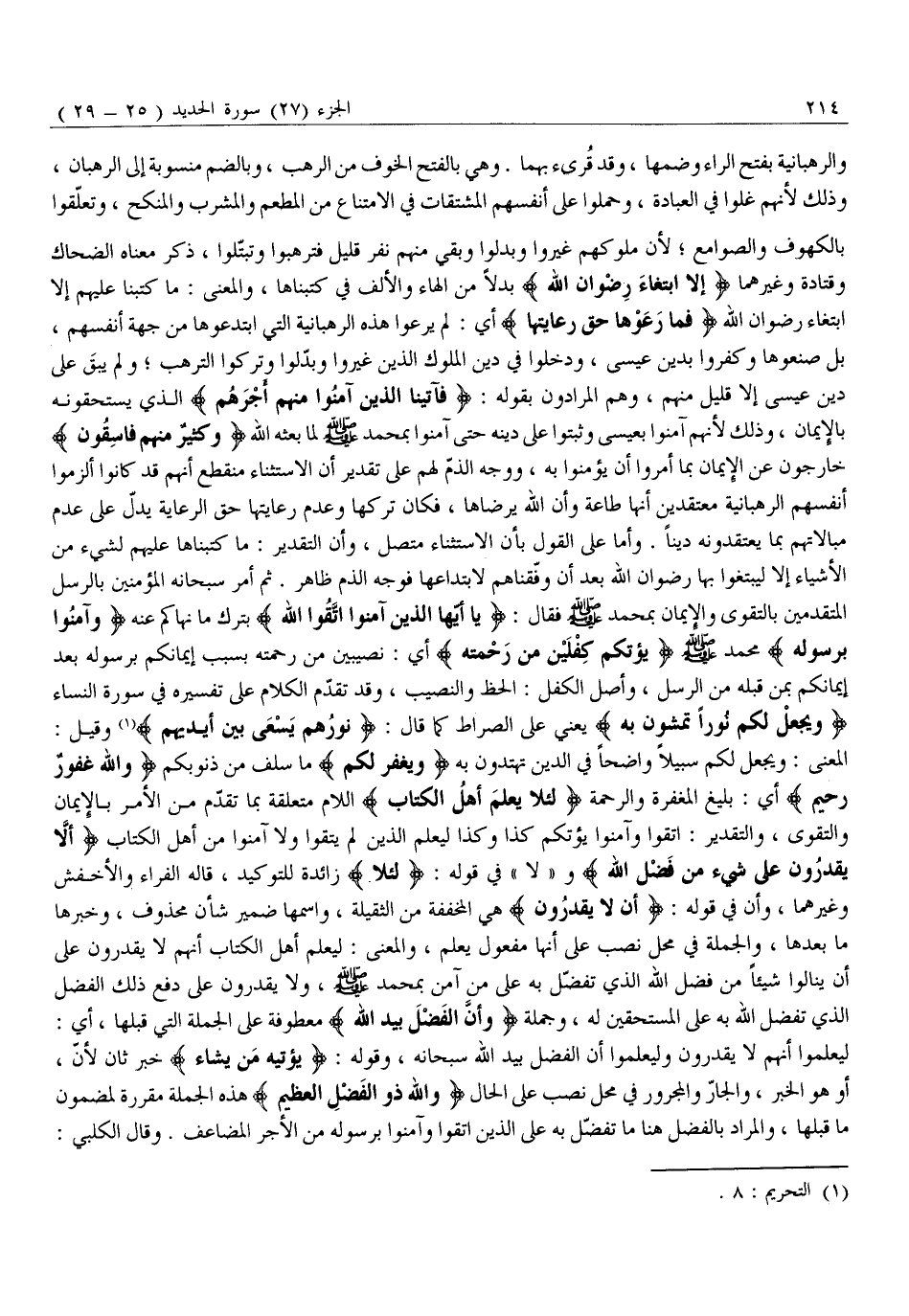 وَالرَّهْبَانِيَّةُ بِفَتْحِ الرَّاءِ وَضَمِّهَا، وَقَدْ قُرِئَ بِهِمَا. وَهِيَ بِالْفَتْحِ الْخَوْفُ مِنَ الرَّهْبِ، وَبِالضَّمِّ مَنْسُوبَةٌ إِلَى الرُّهْبَانِ، وَذَلِكَ لِأَنَّهُمْ غَلَوْا فِي الْعِبَادَةِ، وحملوا على أنفسهم المشتقات فِي الِامْتِنَاعِ مِنَ الْمَطْعَمِ وَالْمَشْرَبِ وَالْمَنْكِحِ، وَتَعَلَّقُوا بِالْكُهُوفِ وَالصَّوَامِعِ لِأَنَّ مُلُوكَهُمْ غَيَّرُوا وَبَدَّلُوا وَبَقِيَ مِنْهُمْ نَفَرٌ قَلِيلٌ فَتَرَهَّبُوا وَتَبَتَّلُوا، ذَكَرَ مَعْنَاهُ الضَّحَّاكُ وَقَتَادَةُ وَغَيْرُهُمَا إِلَّا ابْتِغاءَ رِضْوانِ اللَّهِ بَدَلًا مِنَ الْهَاءِ وَالْأَلِفِ فِي كَتَبْنَاهَا، وَالْمَعْنَى: مَا كَتَبْنَا عَلَيْهِمْ إِلَّا ابْتِغَاءَ رِضْوَانِ اللَّهِ فَما رَعَوْها حَقَّ رِعايَتِها أَيْ: لَمْ يَرْعَوْا هَذِهِ الرَّهْبَانِيَّةَ الَّتِي ابْتَدَعُوهَا مِنْ جِهَةِ أَنْفُسِهِمْ، بل صنعوها وَكَفَرُوا بِدِينِ عِيسَى، وَدَخَلُوا فِي دِينِ الْمُلُوكِ الَّذِينَ غَيَّرُوا وَبَدَّلُوا وَتَرَكُوا التَّرَهُّبَ وَلَمْ يَبْقَ عَلَى دِينِ عِيسَى إِلَّا قَلِيلٌ مِنْهُمْ، وَهُمُ الْمُرَادُونَ بِقَوْلِهِ: فَآتَيْنَا الَّذِينَ آمَنُوا مِنْهُمْ أَجْرَهُمْ الَّذِي يَسْتَحِقُّونَهُ بِالْإِيمَانِ، وَذَلِكَ لِأَنَّهُمْ آمَنُوا بِعِيسَى وَثَبَتُوا عَلَى دِينِهِ حَتَّى آمَنُوا بِمُحَمَّدٍ صَلَّى اللَّهُ عَلَيْهِ وَسَلَّمَ لَمَّا بَعَثَهُ اللَّهُ وَكَثِيرٌ مِنْهُمْ فاسِقُونَ خَارِجُونَ عَنِ الْإِيمَانِ بِمَا أُمِرُوا أَنْ يُؤْمِنُوا بِهِ، وَوَجْهُ الذَّمِّ لَهُمْ عَلَى تَقْدِيرِ أَنَّ الِاسْتِثْنَاءَ مُنْقَطِعٌ أَنَّهُمْ قَدْ كَانُوا أَلْزَمُوا أَنْفُسَهُمُ الرَّهْبَانِيَّةَ مُعْتَقِدِينَ أَنَّهَا طَاعَةٌ وَأَنَّ اللَّهَ يَرْضَاهَا، فَكَانَ تَرْكُهَا وَعَدَمُ رِعَايَتِهَا حَقَّ الرِّعَايَةِ يَدُلُّ عَلَى عَدَمِ مُبَالَاتِهِمْ بِمَا يَعْتَقِدُونَهُ دِينًا. وَأَمَّا عَلَى الْقَوْلِ بِأَنَّ الِاسْتِثْنَاءَ مُتَّصِلٌ، وَأَنَّ التَّقْدِيرَ: مَا كَتَبْنَاهَا عَلَيْهِمْ لِشَيْءٍ مِنَ الْأَشْيَاءِ إِلَّا لِيَبْتَغُوا بِهَا رِضْوَانَ اللَّهِ بَعْدَ أَنْ وَفَّقْنَاهُمْ لِابْتِدَاعِهَا فَوَجْهُ الذَّمِّ ظَاهِرٌ. ثُمَّ أَمَرَ سُبْحَانَهُ الْمُؤْمِنِينَ بِالرُّسُلِ الْمُتَقَدِّمِينَ بِالتَّقْوَى وَالْإِيمَانِ بمحمد صَلَّى اللَّهُ عَلَيْهِ وَسَلَّمَ فَقَالَ: يَا أَيُّهَا الَّذِينَ آمَنُوا اتَّقُوا اللَّهَ بِتَرْكِ مَا نَهَاكُمْ عَنْهُ وَآمِنُوا بِرَسُولِهِ مُحَمَّدٍ صَلَّى اللَّهُ عَلَيْهِ وَسَلَّمَ يُؤْتِكُمْ كِفْلَيْنِ مِنْ رَحْمَتِهِ