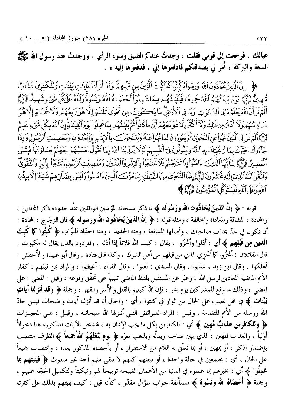 إِنَّ الَّذِينَ يُحَادُّونَ اللَّهَ وَرَسُولَهُ كُبِتُوا كَما كُبِتَ الَّذِينَ مِنْ قَبْلِهِمْ وَقَدْ أَنْزَلْنا آياتٍ بَيِّناتٍ وَلِلْكافِرِينَ عَذابٌ مُهِينٌ (5) يَوْمَ يَبْعَثُهُمُ اللَّهُ جَمِيعاً فَيُنَبِّئُهُمْ بِما عَمِلُوا أَحْصاهُ اللَّهُ وَنَسُوهُ وَاللَّهُ عَلى كُلِّ شَيْءٍ شَهِيدٌ (6) أَلَمْ تَرَ أَنَّ اللَّهَ يَعْلَمُ مَا فِي السَّماواتِ وَما فِي الْأَرْضِ مَا يَكُونُ مِنْ نَجْوى ثَلاثَةٍ إِلاَّ هُوَ رابِعُهُمْ وَلا خَمْسَةٍ إِلاَّ هُوَ سادِسُهُمْ وَلا أَدْنى مِنْ ذلِكَ وَلا أَكْثَرَ إِلاَّ هُوَ مَعَهُمْ أَيْنَ مَا كانُوا ثُمَّ يُنَبِّئُهُمْ بِما عَمِلُوا يَوْمَ الْقِيامَةِ إِنَّ اللَّهَ بِكُلِّ شَيْءٍ عَلِيمٌ (7) أَلَمْ تَرَ إِلَى الَّذِينَ نُهُوا عَنِ النَّجْوى ثُمَّ يَعُودُونَ لِما نُهُوا عَنْهُ وَيَتَناجَوْنَ بِالْإِثْمِ وَالْعُدْوانِ وَمَعْصِيَةِ الرَّسُولِ وَإِذا جاؤُكَ حَيَّوْكَ بِما لَمْ يُحَيِّكَ بِهِ اللَّهُ وَيَقُولُونَ فِي أَنْفُسِهِمْ لَوْلا يُعَذِّبُنَا اللَّهُ بِما نَقُولُ حَسْبُهُمْ جَهَنَّمُ يَصْلَوْنَها فَبِئْسَ الْمَصِيرُ (8) يَا أَيُّهَا الَّذِينَ آمَنُوا إِذا تَناجَيْتُمْ فَلا تَتَناجَوْا بِالْإِثْمِ وَالْعُدْوانِ وَمَعْصِيَةِ الرَّسُولِ وَتَناجَوْا بِالْبِرِّ وَالتَّقْوى وَاتَّقُوا اللَّهَ الَّذِي إِلَيْهِ تُحْشَرُونَ (9)