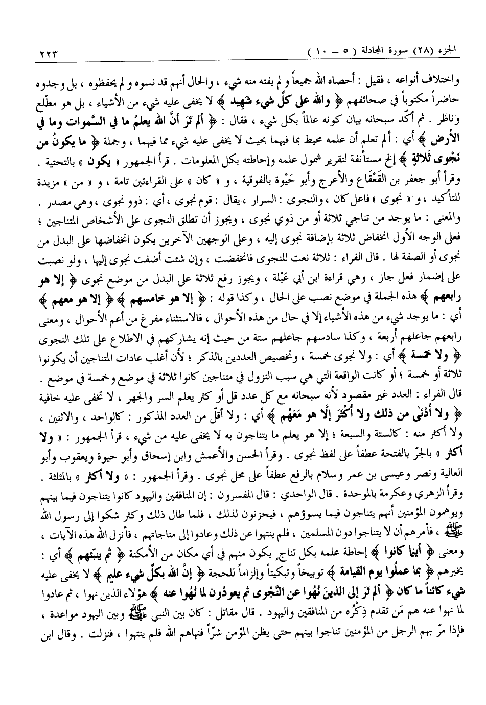 وَاخْتِلَافِ أَنْوَاعِهِ، فَقِيلَ: أَحْصَاهُ اللَّهُ جَمِيعًا وَلَمْ يَفُتْهُ مِنْهُ شَيْءٌ، وَالْحَالُ أَنَّهُمْ قَدْ نَسُوهُ وَلَمْ يَحْفَظُوهُ، بَلْ وَجَدُوهُ حَاضِرًا مَكْتُوبًا فِي صَحَائِفِهِمْ وَاللَّهُ عَلى كُلِّ شَيْءٍ شَهِيدٌ لَا يَخْفَى عَلَيْهِ شَيْءٌ مِنَ الْأَشْيَاءِ، بَلْ هُوَ مُطَّلِعٌ وَنَاظِرٌ. ثُمَّ أَكَّدَ سُبْحَانَهُ بَيَانَ كَوْنِهِ عَالِمًا بِكُلِّ شَيْءٍ، فَقَالَ: أَلَمْ تَرَ أَنَّ اللَّهَ يَعْلَمُ مَا فِي السَّماواتِ وَما فِي الْأَرْضِ أَيْ: أَلَمْ تَعْلَمْ أَنَّ عِلْمَهُ مُحِيطٌ بِمَا فِيهِمَا بِحَيْثُ لَا يَخْفَى عَلَيْهِ شَيْءٌ مِمَّا فِيهِمَا، وَجُمْلَةُ مَا يَكُونُ مِنْ نَجْوى ثَلاثَةٍ إِلَخْ مُسْتَأْنَفَةٌ لِتَقْرِيرِ شُمُولِ عِلْمِهِ وَإِحَاطَتِهِ بِكُلِّ الْمَعْلُومَاتِ. قَرَأَ الْجُمْهُورُ «يَكُونُ» بِالتَّحْتِيَّةِ.