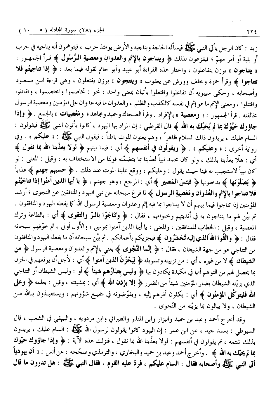 السَّامُ عليك، يريدون ذلك السَّلَامَ ظَاهِرًا، وَهُمْ يَعْنُونَ الْمَوْتَ بَاطِنًا، فَيَقُولُ النَّبِيُّ صَلَّى اللَّهُ عَلَيْهِ وَسَلَّمَ: «عَلَيْكُمْ» . وَفِي رِوَايَةٍ أُخْرَى: «وَعَلَيْكُمْ» . وَيَقُولُونَ فِي أَنْفُسِهِمْ أَيْ: فِيمَا بَيْنَهُمْ لَوْلا يُعَذِّبُنَا اللَّهُ بِما نَقُولُ أَيْ: هَلَّا يُعَذِّبُنَا بِذَلِكَ، وَلَوْ كَانَ مُحَمَّدٌ نَبِيًّا لَعَذَّبَنَا بِمَا يَتَضَمَّنُهُ قَوْلُنَا مِنَ الِاسْتِخْفَافِ بِهِ، وَقِيلَ: الْمَعْنَى: لَوْ كَانَ نَبِيًّا لَاسْتُجِيبَ لَهُ فِينَا حَيْثُ يَقُولُ: وَعَلَيْكُمْ، وَوَقَعَ عَلَيْنَا الْمَوْتُ عِنْدَ ذَلِكَ. حَسْبُهُمْ جَهَنَّمُ عَذَابًا يَصْلَوْنَها يَدْخُلُونَهَا فَبِئْسَ الْمَصِيرُ أَيِ: الْمَرْجِعُ، وَهُوَ جَهَنَّمُ، يَا أَيُّهَا الَّذِينَ آمَنُوا إِذا تَناجَيْتُمْ فَلا تَتَناجَوْا بِالْإِثْمِ وَالْعُدْوانِ وَمَعْصِيَةِ الرَّسُولِ لَمَّا فَرَغَ سُبْحَانَهُ عَنْ نَهْيِ الْيَهُودِ وَالْمُنَافِقِينَ عَنِ النَّجْوَى أَرْشَدَ الْمُؤْمِنِينَ إِذَا تَنَاجَوْا فِيمَا بَيْنَهُمْ أَنْ لَا يَتَنَاجَوْا بِمَا فِيهِ إِثْمٌ وَعُدْوَانٌ وَمَعْصِيَةٌ لِرَسُولِ اللَّهِ كَمَا يَفْعَلُهُ الْيَهُودُ وَالْمُنَافِقُونَ.