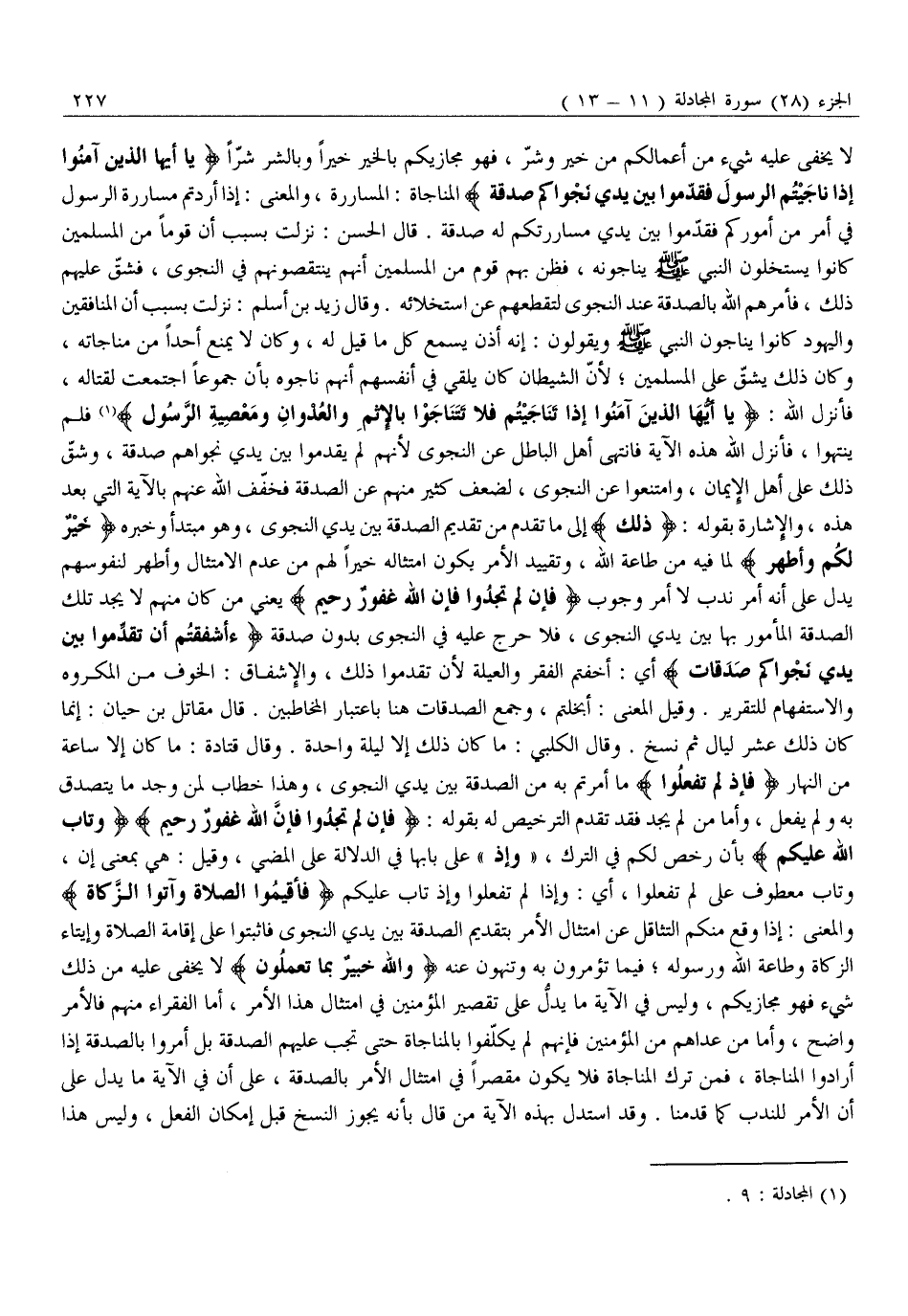 لَا يَخْفَى عَلَيْهِ شَيْءٌ مِنْ أَعْمَالِكُمْ مِنْ خَيْرٍ وَشَرٍّ، فَهُوَ مُجَازِيكُمْ بِالْخَيْرِ خَيْرًا وَبِالشَّرِّ شرّا يَا أَيُّهَا الَّذِينَ آمَنُوا إِذا ناجَيْتُمُ الرَّسُولَ فَقَدِّمُوا بَيْنَ يَدَيْ نَجْواكُمْ صَدَقَةً الْمُنَاجَاةُ: الْمُسَارَرَةُ، وَالْمَعْنَى: إِذَا أَرَدْتُمْ مُسَارَرَةَ الرَّسُولِ فِي أَمْرٍ مِنْ أُمُورِكُمْ فَقَدِّمُوا بَيْنَ يَدَيْ مُسَارَرَتِكُمْ لَهُ صَدَقَةً. قَالَ الْحَسَنُ: نَزَلَتْ بِسَبَبِ أَنَّ قَوْمًا مِنَ الْمُسْلِمِينَ كَانُوا يَسْتَخْلُونَ النَّبِيَّ صَلَّى اللَّهُ عَلَيْهِ وَسَلَّمَ يُنَاجُونَهُ، فَظَنَّ بِهِمْ قَوْمٌ مِنَ الْمُسْلِمِينَ أَنَّهُمْ يَنْتَقِصُونَهُمْ فِي النَّجْوَى، فَشَقَّ عَلَيْهِمْ ذَلِكَ، فَأَمَرَهُمُ اللَّهُ بِالصَّدَقَةِ عِنْدَ النَّجْوَى لِتَقْطَعَهُمْ عَنِ اسْتِخْلَائِهِ. وَقَالَ زَيْدُ بْنُ أَسْلَمَ: نَزَلَتْ بِسَبَبِ أَنَّ الْمُنَافِقِينَ وَالْيَهُودَ كَانُوا يُنَاجُونَ النَّبِيَّ صَلَّى اللَّهُ عَلَيْهِ وَسَلَّمَ وَيَقُولُونَ: إِنَّهُ أُذُنٌ يَسْمَعُ كُلَّ مَا قِيلَ لَهُ، وَكَانَ لَا يَمْنَعُ أَحَدًا مِنْ مُنَاجَاتِهِ، وَكَانَ ذَلِكَ يَشُقُّ عَلَى الْمُسْلِمِينَ لِأَنَّ الشَّيْطَانَ كَانَ يُلْقِي فِي أَنْفُسِهِمْ أَنَّهُمْ نَاجَوْهُ بِأَنَّ جُمُوعًا اجْتَمَعَتْ لِقِتَالِهِ، فأنزل الله: يَا أَيُّهَا الَّذِينَ آمَنُوا إِذا تَناجَيْتُمْ فَلا تَتَناجَوْا بِالْإِثْمِ وَالْعُدْوانِ وَمَعْصِيَةِ الرَّسُولِ «1» فَلَمْ يَنْتَهُوا، فَأَنْزَلَ اللَّهُ هَذِهِ الْآيَةَ فَانْتَهَى أَهْلُ الْبَاطِلِ عَنِ النَّجْوَى لِأَنَّهُمْ لَمْ يُقَدِّمُوا بَيْنَ يَدَيْ نَجْوَاهُمْ صَدَقَةً، وَشَقَّ ذَلِكَ عَلَى أَهْلِ الْإِيمَانِ، وَامْتَنَعُوا عَنِ النَّجْوَى، لِضَعْفِ كَثِيرٍ مِنْهُمْ عَنِ الصَّدَقَةِ فَخَفَّفَ اللَّهُ عَنْهُمْ بِالْآيَةِ الَّتِي بَعْدَ هَذِهِ، وَالْإِشَارَةُ بِقَوْلِهِ: ذلِكَ إِلَى مَا تَقَدَّمَ مِنْ تَقْدِيمِ الصَّدَقَةِ بَيْنَ يَدَيِ النَّجْوَى، وَهُوَ مُبْتَدَأٌ وَخَبَرُهُ خَيْرٌ لَكُمْ وَأَطْهَرُ لِمَا فِيهِ من طاعة الله، وتقييد الأمر يكون امْتِثَالِهِ خَيْرًا لَهُمْ مِنْ عَدَمِ الِامْتِثَالِ وَأَطْهَرَ لِنُفُوسِهِمْ يَدُلُّ عَلَى أَنَّهُ أَمْرُ نَدْبٍ لَا أَمْرُ وُجُوبٍ فَإِنْ لَمْ تَجِدُوا فَإِنَّ اللَّهَ غَفُورٌ رَحِيمٌ يَعْنِي مَنْ كَانَ مِنْهُمْ لَا يَجِدُ تِلْكَ الصَّدَقَةَ الْمَأْمُورَ بِهَا بَيْنَ يَدَيِ النَّجْوَى، فَلَا حَرَجَ عَلَيْهِ فِي النَّجْوَى بِدُونِ صَدَقَةٍ أَأَشْفَقْتُمْ أَنْ تُقَدِّمُوا بَيْنَ يَدَيْ نَجْواكُمْ صَدَقاتٍ أَيْ: أَخِفْتُمُ الْفَقْرَ وَالْعَيْلَةَ لِأَنْ تُقَدِّمُوا ذَلِكَ، وَالْإِشْفَاقُ: الْخَوْفُ مِنَ الْمَكْرُوهِ وَالِاسْتِفْهَامُ لِلتَّقْرِيرِ. وَقِيلَ الْمَعْنَى: أَبَخِلْتُمْ، وَجَمَعَ الصَّدَقَاتِ هُنَا بِاعْتِبَارِ الْمُخَاطَبِينَ. قَالَ مُقَاتِلُ بْنُ حَيَّانَ: إِنَّمَا كَانَ ذَلِكَ عَشْرَ لَيَالٍ ثُمَّ نُسِخَ. وَقَالَ الْكَلْبِيُّ: مَا كَانَ ذَلِكَ إِلَّا لَيْلَةً وَاحِدَةً. وَقَالَ قَتَادَةُ: مَا كَانَ إِلَّا سَاعَةً مِنَ النَّهَارِ فَإِذْ لَمْ تَفْعَلُوا مَا أُمِرْتُمْ بِهِ مِنَ الصَّدَقَةِ بَيْنَ يَدَيِ النَّجْوَى، وَهَذَا خِطَابٌ لِمَنْ وَجَدَ مَا يَتَصَدَّقُ بِهِ وَلَمْ يَفْعَلْ، وَأَمَّا مَنْ لَمْ يَجِدْ فَقَدْ تَقَدَّمَ التَّرْخِيصُ لَهُ بِقَوْلِهِ: فَإِنْ لَمْ تَجِدُوا فَإِنَّ اللَّهَ غَفُورٌ رَحِيمٌ وَتابَ اللَّهُ عَلَيْكُمْ بِأَنْ رَخَّصَ لَكُمْ في الترك، «وإذ» عَلَى بَابِهَا فِي الدَّلَالَةِ عَلَى الْمُضِيِّ، وَقِيلَ: هي بِمَعْنَى إِنْ، وَتَابَ مَعْطُوفٌ عَلَى لَمْ تَفْعَلُوا، أَيْ: وَإِذَا لَمْ تَفْعَلُوا وَإِذْ 