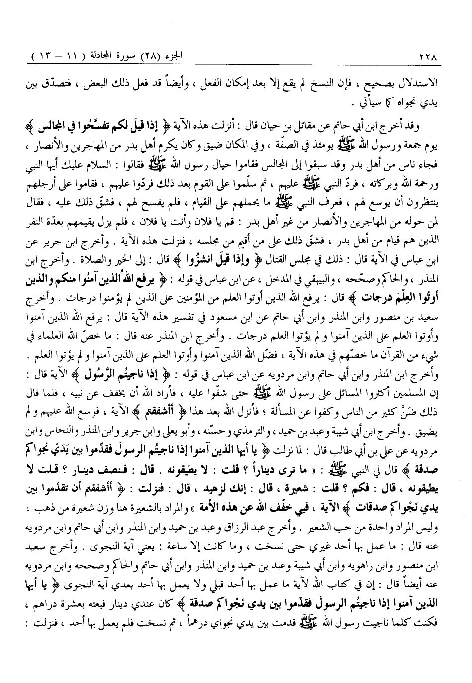 وَقَدْ أَخْرَجَ ابْنُ أَبِي حَاتِمٍ عَنْ مُقَاتِلِ بْنِ حَيَّانَ قَالَ: أُنْزِلَتْ هَذِهِ الْآيَةُ إِذا قِيلَ لَكُمْ تَفَسَّحُوا فِي الْمَجالِسِ يَوْمَ جُمُعَةٍ وَرَسُولُ اللَّهِ صَلَّى اللَّهُ عَلَيْهِ وَسَلَّمَ يَوْمَئِذٍ فِي الصُّفَّةِ، وَفِي الْمَكَانِ ضِيقٌ وَكَانَ يُكْرِمُ أَهْلَ بَدْرٍ مِنَ الْمُهَاجِرِينَ وَالْأَنْصَارِ، فَجَاءَ نَاسٌ مِنْ أَهْلِ بَدْرٍ وَقَدْ سُبِقُوا إِلَى الْمَجَالِسِ فَقَامُوا حِيَالَ رَسُولِ اللَّهِ صَلَّى اللَّهُ عَلَيْهِ وَسَلَّمَ فَقَالُوا: السَّلَامُ عَلَيْكَ أَيُّهَا النَّبِيُّ وَرَحْمَةُ اللَّهِ وَبَرَكَاتُهُ، فَرَدَّ النَّبِيُّ صَلَّى اللَّهُ عَلَيْهِ وَسَلَّمَ عَلَيْهِمْ، ثُمَّ سَلَّمُوا عَلَى الْقَوْمِ بَعْدَ ذَلِكَ فَرَدُّوا عَلَيْهِمْ، فَقَامُوا عَلَى أَرْجُلِهِمْ يَنْتَظِرُونَ أَنْ يُوَسَّعَ لَهُمْ، فَعَرَفَ النَّبِيُّ صَلَّى اللَّهُ عَلَيْهِ وَسَلَّمَ مَا يَحْمِلُهُمْ عَلَى الْقِيَامِ، فَلَمْ يُفْسَحْ لَهُمْ، فَشَقَّ ذَلِكَ عَلَيْهِ، فَقَالَ لِمَنْ حَوْلَهُ مِنَ الْمُهَاجِرِينَ وَالْأَنْصَارِ مِنْ غَيْرِ أَهْلِ بَدْرٍ: قُمْ يَا فُلَانُ وَأَنْتَ يَا فُلَانُ، فَلَمْ يَزَلْ يُقِيمُهُمْ بِعِدَّةِ النَّفَرِ الَّذِينَ هُمْ قِيَامٌ مِنْ أَهْلِ بَدْرٍ، فَشَقَّ ذَلِكَ عَلَى مَنْ أُقِيمَ مِنْ مَجْلِسِهِ، فَنَزَلَتْ هَذِهِ الْآيَةَ. وَأَخْرَجَ ابْنُ جَرِيرٍ عَنِ ابْنِ عَبَّاسٍ فِي الْآيَةِ قَالَ: ذَلِكَ فِي مَجْلِسِ الْقِتَالِ وَإِذا قِيلَ انْشُزُوا قَالَ: إِلَى الْخَيْرِ وَالصَّلَاةِ. وَأَخْرَجَ ابْنُ الْمُنْذِرِ، وَالْحَاكِمُ وَصَحَّحَهُ، وَالْبَيْهَقِيُّ فِي الْمَدْخَلِ، عَنِ ابْنِ عَبَّاسٍ فِي قَوْلِهِ: يَرْفَعِ اللَّهُ الَّذِينَ آمَنُوا مِنْكُمْ وَالَّذِينَ أُوتُوا الْعِلْمَ دَرَجاتٍ قَالَ: يَرْفَعُ اللَّهُ الَّذِينَ أُوتُوا الْعِلْمَ مِنَ الْمُؤْمِنِينَ عَلَى الَّذِينَ لَمْ يُؤْمِنُوا دَرَجَاتٍ. وَأَخْرَجَ سَعِيدُ بْنُ مَنْصُورٍ وَابْنُ الْمُنْذِرِ وَابْنُ أَبِي حَاتِمٍ عَنِ ابْنِ مَسْعُودٍ فِي تَفْسِيرِ هَذِهِ الآية قال: يرفع اللَّهُ الَّذِينَ آمَنُوا وَأُوتُوا الْعِلْمَ عَلَى الَّذِينَ آمَنُوا وَلَمْ يُؤْتَوُا الْعِلْمَ دَرَجَاتٍ. وَأَخْرَجَ ابْنُ الْمُنْذِرِ عَنْهُ قَالَ: مَا خَصَّ اللَّهُ الْعُلَمَاءَ فِي شَيْءٍ مِنَ الْقُرْآنِ مَا خَصَّهُمْ فِي هَذِهِ الْآيَةِ، فَضَّلَ اللَّهُ الَّذِينَ آمَنُوا وَأُوتُوا الْعِلْمَ عَلَى الَّذِينَ آمَنُوا وَلَمْ يُؤْتَوُا الْعِلْمَ.