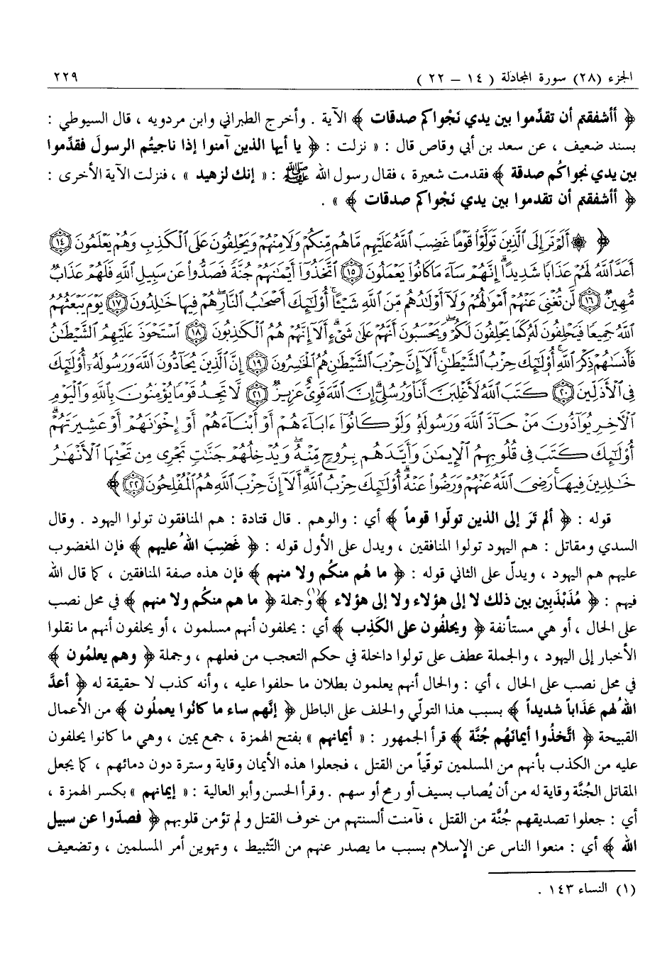 قَوْلُهُ: أَلَمْ تَرَ إِلَى الَّذِينَ تَوَلَّوْا قَوْماً أَيْ: وَالَوْهُمْ. قَالَ قَتَادَةُ: هُمُ الْمُنَافِقُونَ تَوَلَّوُا الْيَهُودَ. وَقَالَ السُّدِّيُّ وَمُقَاتِلٌ: هُمُ الْيَهُودُ تُوَلَّوُا الْمُنَافِقِينَ، وَيَدُلُّ عَلَى الْأَوَّلِ قَوْلُهُ: غَضِبَ اللَّهُ عَلَيْهِمْ فإن المغضوب عليهم هم الْيَهُودُ، وَيَدُلُّ عَلَى الثَّانِي قَوْلُهُ: مَا هُمْ مِنْكُمْ وَلا مِنْهُمْ فَإِنَّ هَذِهِ صِفَةُ الْمُنَافِقِينَ، كَمَا قَالَ اللَّهُ فِيهِمْ: مُذَبْذَبِينَ بَيْنَ ذلِكَ لَا إِلى هؤُلاءِ وَلا إِلى هؤُلاءِ «1» وَجُمْلَةُ مَا هُمْ مِنْكُمْ وَلا مِنْهُمْ فِي مَحَلِّ نَصْبٍ عَلَى الْحَالِ، أَوْ هِيَ مُسْتَأْنَفَةٌ وَيَحْلِفُونَ عَلَى الْكَذِبِ أَيْ: يَحْلِفُونَ أَنَّهُمْ مُسْلِمُونَ، أَوْ يَحْلِفُونَ أَنَّهُمْ مَا نَقَلُوا الْأَخْبَارَ إِلَى الْيَهُودِ، وَالْجُمْلَةُ عَطْفٌ عَلَى تَوَلَّوْا دَاخِلَةٌ فِي حكم التعجب مِنْ فِعْلِهِمْ، وَجُمْلَةُ وَهُمْ يَعْلَمُونَ فِي مَحَلِّ نَصْبٍ عَلَى الْحَالِ، أَيْ: وَالْحَالُ أَنَّهُمْ يَعْلَمُونَ بُطْلَانَ مَا حَلَفُوا عَلَيْهِ، وَأَنَّهُ كَذِبٌ لَا حَقِيقَةَ لَهُ أَعَدَّ اللَّهُ لَهُمْ عَذاباً شَدِيداً بِسَبَبِ هَذَا التَّوَلِّي وَالْحَلِفِ عَلَى الْبَاطِلِ إِنَّهُمْ ساءَ مَا كانُوا يَعْمَلُونَ مِنَ الْأَعْمَالِ الْقَبِيحَةِ اتَّخَذُوا أَيْمانَهُمْ جُنَّةً قَرَأَ الْجُمْهُورُ: «أَيْمَانَهُمْ» بِفَتْحِ الْهَمْزَةِ، جَمْعُ يَمِينٍ، وَهِيَ مَا كَانُوا يَحْلِفُونَ عَلَيْهِ مِنَ الْكَذِبِ بِأَنَّهُمْ مِنَ الْمُسْلِمِينَ تَوَقِّيًا مِنَ الْقَتْلِ، فَجَعَلُوا هَذِهِ الْأَيْمَانَ وِقَايَةً وَسُتْرَةً دُونَ دِمَائِهِمْ، كَمَا يَجْعَلُ الْمُقَاتِلُ الْجُنَّةَ وِقَايَةً لَهُ مِنْ أَنْ يُصَابَ بِسَيْفٍ أَوْ رُمْحٍ أَوْ سَهْمٍ. وَقَرَأَ الْحَسَنُ وَأَبُو الْعَالِيَةِ: «إِيمَانَهُمْ» بكسر الهمزة، أي: جعلوا تَصْدِيقَهُمْ جُنَّةً مِنَ الْقَتْلِ، فَآمَنَتْ أَلْسِنَتُهُمْ مِنْ خَوْفِ الْقَتْلِ وَلَمْ تُؤْمِنْ قُلُوبُهُمْ فَصَدُّوا عَنْ سَبِيلِ اللَّهِ أَيْ: مَنَعُوا النَّاسَ عَنِ الْإِسْلَامِ بِسَبَبِ مَا يَصْدُرُ عَنْهُمْ مِنَ التَّثْبِيطِ، وَتَهْوِينِ أمر المسلمين، وتضعيف