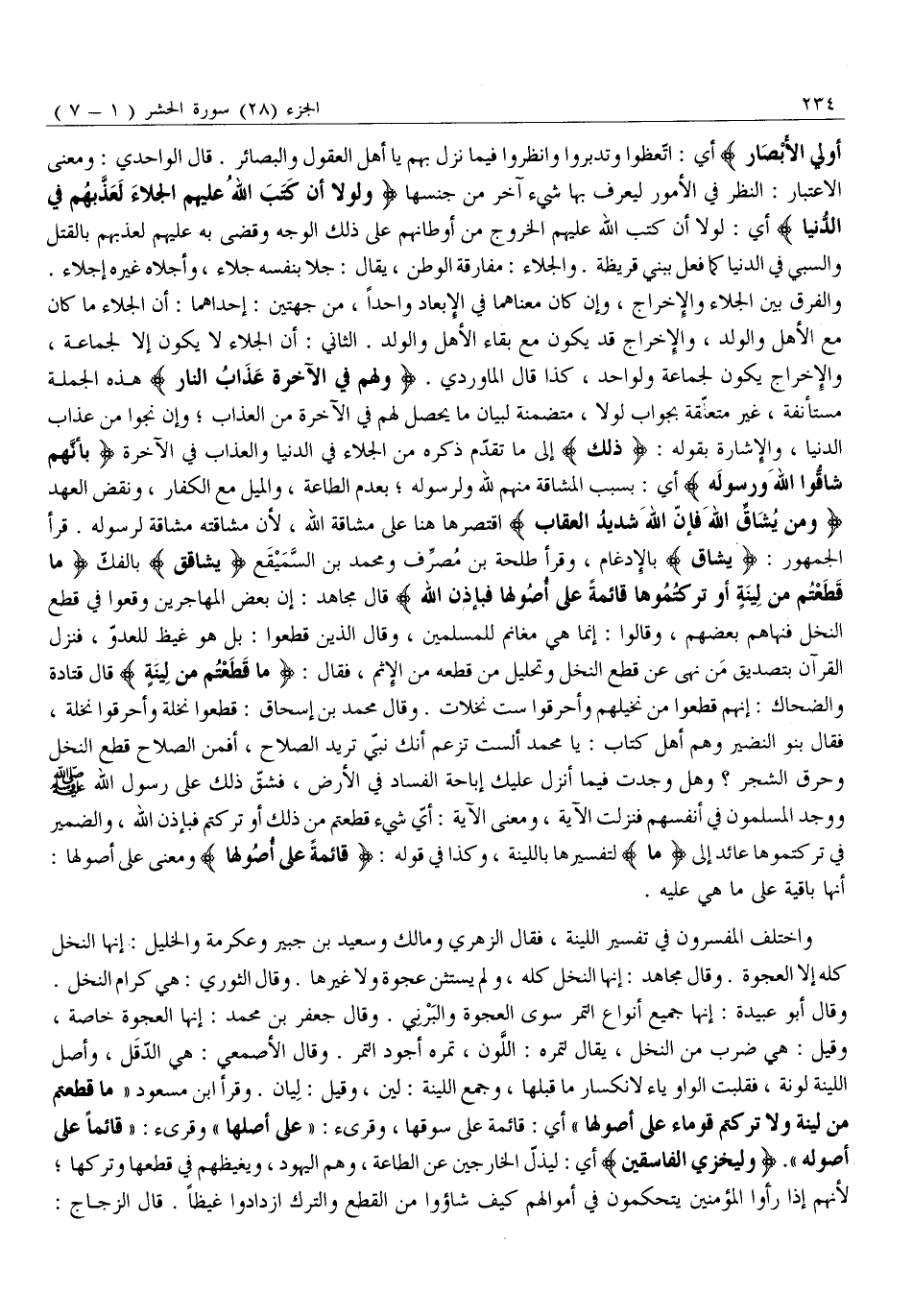وَالْفَرْقُ بَيْنَ الْجَلَاءِ وَالْإِخْرَاجِ، وَإِنْ كَانَ مَعْنَاهُمَا فِي الْإِبْعَادِ وَاحِدًا، مِنْ جِهَتَيْنِ: إِحْدَاهُمَا: أَنَّ الْجَلَاءَ مَا كَانَ مَعَ الْأَهْلِ وَالْوَلَدِ، وَالْإِخْرَاجَ قَدْ يَكُونُ مَعَ بَقَاءِ الْأَهْلِ وَالْوَلَدِ. الثَّانِي: أَنَّ الْجَلَاءَ لَا يَكُونُ إِلَّا لِجَمَاعَةٍ، وَالْإِخْرَاجَ يَكُونُ لِجَمَاعَةٍ وَلِوَاحِدٍ، كَذَا قَالَ الْمَاوَرْدِيُّ. وَلَهُمْ فِي الْآخِرَةِ عَذابُ النَّارِ هَذِهِ الْجُمْلَةُ مُسْتَأْنَفَةٌ، غَيْرُ مُتَعَلِّقَةٍ بِجَوَابِ لَوْلَا، مُتَضَمِّنَةٌ لِبَيَانِ مَا يَحْصُلُ لَهُمْ فِي الْآخِرَةِ مِنَ الْعَذَابِ وَإِنْ نَجَوْا مِنْ عَذَابِ الدُّنْيَا، وَالْإِشَارَةُ بِقَوْلِهِ: ذلِكَ إِلَى مَا تَقَدَّمَ ذِكْرُهُ مِنَ الْجَلَاءِ فِي الدُّنْيَا وَالْعَذَابِ فِي الْآخِرَةِ بِأَنَّهُمْ شَاقُّوا اللَّهَ وَرَسُولَهُ أَيْ: بِسَبَبِ الْمُشَاقَّةِ مِنْهُمْ لِلَّهِ وَلِرَسُولِهِ بِعَدَمِ الطَّاعَةِ، وَالْمَيْلِ مَعَ الْكُفَّارِ، وَنَقْضِ الْعَهْدِ وَمَنْ يُشَاقِّ اللَّهَ فَإِنَّ اللَّهَ شَدِيدُ الْعِقابِ اقتصرها هنا عَلَى مُشَاقَّةِ اللَّهِ، لِأَنَّ مُشَاقَّتَهُ مُشَاقَّةٌ لِرَسُولِهِ. قَرَأَ الْجُمْهُورُ: يُشَاقِّ بِالْإِدْغَامِ، وَقَرَأَ طَلْحَةُ بْنُ مصرّف ومحمد بن السّميقع يُشَاقِقُ بِالْفَكِّ مَا قَطَعْتُمْ مِنْ لِينَةٍ أَوْ تَرَكْتُمُوها قائِمَةً عَلى أُصُولِها فَبِإِذْنِ اللَّهِ قَالَ مُجَاهِدٌ: إِنَّ بَعْضَ الْمُهَاجِرِينَ وَقَعُوا فِي قَطْعِ النَّخْلِ فَنَهَاهُمْ بَعْضُهُمْ، وَقَالُوا: إِنَّمَا هِيَ مَغَانِمُ لِلْمُسْلِمِينَ، وَقَالَ الَّذِينَ قَطَعُوا: بَلْ هُوَ غَيْظٌ لِلْعَدُوِّ، فَنَزَلَ الْقُرْآنُ بِتَصْدِيقِ مَنْ نَهَى عَنْ قَطْعِ النَّخْلِ وَتَحْلِيلِ مَنْ قَطَعَهُ مِنَ الْإِثْمِ، فَقَالَ: مَا قَطَعْتُمْ مِنْ لِينَةٍ قَالَ قَتَادَةُ وَالضَّحَّاكُ: إِنَّهُمْ قَطَعُوا مِنْ نَخِيلِهِمْ وَأَحْرَقُوا سِتَّ نخلات. وقال محمد بن إسحاق: قَطَعُوا نَخْلَةً وَأَحْرَقُوا نَخْلَةً، فَقَالَ بَنُو النَّضِيرِ وَهُمْ أَهْلُ كِتَابٍ: يَا مُحَمَّدُ أَلَسْتَ تَزْعُمُ أَنَّكَ نَبِيٌّ تُرِيدُ الصَّلَاحَ، أَفَمِنَ الصَّلَاحِ قَطْعُ النَّخْلِ وَحَرْقُ الشَّجَرِ؟ وَهَلْ وَجَدْتَ فِيمَا أُنْزِلَ عَلَيْكَ إِبَاحَةَ الْفَسَادِ فِي الْأَرْضِ، فَشَقَّ ذَلِكَ عَلَى رَسُولِ اللَّهِ صَلَّى اللَّهُ عَلَيْهِ وَسَلَّمَ وَوَجَدَ الْمُسْلِمُونَ فِي أَنْفُسِهِمْ فَنَزَلَتِ الْآيَةُ، وَمَعْنَى الْآيَةِ: أَيُّ شَيْءٍ قَطَعْتُمْ مِنْ ذَلِكَ أَوْ تَرَكْتُمْ فَبِإِذْنِ اللَّهِ، وَالضَّمِيرُ فِي تَرَكْتُمُوها عَائِدٌ إِلَى مَا لِتَفْسِيرِهَا بِاللِّينَةِ، وَكَذَا فِي قَوْلِهِ: قائِمَةً عَلى أُصُولِها وَمَعْنَى عَلَى أُصُولِهَا: