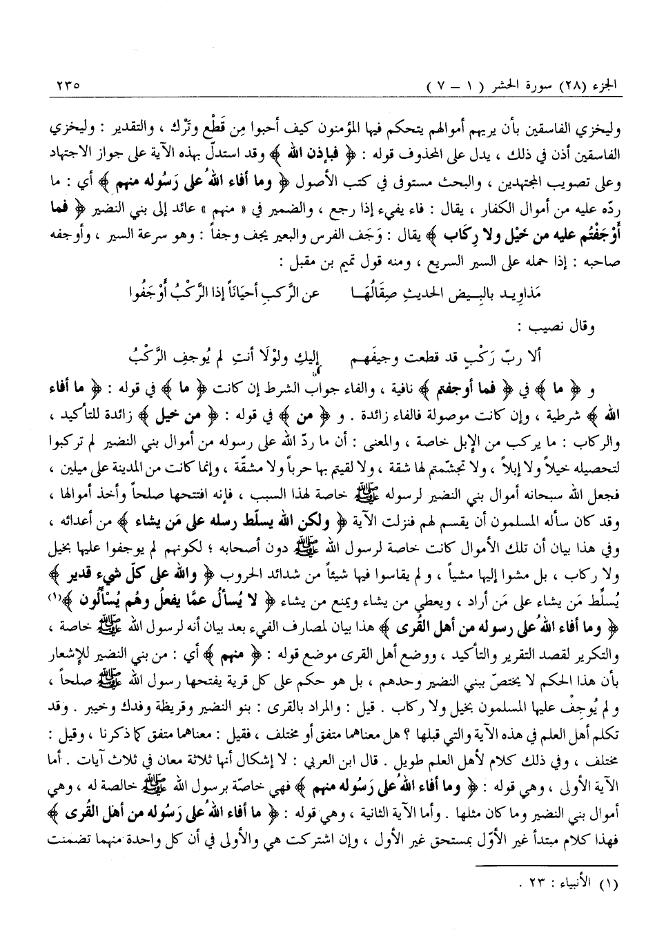 وَلِيُخْزِيَ الْفَاسِقِينَ بِأَنْ يُرِيَهُمْ أَمْوَالَهُمْ يَتَحَكَّمُ فِيهَا الْمُؤْمِنُونَ كَيْفَ أَحَبُّوا مِنْ قَطْعٍ وَتَرْكٍ، وَالتَّقْدِيرُ: وَلِيُخْزِيَ الْفَاسِقِينَ أَذِنَ فِي ذَلِكَ، يَدُلُّ عَلَى الْمَحْذُوفِ قَوْلُهُ: فَبِإِذْنِ اللَّهِ وَقَدِ اسْتُدِلَّ بِهَذِهِ الْآيَةِ عَلَى جَوَازِ الِاجْتِهَادِ وَعَلَى تَصْوِيبِ الْمُجْتَهِدِينَ، وَالْبَحْثُ مُسْتَوْفًى فِي كُتُبِ الْأُصُولِ وَما أَفاءَ اللَّهُ عَلى رَسُولِهِ مِنْهُمْ أَيْ: مَا رَدَّهُ عَلَيْهِ مِنْ أَمْوَالِ الْكُفَّارِ، يُقَالُ: فَاءَ يَفِيءُ إِذَا رَجَعَ، وَالضَّمِيرُ فِي «مِنْهُمْ» عَائِدٌ إِلَى بَنِي النَّضِيرِ فَما أَوْجَفْتُمْ عَلَيْهِ مِنْ خَيْلٍ وَلا رِكابٍ يُقَالُ: وَجَفَ الْفَرَسُ وَالْبَعِيرُ يَجِفُ وَجْفًا: وَهُوَ سُرْعَةُ السَّيْرِ، وَأَوْجَفَهُ صَاحِبُهُ: إِذَا حَمَلَهُ عَلَى السَّيْرِ السَّرِيعِ، وَمِنْهُ قَوْلُ تَمِيمِ بْنِ مُقْبِلٍ: