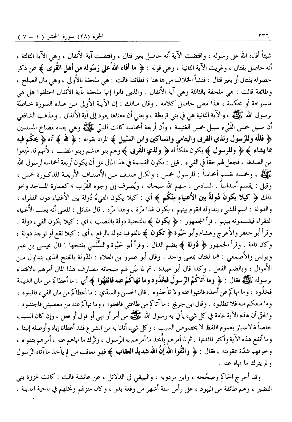 شَيْئًا أَفَاءَهُ اللَّهُ عَلَى رَسُولِهِ، وَاقْتَضَتِ الْآيَةُ أَنَّهُ حَاصِلٌ بِغَيْرِ قِتَالٍ، وَاقْتَضَتْ آيَةُ الْأَنْفَالِ، وَهِيَ الْآيَةُ الثَّالِثَةُ، أَنَّهُ حَاصِلٌ بِقِتَالٍ، وَعَرِيَتِ الْآيَةُ الثَّانِيَةُ، وَهِيَ قَوْلُهُ: مَا أَفاءَ اللَّهُ عَلى رَسُولِهِ مِنْ أَهْلِ الْقُرى عَنْ ذِكْرِ حُصُولِهِ بِقِتَالٍ أَوْ بِغَيْرِ قِتَالٍ، فَنَشَأَ الْخِلَافُ من ها هنا فَطَائِفَةٌ قَالَتْ: هِيَ مُلْحَقَةٌ بِالْأُولَى، وَهِيَ مَالُ الصُّلْحِ، وَطَائِفَةٌ قَالَتْ: هِيَ مُلْحَقَةٌ بِالثَّالِثَةِ وَهِيَ آيَةُ الْأَنْفَالِ. وَالَّذِينَ قَالُوا إِنَّهَا مُلْحَقَةٌ بِآيَةِ الْأَنْفَالِ اخْتَلَفُوا هَلْ هِيَ مَنْسُوخَةٌ أَوْ مُحْكَمَةٌ، هَذَا مَعْنَى حَاصِلِ كَلَامِهِ. وَقَالَ مَالِكٌ: إِنَّ الْآيَةَ الْأُولَى مِنْ هَذِهِ السُّورَةِ خَاصَّةٌ بِرَسُولِ اللَّهِ صَلَّى اللَّهُ عَلَيْهِ وَسَلَّمَ، وَالْآيَةَ الثَّانِيَةَ هِيَ فِي بَنِي قُرَيْظَةَ، وَيَعْنِي أَنَّ مَعْنَاهَا يَعُودُ إِلَى آيَةِ الْأَنْفَالِ. وَمَذْهَبُ الشَّافِعِيِّ أَنَّ سَبِيلَ خُمْسِ الْفَيْءِ سَبِيلُ خُمْسِ الْغَنِيمَةِ، وَأَنَّ أَرْبَعَةَ أَخْمَاسِهِ كَانَتْ لِلنَّبِيِّ صَلَّى اللَّهُ عَلَيْهِ وسلّم وهي بعده لمصالح الْمُسْلِمِينَ فَلِلَّهِ وَلِلرَّسُولِ وَلِذِي الْقُرْبى وَالْيَتامى وَالْمَساكِينِ وَابْنِ السَّبِيلِ الْمُرَادُ بِقَوْلِهِ: لِلَّهِ أَنَّهُ يَحْكُمُ فِيهِ بِمَا يَشَاءُ وَلِلرَّسُولِ يَكُونُ مِلْكًا لَهُ وَلِذِي الْقُرْبى وَهُمْ بَنُو هَاشِمٍ وَبَنُو الْمُطَّلِبِ، لِأَنَّهُمْ قَدْ مُنِعُوا مِنَ الصَّدَقَةِ، فَجُعِلَ لَهُمْ حَقًّا فِي الْفَيْءِ. قِيلَ: تَكُونُ الْقِسْمَةُ فِي هَذَا الْمَالِ عَلَى أَنْ يَكُونَ أَرْبَعَةُ أَخْمَاسِهِ لِرَسُولِ اللَّهِ صَلَّى اللَّهُ عَلَيْهِ وَسَلَّمَ، وَخُمُسُهُ يُقَسَّمُ أَخْمَاسًا: لِلرَّسُولِ خُمُسٌ، وَلِكُلِّ صِنْفٍ مِنَ الْأَصْنَافِ الْأَرْبَعَةِ الْمَذْكُورَةِ خُمُسٌ، وَقِيلَ: يُقَسَّمُ أَسْدَاسًا. السَّادِسُ: سَهْمُ اللَّهِ سُبْحَانَهُ، وَيُصْرَفُ إِلَى وُجُوهِ الْقُرَبِ كَعِمَارَةِ الْمَسَاجِدِ وَنَحْوِ ذَلِكَ كَيْ لَا يَكُونَ دُولَةً بَيْنَ الْأَغْنِياءِ مِنْكُمْ أَيْ: كَيْلَا يَكُونَ الْفَيْءُ دُولَةً بَيْنَ الْأَغْنِيَاءِ دُونَ الْفُقَرَاءِ، وَالدُّولَةُ: اسْمٌ لِلشَّيْءِ يَتَدَاوَلُهُ الْقَوْمُ بَيْنَهُمْ، يَكُونُ لِهَذَا مَرَّةً، وَلِهَذَا مَرَّةً. قَالَ مُقَاتِلٌ: الْمَعْنَى أَنَّهُ يَغْلِبُ الْأَغْنِيَاءُ الْفُقَرَاءَ فَيُقَسِّمُونَهُ بَيْنَهُمْ. قَرَأَ الْجُمْهُورُ: يَكُونَ بِالتَّحْتِيَّةِ دُولَةً بِالنَّصْبِ، أَيْ: كَيْلَا يَكُونَ الْفَيْءُ دُولَةً.