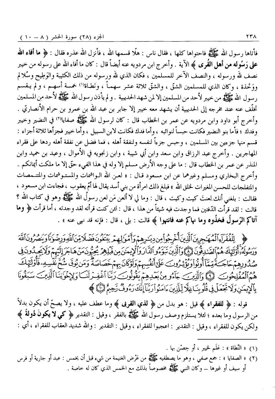 قَوْلُهُ: لِلْفُقَراءِ قِيلَ: هُوَ بَدَلٌ مِنْ لِذِي الْقُرْبى وَمَا عُطِفَ عَلَيْهِ، وَلَا يَصِحُّ أَنْ يَكُونَ بَدَلًا مِنَ الرَّسُولِ وَمَا بَعْدَهُ لِئَلَّا يَسْتَلْزِمَ وَصْفَ رَسُولِ اللَّهِ صَلَّى اللَّهُ عليه وسلّم بالفقر، وقيل: التقدير كَيْ لا يَكُونَ دُولَةً وَلَكِنْ يَكُونُ لِلْفُقَرَاءِ، وَقِيلَ: التَّقْدِيرُ: اعْجَبُوا لِلْفُقَرَاءِ، وَقِيلَ: التَّقْدِيرُ: وَاللَّهُ شَدِيدُ الْعِقَابِ للفقراء، أي: