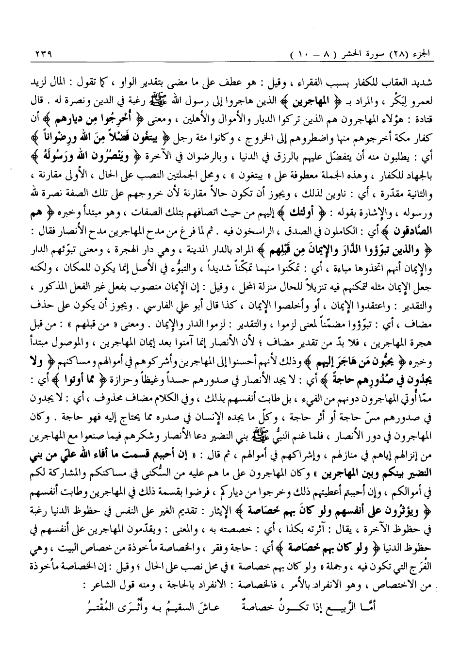 شَدِيدُ الْعِقَابِ لِلْكَفَّارِ بِسَبَبِ الْفُقَرَاءِ، وَقِيلَ: هُوَ عَطْفٌ عَلَى مَا مَضَى بِتَقْدِيرِ الْوَاوِ، كَمَا تَقُولُ: الْمَالَ لِزَيْدٍ لِعَمْرٍو لِبَكْرٍ، وَالْمُرَادُ بِ الْمُهاجِرِينَ الَّذِينَ هَاجَرُوا إِلَى رَسُولِ اللَّهِ صَلَّى اللَّهُ عَلَيْهِ وَسَلَّمَ رَغْبَةً فِي الدِّينِ وَنُصْرَةً لَهُ. قَالَ قَتَادَةُ: هَؤُلَاءِ الْمُهَاجِرُونَ هُمُ الَّذِينَ تَرَكُوا الدِّيَارَ وَالْأَمْوَالَ وَالْأَهْلِينَ، وَمَعْنَى أُخْرِجُوا مِنْ دِيارِهِمْ أَنَّ كُفَّارَ مَكَّةَ أَخْرَجُوهُمْ مِنْهَا وَاضْطَرُّوهُمْ إِلَى الْخُرُوجِ، وَكَانُوا مِائَةَ رَجُلٍ يَبْتَغُونَ فَضْلًا مِنَ اللَّهِ وَرِضْواناً أَيْ: يَطْلُبُونَ مِنْهُ أَنْ يَتَفَضَّلَ عَلَيْهِمْ بِالرِّزْقِ فِي الدُّنْيَا، وَبِالرِّضْوَانِ فِي الْآخِرَةِ وَيَنْصُرُونَ اللَّهَ وَرَسُولَهُ بِالْجِهَادِ لِلْكُفَّارِ، وَهَذِهِ الْجُمْلَةُ مَعْطُوفَةٌ عَلَى «يَبْتَغُونَ» ، وَمَحَلُّ الْجُمْلَتَيْنِ النَّصْبُ عَلَى الْحَالِ، الْأُولَى مُقَارِنَةً، وَالثَّانِيَةُ مُقَدَّرَةً، أَيْ: نَاوِينَ لِذَلِكَ، وَيَجُوزُ أَنْ تَكُونَ حَالًا مُقَارِنَةً لِأَنَّ خُرُوجَهُمْ عَلَى تِلْكَ الصِّفَةِ نُصْرَةٌ لِلَّهِ وَرَسُولِهِ، وَالْإِشَارَةُ بِقَوْلِهِ: أُولئِكَ إِلَيْهِمْ مِنْ حَيْثُ اتِّصَافِهِمْ بِتِلْكَ الصِّفَاتِ، وَهُوَ مُبْتَدَأٌ وَخَبَرُهُ هُمُ الصَّادِقُونَ أَيِ: الْكَامِلُونَ فِي الصِّدْقِ، الرَّاسِخُونَ فِيهِ. ثُمَّ لَمَّا فَرَغَ مِنْ مَدْحِ الْمُهَاجِرِينَ مَدَحَ الأنصار فقال:
