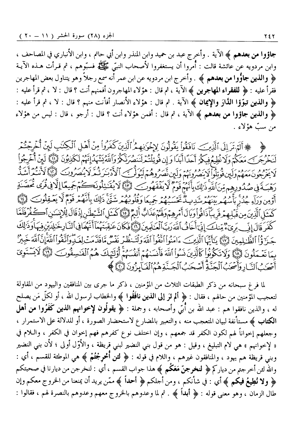 وَالَّذِينَ جاؤُ مِنْ بَعْدِهِمْ الْآيَةَ. وَأَخْرَجَ عَبْدُ بْنُ حُمَيْدٍ وَابْنُ الْمُنْذِرِ وَابْنُ أَبِي حَاتِمٍ، وَابْنُ الْأَنْبَارِيِّ فِي الْمَصَاحِفِ، وَابْنُ مَرْدَوَيْهِ عَنْ عَائِشَةَ قَالَتْ: أُمِرُوا أَنْ يَسْتَغْفِرُوا لِأَصْحَابِ النَّبِيِّ صَلَّى اللَّهُ عَلَيْهِ وَسَلَّمَ فَسَبُّوهُمْ، ثُمَّ قَرَأَتْ هَذِهِ الْآيَةَ وَالَّذِينَ جاؤُ مِنْ بَعْدِهِمْ. وَأَخْرَجَ ابْنُ مَرْدَوَيْهِ عَنِ ابْنِ عُمَرَ أَنَّهُ سَمِعَ رَجُلًا وَهُوَ يَتَنَاوَلُ بَعْضَ الْمُهَاجِرِينَ فَقَرَأَ عَلَيْهِ: لِلْفُقَراءِ الْمُهاجِرِينَ الْآيَةَ، ثُمَّ قَالَ: هَؤُلَاءِ الْمُهَاجِرُونَ أَفَمِنِهُمْ أَنْتَ؟ قَالَ: لَا، ثم قرأ عليه:
