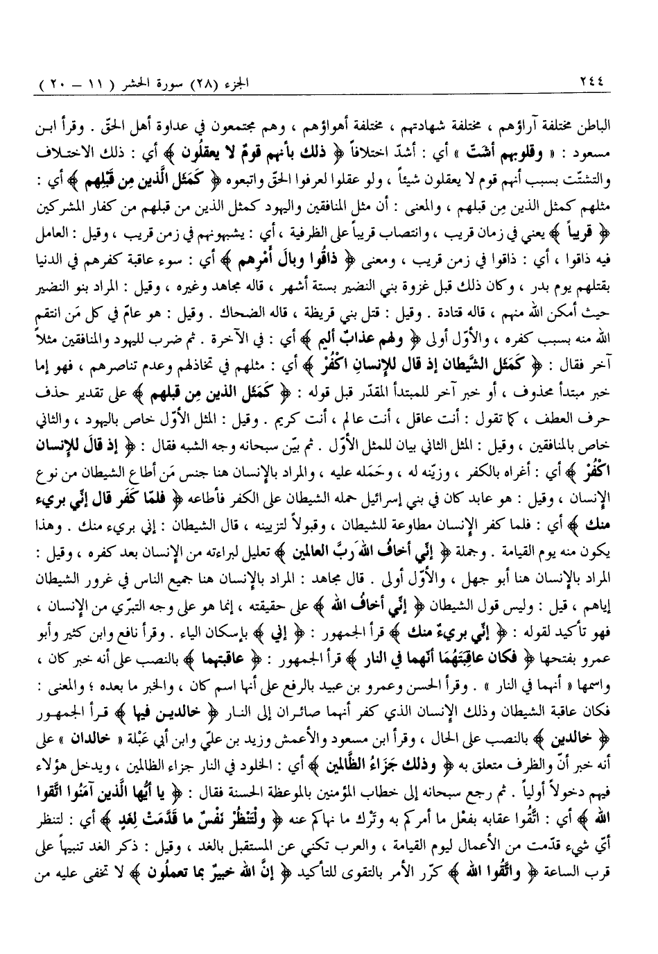 فَكَانَ عَاقِبَةُ الشَّيْطَانِ وَذَلِكَ الْإِنْسَانِ الَّذِي كَفَرَ أَنَّهُمَا صَائِرَانِ إِلَى النَّارِ خالِدَيْنِ فِيها قَرَأَ الْجُمْهُورُ خالِدَيْنِ بِالنَّصْبِ عَلَى الْحَالِ، وَقَرَأَ ابْنُ مَسْعُودٍ وَالْأَعْمَشُ وَزَيْدُ بْنُ عَلِيٍّ وَابْنُ أَبِي عَبْلَةَ «خَالِدَانِ» عَلَى أَنَّهُ خَبَرُ أَنَّ وَالظَّرْفُ مُتَعَلِّقٌ بِهِ وَذلِكَ جَزاءُ الظَّالِمِينَ أَيِ: الْخُلُودُ فِي النَّارِ جَزَاءُ الظَّالِمِينَ، وَيَدْخُلُ هَؤُلَاءِ فِيهِمْ دُخُولًا أَوَلِيًّا. ثُمَّ رَجَعَ سُبْحَانَهُ إِلَى خِطَابِ المؤمنين بالموعظة الحسنة فقال: يا أَيُّهَا الَّذِينَ آمَنُوا اتَّقُوا اللَّهَ أَيِ: اتَّقُوا عِقَابَهُ بِفِعْلِ مَا أَمَرَكُمْ بِهِ وَتَرْكِ مَا نَهَاكُمْ عَنْهُ وَلْتَنْظُرْ نَفْسٌ مَا قَدَّمَتْ لِغَدٍ أَيْ: لِتَنْظُرَ أَيَّ شَيْءٍ قَدَّمَتْ مِنَ الْأَعْمَالِ لِيَوْمِ الْقِيَامَةِ، وَالْعَرَبُ تُكَنِّي عَنِ الْمُسْتَقْبَلِ بِالْغَدِ، وَقِيلَ: ذِكْرُ الْغَدِ تَنْبِيهًا عَلَى قُرْبِ السَّاعَةِ وَاتَّقُوا اللَّهَ كَرَّرَ الْأَمْرَ بِالتَّقْوَى لِلتَّأْكِيدِ إِنَّ اللَّهَ خَبِيرٌ بِما تَعْمَلُونَ لَا تَخْفَى عَلَيْهِ مِنْ