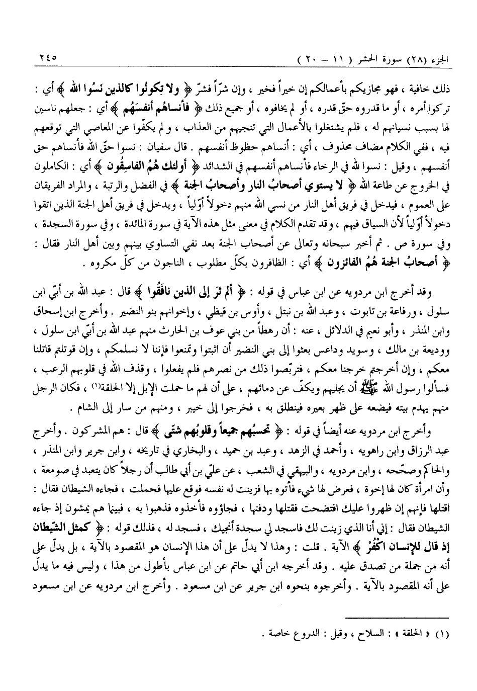 تَرَكُوا أَمْرَهُ، أَوْ مَا قَدَرُوهُ حَقَّ قَدْرِهِ، أَوْ لَمْ يَخَافُوهُ، أَوْ جَمِيعُ ذَلِكَ فَأَنْساهُمْ أَنْفُسَهُمْ أَيْ: جَعَلَهُمْ نَاسِينَ لَهَا بِسَبَبِ نِسْيَانِهِمْ لَهُ، فَلَمْ يَشْتَغِلُوا بِالْأَعْمَالِ الَّتِي تُنْجِيهُمْ مِنَ الْعَذَابِ، وَلَمْ يَكُفُّوا عَنِ الْمَعَاصِي الَّتِي تُوقِعُهُمْ فِيهِ، فَفِي الْكَلَامِ مُضَافٌ مَحْذُوفٌ، أَيْ: أَنْسَاهُمْ حُظُوظَ أَنْفُسِهِمْ. قَالَ سُفْيَانُ: نَسُوا حَقَّ اللَّهِ فَأَنْسَاهُمْ حَقَّ أَنْفُسِهِمْ، وَقِيلَ: نسوا لله فِي الرَّخَاءِ فَأَنْسَاهُمْ أَنْفُسَهُمْ فِي الشَّدَائِدِ أُولئِكَ هُمُ الْفاسِقُونَ أَيِ: الْكَامِلُونَ فِي الْخُرُوجِ عَنْ طَاعَةِ اللَّهِ لَا يَسْتَوِي أَصْحابُ النَّارِ وَأَصْحابُ الْجَنَّةِ فِي الْفَضْلِ وَالرُّتْبَةِ، وَالْمُرَادُ الْفَرِيقَانِ عَلَى الْعُمُومِ، فَيَدْخُلُ فِي فَرِيقِ أَهْلِ النَّارِ مَنْ نَسِيَ اللَّهَ مِنْهُمْ دُخُولًا أَوَلِيًّا، وَيَدْخُلُ فِي فَرِيقِ أَهْلِ الْجَنَّةِ الَّذِينَ اتَّقَوْا دُخُولًا أَوَلِيًّا لِأَنَّ السِّيَاقَ فِيهِمْ، وَقَدْ تَقَدَّمَ الْكَلَامُ فِي مَعْنَى مِثْلِ هَذِهِ الْآيَةِ فِي سُورَةِ الْمَائِدَةِ، وَفِي سُورَةِ السَّجْدَةِ، وَفِي سُورَةِ ص. ثُمَّ أَخْبَرَ سُبْحَانَهُ وَتَعَالَى عَنْ أَصْحَابِ الْجَنَّةِ بَعْدَ نَفْيِ التَّسَاوِي بَيْنَهُمْ وَبَيْنَ أَهْلِ النَّارِ فَقَالَ: