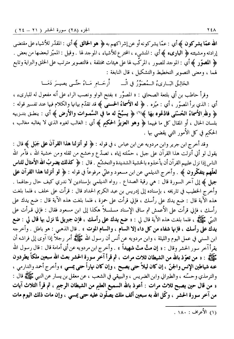 وَأَخْرَجَ الْخَطِيبُ فِي تَارِيخِهِ، بِإِسْنَادِهِ إِلَى إِدْرِيسَ بْنِ عَبْدِ الْكَرِيمِ الْحَدَّادِ قَالَ: قَرَأْتُ عَلَى خَلَفٍ، فَلَمَّا بَلَغْتُ هَذِهِ الْآيَةَ قَالَ: ضَعْ يَدَكَ عَلَى رَأْسِكَ، فَإِنِّي قَرَأْتُ عَلَى حَمْزَةَ، فَلَمَّا بَلَغْتُ هَذِهِ الْآيَةَ قَالَ: ضَعْ يَدَكَ عَلَى رَأْسِكَ، فَإِنِّي قَرَأْتُ عَلَى الْأَعْمَشِ ثُمَّ سَاقَ الْإِسْنَادُ مُسَلْسَلًا هَكَذَا إِلَى ابْنِ مَسْعُودٍ فَقَالَ: فَإِنِّي قَرَأْتُ عَلَى النَّبِيِّ صَلَّى اللَّهُ عَلَيْهِ وَسَلَّمَ، فَلَمَّا بَلَغْتُ هَذِهِ الْآيَةَ قَالَ لِي: «ضَعْ يَدُكَ عَلَى رَأْسِكَ، فَإِنَّ جِبْرِيلَ لَمَّا نَزَلَ بِهَا قَالَ لِي: ضَعْ يَدَكَ عَلَى رَأْسِكَ، فَإِنَّهَا شِفَاءٌ مِنْ كُلِّ دَاءٍ إِلَّا السَّامَ، وَالسَّامُ الْمَوْتُ» . قَالَ الذَّهَبِيُّ: هُوَ بَاطِلٌ. وَأَخْرَجَهُ ابْنُ السُّنِّيُّ فِي عَمَلِ الْيَوْمِ وَاللَّيْلَةِ، وَابْنُ مَرْدَوَيْهِ عَنْ أَنَسٍ أَنَّ رَسُولَ اللَّهِ صَلَّى اللَّهُ عَلَيْهِ وَسَلَّمَ أَمَرَ رَجُلًا إِذَا آوى إلى فراشه أن يقرأ آخر سور الْحَشْرِ وَقَالَ: «إِنْ مُتَّ مُتَّ شَهِيدًا» . وَأَخْرَجَ ابْنُ مَرْدَوَيْهِ عَنْ أَبِي أُمَامَةَ قَالَ: قَالَ رَسُولُ اللَّهِ صَلَّى اللَّهُ عَلَيْهِ وسلم: «من تَعَوَّذَ بِاللَّهِ مِنَ الشَّيْطَانِ ثَلَاثَ مَرَّاتٍ، ثُمَّ قَرَأَ آخِرَ سُورَةِ الْحَشْرِ بَعَثَ اللَّهُ سَبْعِينَ مَلَكًا يَطْرُدُونَ عَنْهُ شَيَاطِينَ الْإِنْسِ وَالْجِنِّ، إِنْ كَانَ لَيْلًا حَتَّى يُصْبِحَ، وَإِنْ كَانَ نِهَارًا حَتَّى يُمْسِيَ» وَأَخْرَجَ أَحْمَدُ وَالدَّارِمِيُّ، وَالتِّرْمِذِيُّ وَحَسَّنَهُ، وَالطَّبَرَانِيُّ وَابْنُ الضُّرَيْسِ، وَالْبَيْهَقِيُّ فِي الشُّعَبِ، عَنْ مَعْقِلِ بْنِ يَسَارٍ عَنِ النَّبِيِّ صَلَّى اللَّهُ عَلَيْهِ وَسَلَّمَ قَالَ: