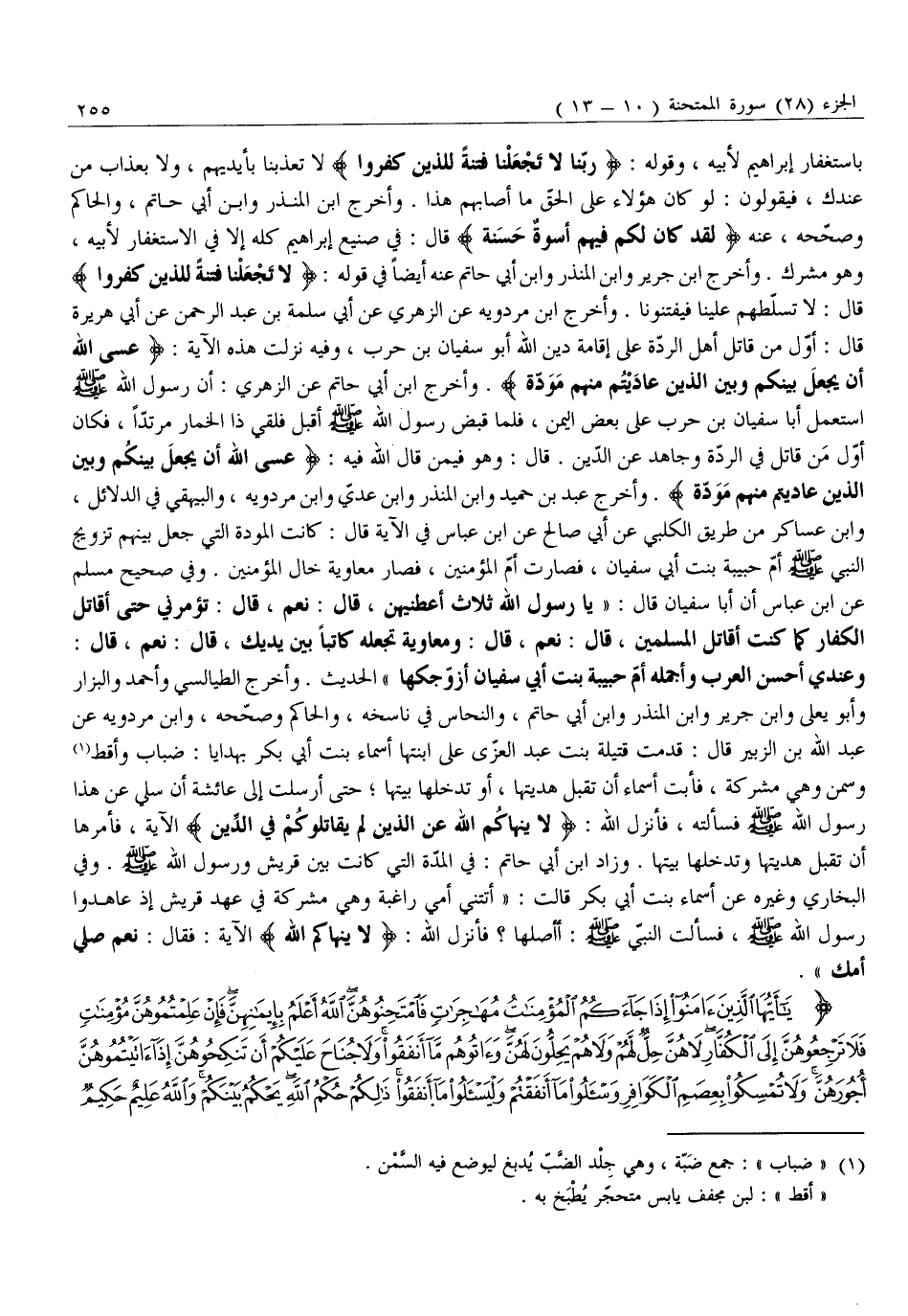 وَعِنْدِي أَحْسَنُ الْعَرَبِ وَأَجْمَلُهُ أُمُّ حَبِيبَةَ بِنْتُ أَبِي سُفْيَانَ أُزَوِّجُكَهَا» الْحَدِيثَ. وَأَخْرَجَ الطَّيَالِسِيُّ وَأَحْمَدُ وَالْبَزَّارُ وَأَبُو يَعْلَى وَابْنُ جَرِيرٍ وَابْنُ الْمُنْذِرِ وَابْنُ أَبِي حَاتِمٍ، وَالنَّحَّاسُ فِي نَاسِخِهِ، وَالْحَاكِمُ وَصَحَّحَهُ، وَابْنُ مَرْدَوَيْهِ عَنْ عَبْدِ اللَّهِ بْنِ الزُّبَيْرِ قَالَ: قَدِمَتْ قَتِيلَةُ بِنْتُ عَبْدِ الْعُزَّى عَلَى ابْنَتِهَا أَسْمَاءَ بِنْتِ أَبِي بَكْرٍ بِهَدَايَا: ضِبَابٍ وَأَقِطٍ «1» وَسَمْنٍ وَهِيَ مُشْرِكَةٌ، فَأَبَتْ أَسْمَاءُ أَنْ تَقْبَلَ هَدِيَّتَهَا، أَوْ تُدْخِلَهَا بَيْتَهَا حَتَّى أَرْسَلَتْ إِلَى عَائِشَةَ أَنْ سَلِي عَنْ هَذَا رَسُولَ اللَّهِ صَلَّى اللَّهُ عَلَيْهِ وَسَلَّمَ فَسَأَلَتْهُ، فَأَنْزَلَ اللَّهُ: لَا يَنْهاكُمُ اللَّهُ عَنِ الَّذِينَ لَمْ يُقاتِلُوكُمْ فِي الدِّينِ الْآيَةَ، فَأَمَرَهَا أَنْ تَقْبَلَ هَدِيَّتَهَا وَتُدْخِلَهَا بَيْتَهَا. وَزَادَ ابْنُ أَبِي حَاتِمٍ: فِي الْمُدَّةِ الَّتِي كَانَتْ بَيْنَ قُرَيْشٍ وَرَسُولِ اللَّهِ صَلَّى اللَّهُ عَلَيْهِ وَسَلَّمَ. وَفِي الْبُخَارِيِّ وَغَيْرِهِ عَنْ أَسْمَاءَ بِنْتَ أَبِي بَكْرٍ قَالَتْ: «أَتَتْنِي أُمِّي رَاغِبَةً وَهِيَ مُشْرِكَةٌ فِي عَهْدِ قُرَيْشٍ إِذْ عَاهَدُوا رَسُولَ اللَّهِ صَلَّى اللَّهُ عَلَيْهِ وَسَلَّمَ، فَسَأَلْتُ النَّبِيَّ صَلَّى اللَّهُ عَلَيْهِ وَسَلَّمَ: أَأَصِلُهَا؟ فَأَنْزَلَ اللَّهُ: لَا يَنْهاكُمُ اللَّهُ الْآيَةَ: فَقَالَ: نَعَمْ صلي أمك» .