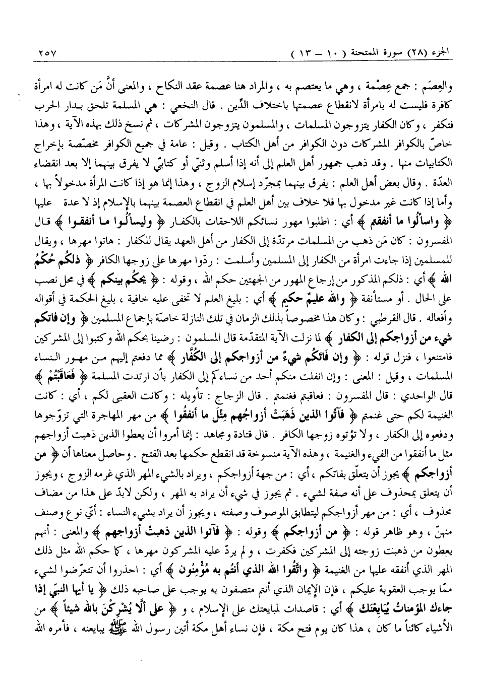 وَالْعِصَمُ: جَمْعُ عِصْمَةٍ، وَهِيَ مَا يُعْتَصَمُ بِهِ، وَالْمُرَادُ هُنَا عِصْمَةُ عَقْدِ النِّكَاحِ، وَالْمَعْنَى أَنَّ مَنْ كَانَتْ لَهُ امْرَأَةٌ كَافِرَةٌ فَلَيْسَتْ لَهُ بِامْرَأَةٍ لِانْقِطَاعِ عِصْمَتِهَا بِاخْتِلَافِ الدِّينِ. قَالَ النَّخَعِيُّ: هِيَ الْمُسْلِمَةُ تَلْحَقُ بِدَارِ الْحَرْبِ فَتَكْفُرُ، وَكَانَ الكفار يتزوجون المسلمات، وَالْمُسْلِمُونَ يَتَزَوَّجُونَ الْمُشْرِكَاتِ، ثُمَّ نُسِخَ ذَلِكَ بِهَذِهِ الْآيَةِ، وَهَذَا خَاصٌّ بِالْكَوَافِرِ الْمُشْرِكَاتِ دُونَ الْكَوَافِرِ مِنْ أَهْلِ الْكِتَابِ. وَقِيلَ: عَامَّةٌ فِي جَمِيعِ الْكَوَافِرِ مُخَصَّصَةٌ بِإِخْرَاجِ الْكِتَابِيَّاتِ مِنْهَا. وَقَدْ ذَهَبَ جمهور أهل العلم إلى أنه إذا أسلم وثنّي أو كتابيّ لا يفرق بينهما إلا بعد انقضاء العدّة. وَقَالَ بَعْضُ أَهْلِ الْعِلْمِ: يُفَرَّقُ بَيْنَهُمَا بِمُجَرَّدِ إِسْلَامِ الزَّوْجِ، وَهَذَا إِنَّمَا هُوَ إِذَا كَانَتِ الْمَرْأَةُ مَدْخُولًا بِهَا، وَأَمَّا إِذَا كَانَتْ غَيْرَ مَدْخُولٍ بِهَا فَلَا خِلَافَ بَيْنَ أَهْلِ الْعِلْمِ فِي انْقِطَاعِ الْعِصْمَةِ بَيْنَهُمَا بِالْإِسْلَامِ إِذْ لَا عدة عليها وَسْئَلُوا مَا أَنْفَقْتُمْ أَيِ: اطْلُبُوا مُهُورَ نِسَائِكُمُ اللَّاحِقَاتِ بالكفار وَلْيَسْئَلُوا مَا أَنْفَقُوا قَالَ الْمُفَسِّرُونَ: كَانَ مَنْ ذَهَبَ مِنَ الْمُسْلِمَاتِ مُرْتَدَّةً إِلَى الْكُفَّارِ مِنْ أَهْلِ الْعَهْدِ يُقَالُ لِلْكُفَّارِ: هَاتُوا مَهْرَهَا، وَيُقَالُ لِلْمُسْلِمِينَ إِذَا جَاءَتِ امْرَأَةٌ مِنَ الْكُفَّارِ إِلَى الْمُسْلِمِينَ وَأَسْلَمَتْ: رُدُّوا مَهْرَهَا عَلَى زَوْجِهَا الْكَافِرِ ذلِكُمْ حُكْمُ اللَّهِ أَيْ: ذَلِكُمُ الْمَذْكُورُ مِنْ إِرْجَاعِ الْمُهُورِ مِنَ الْجِهَتَيْنِ حُكْمُ اللَّهِ، وَقَوْلُهُ: يَحْكُمُ بَيْنَكُمْ فِي مَحَلِّ نَصْبٍ عَلَى الْحَالِ. أَوْ مُسْتَأْنَفَةٌ وَاللَّهُ عَلِيمٌ حَكِيمٌ أَيْ: بَلِيغُ الْعِلْمِ لَا تَخْفَى عَلَيْهِ خَافِيَةٌ، بَلِيغُ الْحِكْمَةِ فِي أَقْوَالِهِ وَأَفْعَالِهِ. قَالَ الْقُرْطُبِيُّ: وَكَانَ هَذَا مَخْصُوصًا بِذَلِكَ الزَّمَانِ فِي تِلْكَ النَّازِلَةِ خَاصَّةً بِإِجْمَاعِ الْمُسْلِمِينَ وَإِنْ فاتَكُمْ شَيْءٌ مِنْ أَزْواجِكُمْ إِلَى الْكُفَّارِ لَمَّا نَزَلَتِ الْآيَةُ الْمُتَقَدِّمَةُ قَالَ الْمُسْلِمُونَ: رَضِينَا بِحُكْمِ اللَّهِ وَكَتَبُوا إِلَى الْمُشْرِكِينَ فَامْتَنَعُوا، فَنَزَلَ قَوْلُهُ: وَإِنْ فاتَكُمْ شَيْءٌ مِنْ أَزْواجِكُمْ إِلَى الْكُفَّارِ مِمَّا دَفَعْتُمْ إِلَيْهِمْ مِنْ مُهُورِ النِّسَاءِ الْمُسْلِمَاتِ، وَقِيلَ: الْمَعْنَى: وَإِنِ انْفَلَتَ مِنْكُمْ أحد من نساءكم إِلَى الْكُفَّارِ بِأَنِ ارْتَدَّتِ الْمُسْلِمَةُ فَعاقَبْتُمْ قَالَ الْوَاحِدِيُّ: قَالَ الْمُفَسِّرُونَ: فَعَاقَبْتُمْ فَغَنِمْتُمْ. قَالَ الزَّجَّاجُ: تَأْوِيلُهُ: وَكَانَتِ الْعُقْبَى لَكُمْ، أَيْ: كَانَتِ الْغَنِيمَةُ لَكُمْ حَتَّى غَنِمْتُمْ فَآتُوا الَّذِينَ ذَهَبَتْ أَزْواجُهُمْ مِثْلَ مَا أَنْفَقُوا مِنْ مَهْرِ الْمُهَاجِرَةِ الَّتِي تزوّجوها ودفعوه إِلَى الْكُفَّارِ، وَلَا تُؤْتُوهُ زَوْجَهَا الْكَافِرَ. قَالَ قَتَادَةُ وَمُجَاهِدٌ: إِنَّمَا أُمِرُوا أَنْ يُعْطُوا الَّذِينَ ذَهَبَتْ أَزْوَاجُهُمْ مِثْلَ مَا أَنْفَقُوا مِنَ الْفَيْءِ وَالْغَنِيمَةِ، وَهَذِهِ الْآيَةُ مَنْسُوخَةٌ قَدِ انْقَطَعَ حُكْمُهَا بَعْدَ الْفَتْحِ. وَحَاصِلُ مَعْنَاهَا أَنَّ مِنْ أَزْواجِكُمْ يجوز أن يتعلّق بفاتكم، أَيْ: مِنْ جِهَةِ أَزْوَاجِكُمْ، وَيُرَادُ بِالشَّيْءِ الْمَهْرُ الَّذِي غَرِمَهُ الزَّوْجُ، وَيَجُوزُ أَنْ يَتَعَلَّقَ بِمَحْذُوفٍ عَلَى أَنَّهُ صِفَةٌ لِشَيْءٍ. ثُمَّ يَجُوزُ فِ