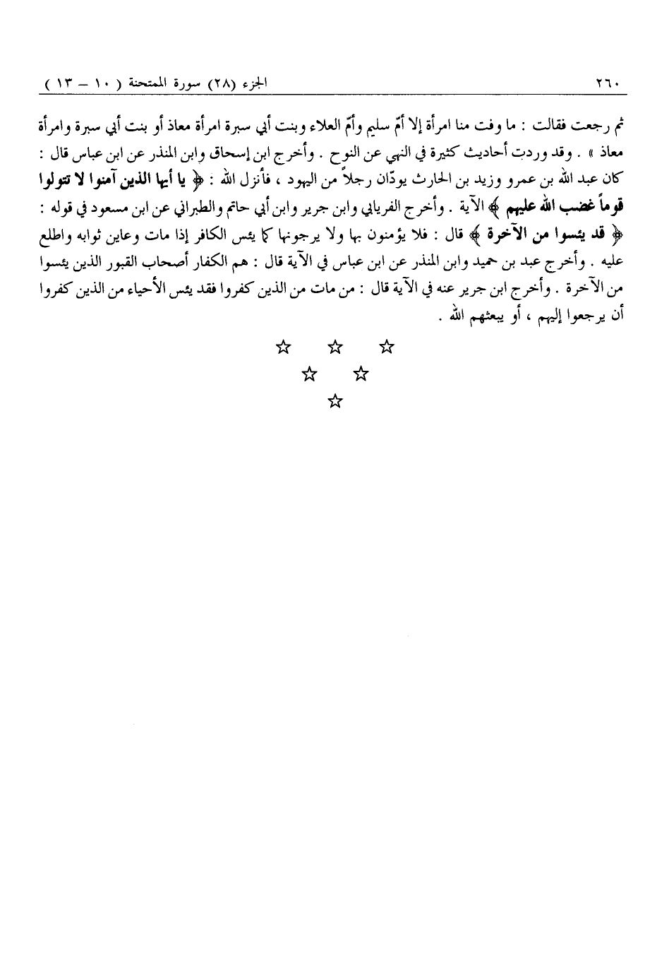 كَانَ عَبْدُ اللَّهِ بْنُ عَمْرٍو وَزَيْدُ بْنُ الْحَارِثِ يَوَدَّانِ رَجُلًا مِنَ الْيَهُودِ، فَأَنْزَلَ اللَّهُ: يَا أَيُّهَا الَّذِينَ آمَنُوا لَا تَتَوَلَّوْا قَوْماً غَضِبَ اللَّهُ عَلَيْهِمْ الْآيَةَ. وَأَخْرَجَ الْفِرْيَابِيُّ وَابْنُ جَرِيرٍ وَابْنُ أَبِي حَاتِمٍ وَالطَّبَرَانِيُّ عَنِ ابْنِ مَسْعُودٍ فِي قَوْلِهِ: