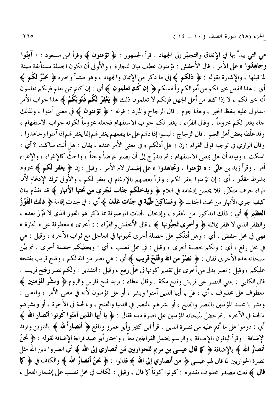 اسْكُتْ، وَبَيَانُهُ أَنَّ هَلْ بِمَعْنَى الِاسْتِفْهَامِ، ثُمَّ يَتَدَرَّجُ إِلَى أَنْ يَصِيرَ عَرْضًا وَحَثًّا، وَالْحَثُّ كَالْإِغْرَاءِ، وَالْإِغْرَاءُ أَمْرٌ. وَقَرَأَ زَيْدُ بْنُ عَلِيٍّ: «تُؤْمِنُوا، وَتُجَاهِدُوا» عَلَى إِضْمَارِ لَامِ الْأَمْرِ. وَقِيلَ: إِنَّ يَغْفِرْ لَكُمْ مَجْزُومٌ بِشَرْطٍ مُقَدَّرٍ، أَيْ: إِنْ تُؤْمِنُوا يَغْفِرْ لَكُمْ، وَقَرَأَ بَعْضُهُمْ بِالْإِدْغَامِ فِي يَغْفِرْ لَكُمْ، وَالْأَوْلَى تَرْكُ الْإِدْغَامِ لِأَنَّ الرَّاءَ حَرْفٌ مُتَكَرِّرٌ فَلَا يَحْسُنُ إِدْغَامُهُ فِي اللَّامِ وَيُدْخِلْكُمْ جَنَّاتٍ تَجْرِي مِنْ تَحْتِهَا الْأَنْهارُ قَدْ تَقَدَّمَ بَيَانُ كَيْفِيَّةِ جَرْيِ الْأَنْهَارِ مِنْ تَحْتِ الْجَنَّاتِ وَمَساكِنَ طَيِّبَةً فِي جَنَّاتِ عَدْنٍ أَيْ: فِي جَنَّاتِ إِقَامَةٍ ذلِكَ الْفَوْزُ الْعَظِيمُ أي: ذلك المذكور من الْمَغْفِرَةِ، وَإِدْخَالُ الْجَنَّاتِ الْمَوْصُوفَةِ بِمَا ذُكِرَ هُوَ الْفَوْزُ الَّذِي لَا فَوْزَ بَعْدَهُ، وَالظَّفَرُ الَّذِي لَا ظَفَرَ يُمَاثِلُهُ وَأُخْرى تُحِبُّونَها، قَالَ الْأَخْفَشُ وَالْفَرَّاءُ: «أُخْرَى» مَعْطُوفَةٌ عَلَى «تِجَارَةٍ» فَهِيَ فِي مَحَلِّ خَفْضٍ، أَيْ: وَهَلْ أَدُلُّكُمْ عَلَى خَصْلَةٍ أُخْرَى تُحِبُّونَهَا فِي الْعَاجِلِ مَعَ ثَوَابِ الْآخِرَةِ، وَقِيلَ: هِيَ فِي مَحَلِّ رَفْعٍ، أَيْ: وَلَكُمْ خَصْلَةٌ أُخْرَى، وَقِيلَ: فِي مَحَلِّ نَصْبٍ، أَيْ: وَيُعْطِيكُمْ خَصْلَةً أُخْرَى. ثُمَّ بَيَّنَ سُبْحَانَهُ هَذِهِ الأخرى فَقَالَ: نَصْرٌ مِنَ اللَّهِ وَفَتْحٌ قَرِيبٌ أَيْ: هِيَ نَصْرٌ مِنَ اللَّهِ لَكُمْ، وَفَتْحٌ قَرِيبٌ يفتحه عليكم، وقيل: نصر بدل من أخرى على تقدير كونها في محلّ رفع، وقيل: التقدير: ولكم نصر وَفَتْحٌ قَرِيبٌ.