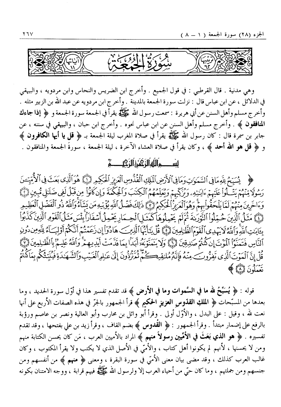 قَوْلُهُ: يُسَبِّحُ لِلَّهِ مَا فِي السَّماواتِ وَما فِي الْأَرْضِ قَدْ تَقَدَّمَ تَفْسِيرُ هَذَا فِي أَوَّلِ سُورَةِ الْحَدِيدِ، وَمَا بَعْدَهَا مِنَ الْمُسَبِّحَاتِ الْمَلِكِ الْقُدُّوسِ الْعَزِيزِ الْحَكِيمِ قَرَأَ الْجُمْهُورُ بِالْجَرِّ فِي هَذِهِ الصِّفَاتِ الْأَرْبَعِ عَلَى أَنَّهَا نَعْتٌ لِلَّهِ، وَقِيلَ: عَلَى الْبَدَلِ، وَالْأَوَّلُ أَوْلَى. وَقَرَأَ أَبُو وَائِلِ بْنُ مُحَارِبٍ وَأَبُو الْعَالِيَةِ وَنَصْرُ بْنُ عَاصِمٍ وَرُؤْبَةُ بِالرَّفْعِ عَلَى إِضْمَارِ مُبْتَدَأٍ. وَقَرَأَ الْجُمْهُورُ: الْقُدُّوسِ بِضَمِّ الْقَافِ، وَقَرَأَ زَيْدُ بْنُ عَلِيٍّ بِفَتْحِهَا، وَقَدْ تَقَدَّمَ تَفْسِيرُهُ. هُوَ الَّذِي بَعَثَ فِي الْأُمِّيِّينَ رَسُولًا مِنْهُمْ الْمُرَادُ بِالْأُمِّيِّينَ الْعَرَبُ، مَنْ كَانَ يُحْسِنُ الْكِتَابَةَ مِنْهُمْ وَمَنْ لَا يُحْسِنُهَا، لِأَنَّهُمْ لَمْ يَكُونُوا أَهْلَ كِتَابٍ، وَالْأُمِّيُّ فِي الْأَصْلِ الَّذِي لَا يَكْتُبُ وَلَا يَقْرَأُ الْمَكْتُوبَ، وَكَانَ غَالِبُ الْعَرَبِ كَذَلِكَ، وَقَدْ مَضَى بَيَانُ مَعْنَى الْأُمِّيِّ فِي سُورَةِ الْبَقَرَةِ، وَمَعْنَى مِنْهُمْ مِنْ أَنْفُسِهِمْ وَمِنْ جِنْسِهِمْ وَمِنْ جُمْلَتِهِمْ، وَمَا كَانَ حَيٌّ مِنْ أَحْيَاءِ الْعَرَبِ إِلَّا وَلِرَسُولِ اللَّهِ صَلَّى اللَّهُ عَلَيْهِ وَسَلَّمَ فِيهِمْ قَرَابَةٌ، وَوَجْهُ الِامْتِنَانِ بِكَوْنِهِ
