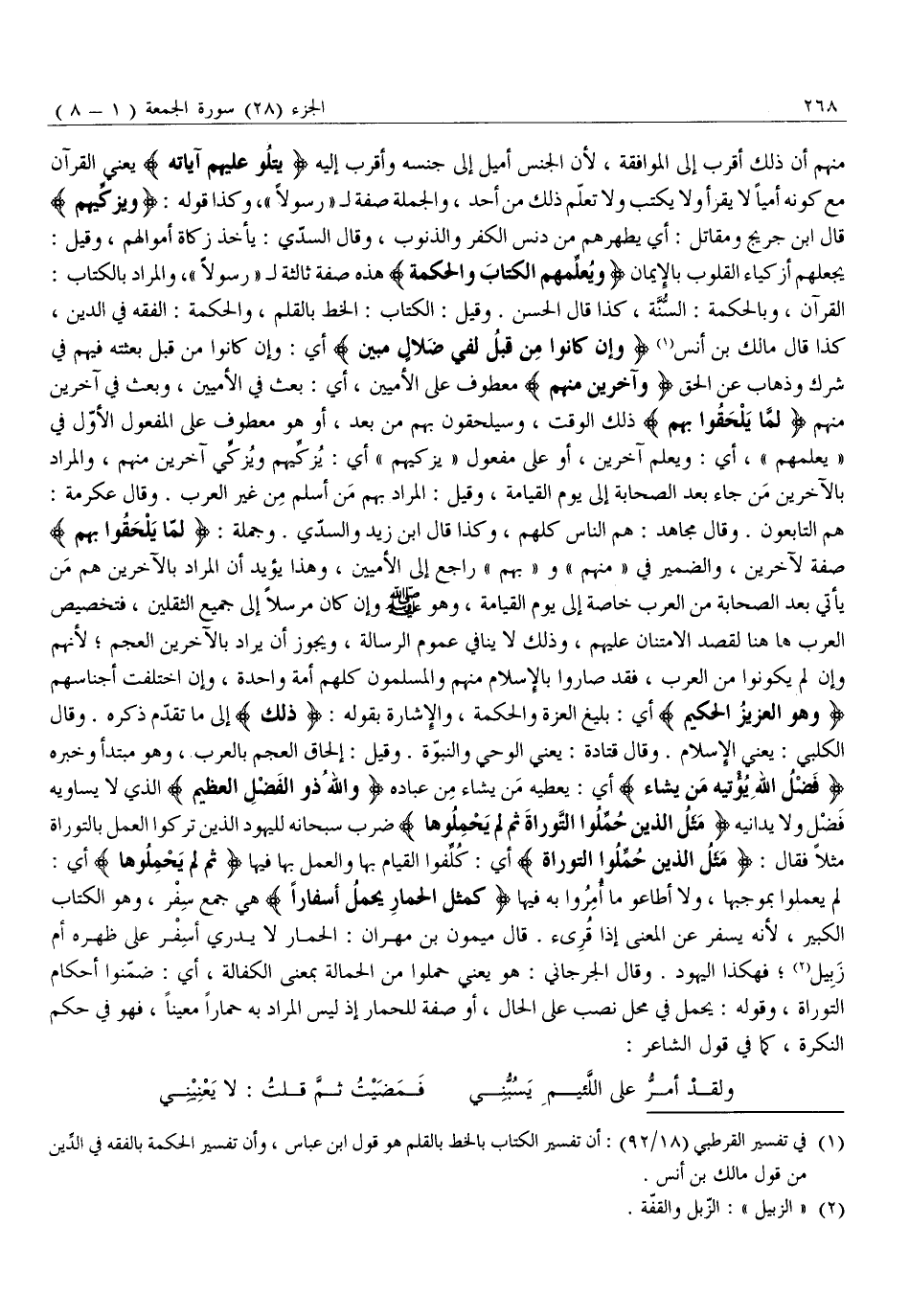 هُمُ التَّابِعُونَ. وَقَالَ مُجَاهِدٌ: هُمُ النَّاسُ كُلُّهُمْ، وَكَذَا قَالَ ابْنُ زَيْدٍ وَالسُّدِّيُّ. وَجُمْلَةُ: لَمَّا يَلْحَقُوا بِهِمْ صفة لآخرين، والضمير في «منهم» و «بهم» رَاجِعٌ إِلَى الْأُمِّيِّينَ، وَهَذَا يُؤَيِّدُ أَنَّ الْمُرَادَ بِالْآخَرِينَ هُمْ مَنْ يَأْتِي بَعْدَ الصَّحَابَةِ مِنَ الْعَرَبِ خَاصَّةً إِلَى يَوْمِ الْقِيَامَةِ، وَهُوَ صَلَّى اللَّهُ عَلَيْهِ وَسَلَّمَ وَإِنْ كَانَ مُرْسَلًا إِلَى جميع الثقلين، فتخصيص العرب ها هنا لِقَصْدِ الِامْتِنَانِ عَلَيْهِمْ، وَذَلِكَ لَا يُنَافِي عُمُومَ الرِّسَالَةِ، وَيَجُوزُ أَنْ يُرَادَ بِالْآخَرِينَ الْعَجَمُ لِأَنَّهُمْ وَإِنْ لَمْ يَكُونُوا مِنَ الْعَرَبِ، فَقَدْ صَارُوا بِالْإِسْلَامِ مِنْهُمْ وَالْمُسْلِمُونَ كُلُّهُمْ أُمَّةٌ وَاحِدَةٌ، وَإِنِ اخْتَلَفَتْ أَجْنَاسُهُمْ وَهُوَ الْعَزِيزُ الْحَكِيمُ أَيْ: بَلِيغُ الْعِزَّةِ وَالْحِكْمَةِ، وَالْإِشَارَةُ بِقَوْلِهِ: ذلِكَ إِلَى مَا تَقَدَّمَ ذِكْرُهُ. وَقَالَ الْكَلْبِيُّ: يَعْنِي الْإِسْلَامَ. وَقَالَ قَتَادَةُ: يَعْنِي الْوَحْيَ وَالنُّبُوَّةَ. وَقِيلَ: إِلْحَاقُ الْعَجَمِ بِالْعَرَبِ، وَهُوَ مُبْتَدَأٌ وَخَبَرُهُ فَضْلُ اللَّهِ يُؤْتِيهِ مَنْ يَشاءُ أَيْ: يُعْطِيهِ مَنْ يَشَاءُ مِنْ عِبَادِهِ وَاللَّهُ ذُو الْفَضْلِ الْعَظِيمِ الَّذِي لَا يُسَاوِيهِ فَضْلٌ وَلَا يُدَانِيهِ مَثَلُ الَّذِينَ حُمِّلُوا التَّوْراةَ ثُمَّ لَمْ يَحْمِلُوها ضَرَبَ سُبْحَانَهُ لِلْيَهُودِ الَّذِينَ تَرَكُوا الْعَمَلَ بِالتَّوْرَاةِ مَثَلًا فَقَالَ: مَثَلُ الَّذِينَ حُمِّلُوا التَّوْراةَ أَيْ: كُلِّفُوا الْقِيَامَ بِهَا والعمل بها فِيهَا ثُمَّ لَمْ يَحْمِلُوها أَيْ:
