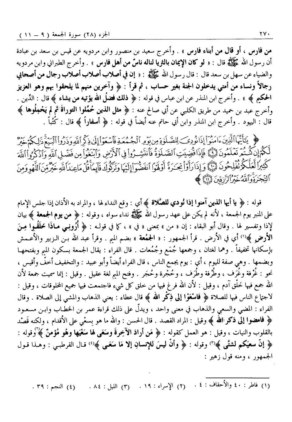 مِنْ فَارِسَ، أَوْ قَالَ مِنْ أَبْنَاءِ فَارِسَ» . وَأَخْرَجَ سَعِيدُ بْنُ مَنْصُورٍ وَابْنُ مَرْدَوَيْهِ عَنِ قَيْسِ بْنِ سَعْدِ بْنِ عُبَادَةَ أَنَّ رَسُولَ اللَّهِ صَلَّى اللَّهُ عَلَيْهِ وَسَلَّمَ قَالَ: «لَوْ كَانَ الْإِيمَانُ بِالثُّرَيَّا لَنَالَهُ نَاسٌ مِنْ أَهْلِ فَارِسَ» . وَأَخْرَجَ الطَّبَرَانِيُّ وَابْنُ مَرْدَوَيْهِ وَالضِّيَاءُ عَنْ سَهْلِ بْنِ سَعْدٍ قَالَ: قَالَ رَسُولُ اللَّهِ صَلَّى اللَّهُ عَلَيْهِ وَسَلَّمَ: «إِنَّ فِي أَصْلَابِ أَصْلَابِ أَصْلَابِ رِجَالٍ مِنْ أَصْحَابِي رِجَالًا وَنِسَاءً مِنْ أُمَّتِي يَدْخُلُونَ الْجَنَّةَ بِغَيْرِ حِسَابٍ، ثُمَّ قَرَأَ: وَآخَرِينَ مِنْهُمْ لَمَّا يَلْحَقُوا بِهِمْ وَهُوَ الْعَزِيزُ الْحَكِيمُ» . وَأَخْرَجَ ابْنُ الْمُنْذِرِ عَنِ ابْنِ عَبَّاسٍ فِي قَوْلِهِ: ذلِكَ فَضْلُ اللَّهِ يُؤْتِيهِ مَنْ يَشاءُ قَالَ: الدِّينُ.