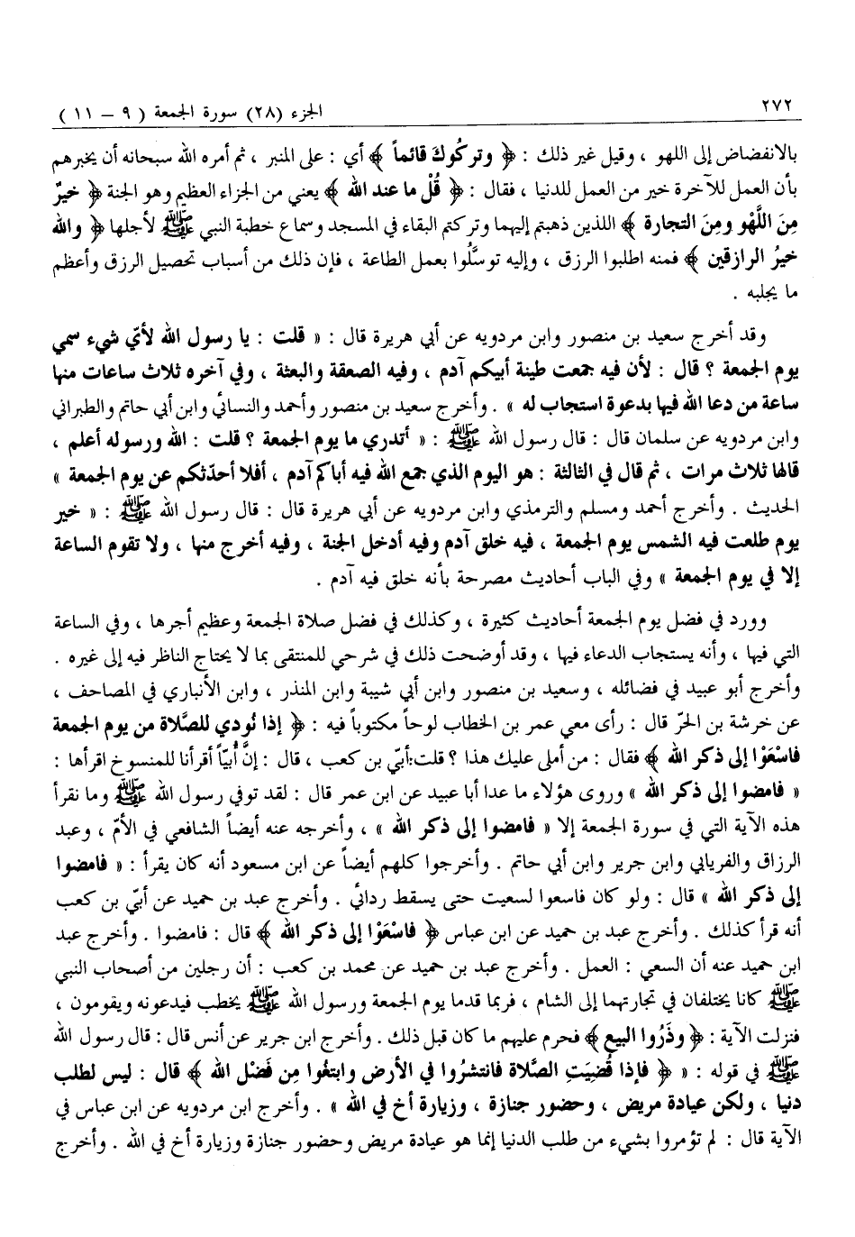 «فَامْضُوا إِلَى ذِكْرِ اللَّهِ» وَرَوَى هَؤُلَاءِ مَا عَدَا أَبَا عَبِيدٍ عَنِ ابْنِ عُمَرَ قَالَ: لَقَدْ تُوُفِّيَ رَسُولُ اللَّهِ صَلَّى اللَّهُ عَلَيْهِ وَسَلَّمَ وَمَا نَقْرَأُ هَذِهِ الْآيَةَ الَّتِي فِي سُورَةِ الْجُمُعَةِ إِلَّا «فَامْضُوا إِلَى ذِكْرِ اللَّهِ» ، وَأَخْرَجَهُ عَنْهُ أَيْضًا الشَّافِعِيُّ فِي الْأُمِّ، وَعَبْدُ الرَّزَّاقِ وَالْفِرْيَابِيُّ وَابْنُ جَرِيرٍ وَابْنُ أَبِي حَاتِمٍ. وَأَخْرَجُوا كُلُّهُمْ أَيْضًا عَنِ ابْنِ مَسْعُودٍ أَنَّهُ كَانَ يَقْرَأُ: «فَامْضُوا إِلَى ذِكْرِ اللَّهِ» قَالَ: وَلَوْ كَانَ فَاسْعَوْا لَسَعَيْتُ حَتَّى يَسْقُطَ رِدَائِي. وَأَخْرَجَ عَبْدُ بْنُ حُمَيْدٍ عَنْ أُبَيِّ بْنِ كَعْبٍ أَنَّهُ قَرَأَ كَذَلِكَ. وَأَخْرَجَ عَبْدُ بْنُ حُمَيْدٍ عَنِ ابْنِ عَبَّاسٍ فَاسْعَوْا إِلى ذِكْرِ اللَّهِ قَالَ: فامضوا. وأخرج عبد ابن حُمَيْدٍ عَنْهُ أَنَّ السَّعْيَ: الْعَمَلُ. وَأَخْرَجَ عَبْدُ بْنُ حُمَيْدٍ عَنْ مُحَمَّدِ بْنِ كَعْبٍ: أَنَّ رَجُلَيْنِ مِنْ أَصْحَابِ النَّبِيِّ صَلَّى اللَّهُ عَلَيْهِ وَسَلَّمَ كَانَا يَخْتَلِفَانِ فِي تِجَارَتِهِمَا إِلَى الشَّامِ، فَرُبَّمَا قَدِمَا يَوْمَ الْجُمُعَةِ وَرَسُولُ اللَّهِ صَلَّى اللَّهُ عَلَيْهِ وَسَلَّمَ يَخْطُبُ فَيَدْعُونَهُ وَيَقُومُونَ، فَنَزَلَتِ الْآيَةُ: وَذَرُوا الْبَيْعَ فَحُرِّمَ عَلَيْهِمْ مَا كَانَ قَبْلَ ذَلِكَ. وَأَخْرَجَ ابْنُ جَرِيرٍ عَنْ أَنَسٍ قَالَ: قَالَ رَسُولُ اللَّهِ صَلَّى اللَّهُ عَلَيْهِ وَسَلَّمَ فِي قَوْلِهِ: فَإِذا قُضِيَتِ الصَّلاةُ فَانْتَشِرُوا فِي الْأَرْضِ وَابْتَغُوا مِنْ فَضْلِ اللَّهِ قَالَ: لَيْسَ لِطَلَبِ دُنْيَا، وَلَكِنْ عِيَادَةِ مَرِيضٍ، وَحُضُورِ جِنَازَةٍ، وَزِيَارَةِ أَخٍ فِي اللَّهِ» . وَأَخْرَجَ ابْنُ مَرْدَوَيْهِ عَنِ ابْنِ عَبَّاسٍ فِي الْآيَةِ قَالَ: لَمْ تُؤْمَرُوا بِشَيْءٍ مِنْ طَلَبِ الدُّنْيَا إِنَّمَا هُوَ عِيَادَةُ مَرِيضٍ وَحُضُورُ جِنَازَةٍ وَزِيَارَةُ أَخٍ فِي اللَّهِ. وَأَخْرَجَ