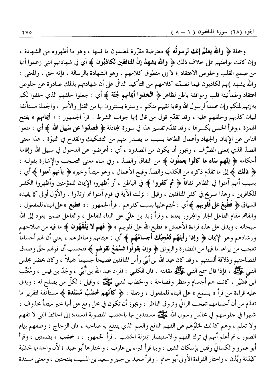 بِسَبَبِ أَنَّهُمْ آمَنُوا فِي الظَّاهِرِ نِفَاقًا ثُمَّ كَفَرُوا فِي الْبَاطِنِ، أَوْ أَظْهَرُوا الْإِيمَانَ لِلْمُؤْمِنِينَ وَأَظْهَرُوا الْكُفْرَ لِلْكَافِرِينَ، وَهَذَا صَرِيحٌ فِي كُفْرِ الْمُنَافِقِينَ، وَقِيلَ: نَزَلَتِ الْآيَةُ فِي قَوْمٍ آمَنُوا ثُمَّ ارْتَدُّوا. وَالْأَوَّلُ أَوْلَى كَمَا يُفِيدُهُ السِّيَاقُ فَطُبِعَ عَلى قُلُوبِهِمْ أَيْ: خَتَمَ عَلَيْهَا بِسَبَبِ كُفْرِهِمْ. قَرَأَ الْجُمْهُورُ: «فَطُبِعَ «» عَلَى الْبِنَاءِ لِلْمَفْعُولِ، وَالْقَائِمُ مَقَامَ الْفَاعِلِ الْجَارُّ وَالْمَجْرُورِ بَعْدَهُ، وَقَرَأَ زَيْدُ بْنُ عَلِيٍّ عَلَى الْبِنَاءِ لِلْفَاعِلِ، وَالْفَاعِلُ ضَمِيرٌ يَعُودُ إِلَى اللَّهِ سُبْحَانَهُ، وَيَدُلُّ عَلَى هذه قِرَاءَةُ الْأَعْمَشِ «فَطَبَعَ اللَّهُ عَلَى قُلُوبِهِمْ» فَهُمْ لَا يَفْقَهُونَ مَا فِيهِ مِنْ صَلَاحِهِمْ وَرَشَادِهِمْ وَهُوَ الْإِيمَانُ وَإِذا رَأَيْتَهُمْ تُعْجِبُكَ أَجْسامُهُمْ أَيْ: هَيْئَاتِهِمْ وَمَنَاظِرِهِمْ، يَعْنِي أَنَّ لَهُمْ أَجْسَامًا تُعْجِبُ مَنْ يَرَاهَا لِمَا فِيهَا مِنَ النَّضَارَةِ وَالرَّوْنَقِ وَإِنْ يَقُولُوا تَسْمَعْ لِقَوْلِهِمْ فَتَحْسَبُ أَنَّ قَوْلَهُمْ حَقٌّ وَصِدْقٌ لِفَصَاحَتِهِمْ وَذَلَاقَةِ أَلْسِنَتِهِمْ، وَقَدْ كَانَ عَبْدُ اللَّهِ بْنُ أُبَيٍّ رَأْسُ الْمُنَافِقِينَ فَصِيحًا جَسِيمًا جَمِيلًا، وَكَانَ يَحْضُرُ مَجْلِسَ النَّبِيِّ صَلَّى اللَّهُ عَلَيْهِ وَسَلَّمَ، فَإِذَا قَالَ سَمِعَ النَّبِيُّ صَلَّى اللَّهُ عَلَيْهِ وَسَلَّمَ مَقَالَتَهُ. قَالَ الْكَلْبِيُّ: الْمُرَادُ عَبْدُ اللَّهِ بْنُ أُبَيٍّ، وَجَدُّ بْنُ قيس، ومعتّب ابن قشير، كَانَتْ لَهُمْ أَجْسَامٌ وَمَنْظَرٌ وَفَصَاحَةٌ، وَالْخِطَابُ لِلنَّبِيِّ صَلَّى اللَّهُ عَلَيْهِ وَسَلَّمَ، وَقِيلَ: لِكُلِّ مَنْ يَصْلُحُ لَهُ، وَيَدُلُّ عَلَيْهِ قِرَاءَةُ مَنْ قَرَأَ «يُسْمَعْ» عَلَى الْبِنَاءِ لِلْمَفْعُولِ، وَجُمْلَةُ: كَأَنَّهُمْ خُشُبٌ مُسَنَّدَةٌ مُسْتَأْنَفَةٌ لِتَقْرِيرِ مَا تَقَدَّمَ مِنْ أَنَّ أَجْسَامَهُمْ تُعْجِبُ الرَّائِيَ وَتَرُوقُ النَّاظِرَ، وَيَجُوزُ أَنْ تَكُونَ فِي مَحَلِّ رَفْعٍ عَلَى أَنَّهَا خَبَرُ مُبْتَدَأٍ مَحْذُوفٍ، شُبِّهُوا فِي جُلُوسِهِمْ فِي مَجَالِسِ رَسُولِ اللَّهِ صَلَّى اللَّهُ عَلَيْهِ وَسَلَّمَ مُسْتَنِدِينَ بِهَا بِالْخُشُبِ الْمَنْصُوبَةِ الْمُسْنَدَةِ إِلَى الْحَائِطِ الَّتِي لَا تَفْهَمُ وَلَا تَعْلَمُ، وَهُمْ كَذَلِكَ لِخُلُوِّهِمْ عَنِ الْفَهْمِ النَّافِعِ وَالْعِلْمِ الَّذِي يَنْتَفِعُ بِهِ صَاحِبُهُ، قَالَ الزَّجَّاجُ: وَصَفَهُمْ بِتَمَامِ الصُّوَرِ، ثُمَّ أَعْلَمَ أَنَّهُمْ فِي تَرْكِ الْفَهْمِ وَالِاسْتِبْصَارِ بِمَنْزِلَةِ الْخُشُبِ. قَرَأَ الْجُمْهُورُ: «خُشُبٌ» بِضَمَّتَيْنِ، وَقَرَأَ أَبُو عَمْرٍو وَالْكِسَائِيُّ وَقُنْبُلٌ بِإِسْكَانِ الشِّينِ، وَبِهَا قَرَأَ الْبَرَاءُ بْنُ عَازِبٍ، وَاخْتَارَهَا أَبُو عُبَيْدٍ لِأَنَّ وَاحِدَتَهَا خَشَبَةٌ كَبَدَنَةٍ وَبُدُنٍ، وَاخْتَارَ الْقِرَاءَةَ الْأُولَى أَبُو حَاتِمٍ. وَقَرَأَ سَعِيدُ بْنُ جُبَيْرٍ وَسَعِيدُ بْنُ الْمُسَيَّبِ بِفَتْحَتَيْنِ، وَمَعْنَى مُسَنَّدَةٌ