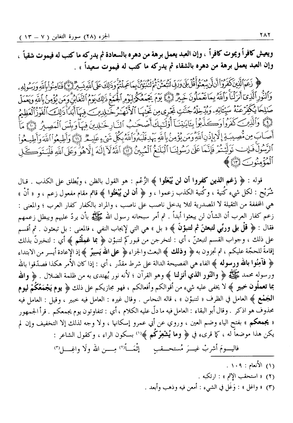 زَعَمَ الَّذِينَ كَفَرُوا أَنْ لَنْ يُبْعَثُوا قُلْ بَلى وَرَبِّي لَتُبْعَثُنَّ ثُمَّ لَتُنَبَّؤُنَّ بِما عَمِلْتُمْ وَذلِكَ عَلَى اللَّهِ يَسِيرٌ (7) فَآمِنُوا بِاللَّهِ وَرَسُولِهِ وَالنُّورِ الَّذِي أَنْزَلْنا وَاللَّهُ بِما تَعْمَلُونَ خَبِيرٌ (8) يَوْمَ يَجْمَعُكُمْ لِيَوْمِ الْجَمْعِ ذلِكَ يَوْمُ التَّغابُنِ وَمَنْ يُؤْمِنْ بِاللَّهِ وَيَعْمَلْ صالِحاً يُكَفِّرْ عَنْهُ سَيِّئاتِهِ وَيُدْخِلْهُ جَنَّاتٍ تَجْرِي مِنْ تَحْتِهَا الْأَنْهارُ خالِدِينَ فِيها أَبَداً ذلِكَ الْفَوْزُ الْعَظِيمُ (9) وَالَّذِينَ كَفَرُوا وَكَذَّبُوا بِآياتِنا أُولئِكَ أَصْحابُ النَّارِ خالِدِينَ فِيها وَبِئْسَ الْمَصِيرُ (10) مَا أَصابَ مِنْ مُصِيبَةٍ إِلاَّ بِإِذْنِ اللَّهِ وَمَنْ يُؤْمِنْ بِاللَّهِ يَهْدِ قَلْبَهُ وَاللَّهُ بِكُلِّ شَيْءٍ عَلِيمٌ (11)