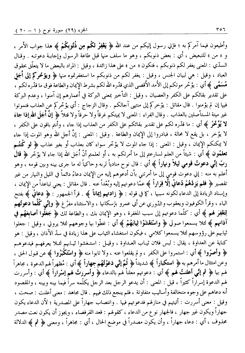 وَأَطِيعُونِ فِيمَا آمُرُكُمْ بِهِ فَإِنِّي رَسُولٌ إِلَيْكُمْ مِنْ عِنْدِ اللَّهِ يَغْفِرْ لَكُمْ مِنْ ذُنُوبِكُمْ هذا جواب الأمر، و «من» لِلتَّبْعِيضِ، أَيْ: بَعْضَ ذُنُوبِكُمْ، وَهُوَ مَا سَلَفَ مِنْهَا قَبْلَ طَاعَةِ الرَّسُولِ وَإِجَابَةِ دَعْوَتِهِ. وَقَالَ السُّدِّيُّ: الْمَعْنَى يَغْفِرْ لَكُمْ ذُنُوبَكُمْ، فَتَكُونُ «مِنْ» عَلَى هَذَا زَائِدَةً، وَقِيلَ: الْمُرَادُ بِالْبَعْضِ مَا لَا يَتَعَلَّقُ بِحُقُوقِ الْعِبَادِ، وَقِيلَ: هِيَ لِبَيَانِ الْجِنْسِ، وَقِيلَ: يَغْفِرْ لَكُمْ مِنْ ذُنُوبِكُمْ مَا اسْتَغْفَرْتُمُوهُ مِنْهَا وَيُؤَخِّرْكُمْ إِلى أَجَلٍ مُسَمًّى أَيْ: يُؤَخِّرْ مَوْتَكُمْ إِلَى الْأَمَدِ الْأَقْصَى الَّذِي قَدَّرَهُ اللَّهُ لَكُمْ بِشَرْطِ الْإِيمَانِ وَالطَّاعَةِ فَوْقَ مَا قَدَّرَهُ لَكُمْ، عَلَى تَقْدِيرِ بَقَائِكُمْ عَلَى الْكُفْرِ وَالْعِصْيَانِ، وَقِيلَ: التَّأْخِيرُ بِمَعْنَى الْبَرَكَةِ فِي أَعْمَارِهِمْ إِنْ آمَنُوا، وَعَدَمِ الْبَرَكَةِ فِيهَا إِنْ لَمْ يُؤْمِنُوا. قَالَ مُقَاتِلٌ: يُؤَخِّرْكُمْ إِلَى مُنْتَهَى آجَالِكُمْ. وَقَالَ الزَّجَّاجُ: أَيْ يُؤَخِّرْكُمْ عَنِ الْعَذَابِ فَتَمُوتُوا غَيْرَ مَيْتَةِ الْمُسْتَأْصِلِينَ بِالْعَذَابِ. وَقَالَ الْفَرَّاءُ: الْمَعْنَى لَا يُمِيتُكُمْ غَرَقًا وَلَا حَرْقًا وَلَا قَتْلًا إِنَّ أَجَلَ اللَّهِ إِذا جاءَ لا يُؤَخَّرُ أَيْ: مَا قَدَّرَهُ لَكُمْ عَلَى تَقْدِيرِ بَقَائِكُمْ عَلَى الْكُفْرِ مِنَ الْعَذَابِ إِذَا جَاءَ، وَأَنْتُمْ بَاقُونَ عَلَى الْكُفْرِ، لَا يُؤَخَّرُ، بَلْ يَقَعُ لَا مَحَالَةَ، فَبَادِرُوا إِلَى الْإِيمَانِ وَالطَّاعَةِ. وَقِيلَ: الْمَعْنَى: إِنَّ أَجَلَ اللَّهِ وَهُوَ الْمَوْتُ إِذَا جَاءَ لَا يُمْكِنُكُمُ الْإِيمَانُ، وَقِيلَ: الْمَعْنَى: إِذَا جَاءَ الْمَوْتُ لَا يُؤَخَّرُ سَوَاءً كَانَ بِعَذَابٍ أَوْ بِغَيْرِ عَذَابٍ لَوْ كُنْتُمْ تَعْلَمُونَ أَيْ: شَيْئًا مِنَ الْعِلْمِ لَسَارَعْتُمْ إِلَى مَا أَمَرْتُكُمْ بِهِ، أَوْ لَعَلِمْتُمْ أَنَّ أَجَلَ اللَّهِ إِذَا جَاءَ لَا يُؤَخَّرُ قالَ رَبِّ إِنِّي دَعَوْتُ قَوْمِي لَيْلًا وَنَهاراً أَيْ: قَالَ نُوحٌ مُنَادِيًا لِرَبِّهِ وَحَاكِيًا لَهُ مَا جَرَى بَيْنَهُ وَبَيْنَ قَوْمِهِ، وَهُوَ أَعْلَمُ بِهِ مِنْهُ: إِنِّي دَعَوْتُ قَوْمِي إِلَى مَا أَمَرْتَنِي بِأَنْ أَدْعُوهُمْ إِلَيْهِ مِنَ الْإِيمَانِ دُعَاءً دَائِمًا فِي اللَّيْلِ وَالنَّهَارِ مِنْ غَيْرِ تَقْصِيرٍ فَلَمْ يَزِدْهُمْ دُعائِي إِلَّا فِراراً عَمَّا دَعَوْتُهُمْ إِلَيْهِ وَبُعْدًا عَنْهُ. قَالَ مُقَاتِلٌ: يَعْنِي تَبَاعُدًا مِنَ الْإِيمَانِ، وَإِسْنَادُ الزِّيَادَةِ إِلَى الدُّعَاءِ لِكَوْنِهِ سَبَبَهَا، كَمَا فِي قَوْلِهِ: زادَتْهُمْ إِيماناً. قَرَأَ الْجُمْهُورُ: دُعَائِي بِفَتْحِ الْيَاءِ، وَقَرَأَ الْكُوفِيُّونَ وَيَعْقُوبُ وَالدُّورِيُّ عَنْ أَبِي عَمْرٍو بِإِسْكَانِهَا، وَالِاسْتِثْنَاءُ مُفَرَّغٌ وَإِنِّي كُلَّما دَعَوْتُهُمْ لِتَغْفِرَ لَهُمْ أَيْ: كُلَّمَا دَعَوْتُهُمْ إِلَى سَبَبِ الْمَغْفِرَةِ، وَهُوَ الْإِيمَانُ بِكَ، وَالطَّاعَةُ لَكَ جَعَلُوا أَصابِعَهُمْ فِي آذانِهِمْ لِئَلَّا يَسْمَعُوا صَوْتِي وَاسْتَغْشَوْا ثِيابَهُمْ أَيْ: غَطَّوْا بِهَا وُجُوهَهُمْ لِئَلَّا يَرَوْنِي، وَقِيلَ: جَعَلُوا ثِيَابَهُمْ على رؤوسهم لِئَلَّا يَسْمَعُوا كَلَامِي، فَيَكُونُ اسْتِغْشَاءُ الثِّيَابِ عَلَى هَذَا زِيَادَةً فِي سَدِّ الْآذَانِ، وَقِيلَ: هُوَ كِنَايَةٌ عَنِ الْعَدَاوَةِ، يُقَالُ: لَبِسَ فُلَانٌ ثِيَابَ الْعَدَاوَةِ، وَقِيلَ: اسْتَغْشَوْا ثِيَابَهُمْ لِئَلَّا يَعْرِفَهُمْ فَيَدْعُوهُمْ وَأَصَرُّوا أَيِ: اسْتَمَرُّوا عَلَى الْكُفْرِ، وَلَمْ ي