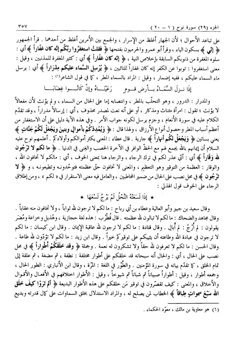 وَقَالَ الْحَسَنُ: مَا لَكَمْ لَا تَعْرِفُونَ لِلَّهِ حَقًّا وَلَا تَشْكُرُونَ لَهُ نِعْمَةً. وَجُمْلَةُ وَقَدْ خَلَقَكُمْ أَطْواراً فِي مَحَلِّ نَصْبٍ عَلَى الْحَالِ، أَيْ: وَالْحَالُ أَنَّهُ سُبْحَانَهُ قَدْ خَلَقَكُمْ عَلَى أَطْوَارٍ مُخْتَلِفَةٍ: نُطْفَةٍ، ثُمَّ مُضْغَةٍ، ثُمَّ عَلَقَةٍ إِلَى تَمَامِ الْخَلْقِ، كَمَا تَقَدَّمَ بَيَانُهُ فِي سُورَةِ الْمُؤْمِنِينَ. وَالطَّوْرُ فِي اللُّغَةِ: الْمَرَّةُ، وَقَالَ ابْنُ الْأَنْبَارِيِّ: الطَّوْرُ الْحَالُ، وَجَمْعُهُ أَطْوَارٌ، وَقِيلَ: أَطْوَارًا صِبْيَانًا ثُمَّ شُبَّانًا ثُمَّ شُيُوخًا، وَقِيلَ: الْأَطْوَارُ اخْتِلَافُهُمْ فِي الْأَفْعَالِ وَالْأَقْوَالِ وَالْأَخْلَاقِ، وَالْمَعْنَى: كَيْفَ تُقَصِّرُونَ فِي تَوْقِيرِ مَنْ خَلَقَكُمْ عَلَى هَذِهِ الْأَطْوَارِ الْبَدِيعَةِ أَلَمْ تَرَوْا كَيْفَ خَلَقَ اللَّهُ سَبْعَ سَماواتٍ طِباقاً الْخِطَابُ لِمَنْ يَصْلُحُ لَهُ، وَالْمُرَادُ الِاسْتِدْلَالُ بِخَلْقِ السَّمَاوَاتِ عَلَى كَمَالِ قُدْرَتِهِ وبديع