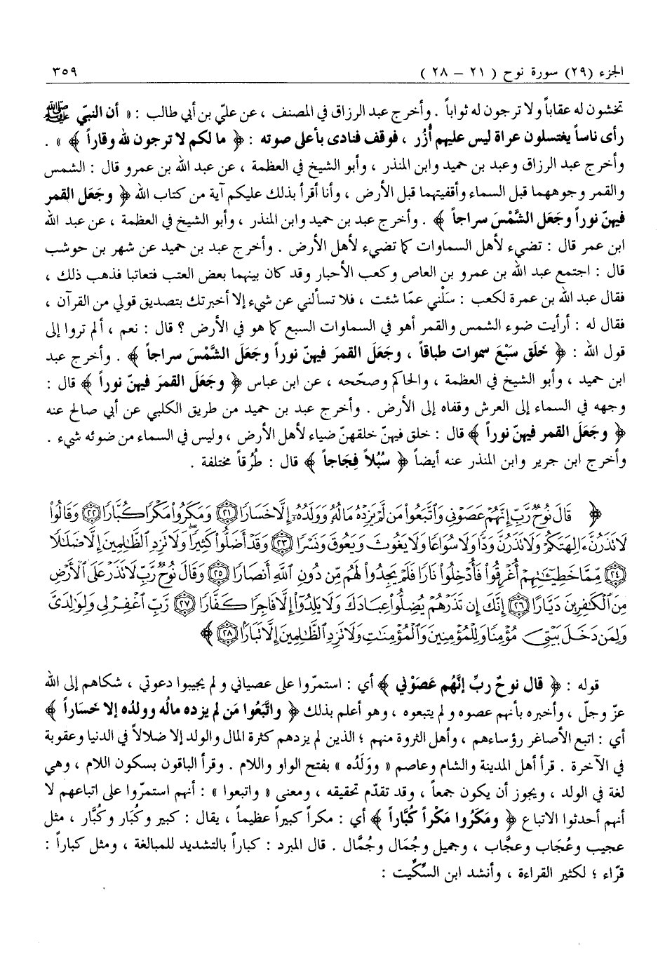 قَوْلُهُ: قالَ نُوحٌ رَبِّ إِنَّهُمْ عَصَوْنِي أَيِ: استمرّوا على عصياني ولم يُجِيبُوا دَعْوَتِي، شَكَاهُمْ إِلَى اللَّهِ عَزَّ وَجَلَّ، وأخبره بأنهم عصوه ولم يَتَّبِعُوهُ، وَهُوَ أَعْلَمُ بِذَلِكَ وَاتَّبَعُوا مَنْ لَمْ يَزِدْهُ مالُهُ وَوَلَدُهُ إِلَّا خَساراً أَيِ: اتَّبَعَ الْأَصَاغِرُ رُؤَسَاءَهُمْ، وَأَهْلَ الثَّرْوَةِ مِنْهُمُ الَّذِينَ لَمْ يَزِدْهُمْ كَثْرَةُ الْمَالِ وَالْوَلَدِ إِلَّا ضَلَالًا فِي الدُّنْيَا وَعُقُوبَةً فِي الْآخِرَةِ. قَرَأَ أَهْلُ الْمَدِينَةِ وَالشَّامِ وَعَاصِمٌ «وَوَلَدُهُ» بِفَتْحِ الْوَاوِ وَاللَّامِ. وَقَرَأَ الْبَاقُونَ بِسُكُونِ اللَّامِ، وَهِيَ لُغَةٌ فِي الْوَلَدِ، وَيَجُوزُ أَنْ يَكُونَ جَمْعًا، وَقَدْ تَقَدَّمَ تَحْقِيقُهُ، وَمَعْنَى «وَاتَّبَعُوا» : أَنَّهُمُ اسْتَمَرُّوا عَلَى اتِّبَاعِهِمْ لَا أَنَّهُمْ أَحْدَثُوا الِاتِّبَاعَ وَمَكَرُوا مَكْراً كُبَّاراً أَيْ: مَكْرًا كِبِيرًا عَظِيمًا، يُقَالُ: كَبِيرٌ وَكُبَارٌ وَكُبَّارٌ، مِثْلُ عَجِيبٍ وَعُجَابٍ وَعُجَّابٍ، وَجَمِيلٍ وَجُمَالٍ وَجُمَّالٍ. قَالَ الْمُبَرِّدُ: كُبَّارًا بِالتَّشْدِيدِ لِلْمُبَالَغَةِ، وَمِثْلُ كُبَّارًا: