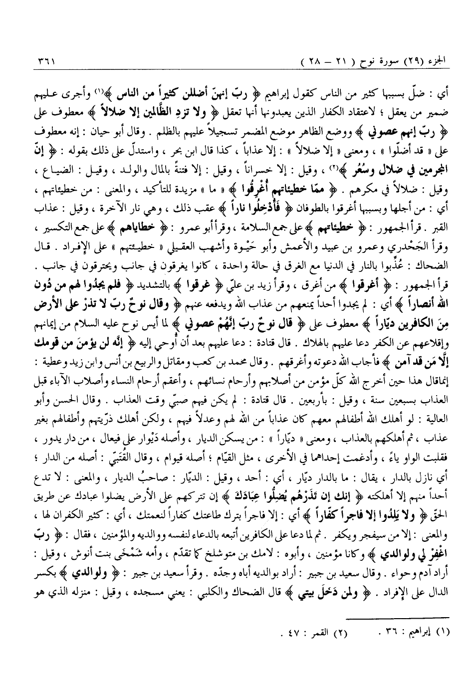 أَيْ: ضَلَّ بِسَبَبِهَا كَثِيرٌ مِنَ النَّاسِ كَقَوْلِ إِبْرَاهِيمَ رَبِّ إِنَّهُنَّ أَضْلَلْنَ كَثِيراً مِنَ النَّاسِ «1» وَأَجْرَى عَلَيْهِمْ ضَمِيرَ مَنْ يَعْقِلُ لِاعْتِقَادِ الْكُفَّارِ الَّذِينَ يَعْبُدُونَهَا أَنَّهَا تَعْقِلُ وَلا تَزِدِ الظَّالِمِينَ إِلَّا ضَلالًا مَعْطُوفٌ عَلَى رَبِّ إِنَّهُمْ عَصَوْنِي وَوَضَعَ الظَّاهِرَ مَوْضِعَ الْمُضْمَرِ تَسْجِيلًا عَلَيْهِمْ بِالظُّلْمِ. وَقَالَ أَبُو حَيَّانَ: إِنَّهُ مَعْطُوفٌ عَلَى «قَدْ أَضَلُّوا» ، وَمَعْنَى «إِلَّا ضَلَالًا» : إِلَّا عَذَابًا، كَذَا قَالَ ابْنُ بَحْرٍ، وَاسْتَدَلَّ عَلَى ذَلِكَ بِقَوْلِهِ: إِنَّ الْمُجْرِمِينَ فِي ضَلالٍ وَسُعُرٍ «2» ، وَقِيلَ: إِلَّا خُسْرَانًا، وَقِيلَ: إِلَّا فِتْنَةً بِالْمَالِ وَالْوَلَدِ، وَقِيلَ: الضَّيَاعُ، وَقِيلَ: ضَلَالًا فِي مَكْرِهِمْ. مِمَّا خَطِيئاتِهِمْ أُغْرِقُوا «مَا» مَزِيدَةٌ لِلتَّأْكِيدِ، وَالْمَعْنَى: مِنْ خَطِيئَاتِهِمْ، أَيْ: مِنْ أَجْلِهَا وَبِسَبَبِهَا أُغْرِقُوا بِالطُّوفَانِ فَأُدْخِلُوا نَارًا عَقِبَ ذَلِكَ، وَهِيَ نَارُ الْآخِرَةِ، وَقِيلَ: عَذَابُ الْقَبْرِ. قَرَأَ الْجُمْهُورُ: خَطِيئاتِهِمْ عَلَى جَمْعِ السَّلَامَةِ، وَقَرَأَ أَبُو عَمْرٍو: خَطاياهُمْ عَلَى جَمْعِ التَّكْسِيرِ، وَقَرَأَ الْجَحْدَرِيُّ وَعَمْرُو بْنُ عُبَيْدٍ وَالْأَعْمَشُ وَأَبُو حَيْوَةَ وَأَشْهَبُ الْعُقَيْلِيُّ «خَطِيئَتِهِمْ» عَلَى الْإِفْرَادِ. قَالَ الضَّحَّاكُ: عُذِّبُوا بِالنَّارِ فِي الدُّنْيَا مَعَ الْغَرَقِ فِي حَالَةٍ وَاحِدَةٍ، كَانُوا يَغْرَقُونَ فِي جَانَبٍ وَيَحْتَرِقُونَ فِي جَانِبٍ.