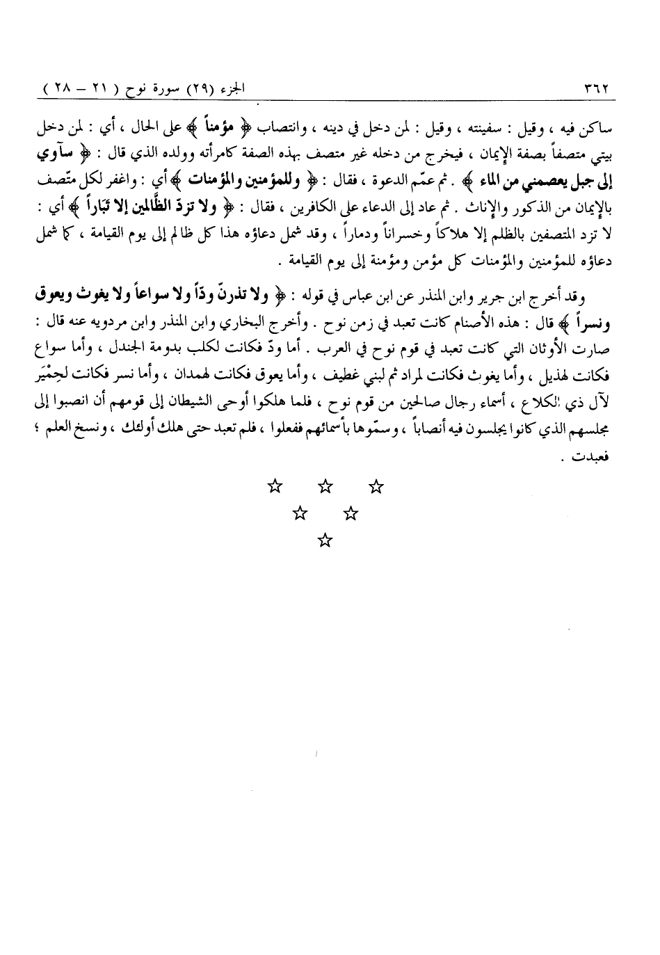 صَارَتِ الْأَوْثَانُ الَّتِي كَانَتْ تُعْبَدُ فِي قَوْمِ نُوحٍ فِي الْعَرَبِ. أَمَّا وَدٌّ فَكَانَتْ لِكَلْبٍ بِدَوْمَةِ الْجَنْدَلِ، وَأَمَّا سُوَاعٌ فَكَانَتْ لِهُذَيْلٍ، وَأَمَّا يَغُوثُ فَكَانَتْ لِمُرَادٍ ثُمَّ لَبَنِي غُطَيْفٍ، وَأَمَّا يَعُوقُ فَكَانَتْ لِهَمْدَانَ، وَأَمَّا نَسْرٌ فَكَانَتْ لِحِمْيَرَ لِآلِ ذِي الْكَلَاعِ، أَسْمَاءُ رِجَالٍ صَالِحِينَ مِنْ قَوْمِ نُوحٍ، فَلَمَّا هَلَكُوا أَوْحَى الشَّيْطَانُ إِلَى قَوْمِهِمْ أَنِ انْصِبُوا إِلَى مَجْلِسِهِمُ الَّذِي كَانُوا يَجْلِسُونَ فِيهِ أَنْصَابًا، وَسَمُّوهَا بِأَسْمَائِهِمْ فَفَعَلُوا، فَلَمْ تُعْبَدْ حَتَّى هَلَكَ أُولَئِكَ، وَنُسِخَ الْعِلْمُ فَعُبِدَتْ.